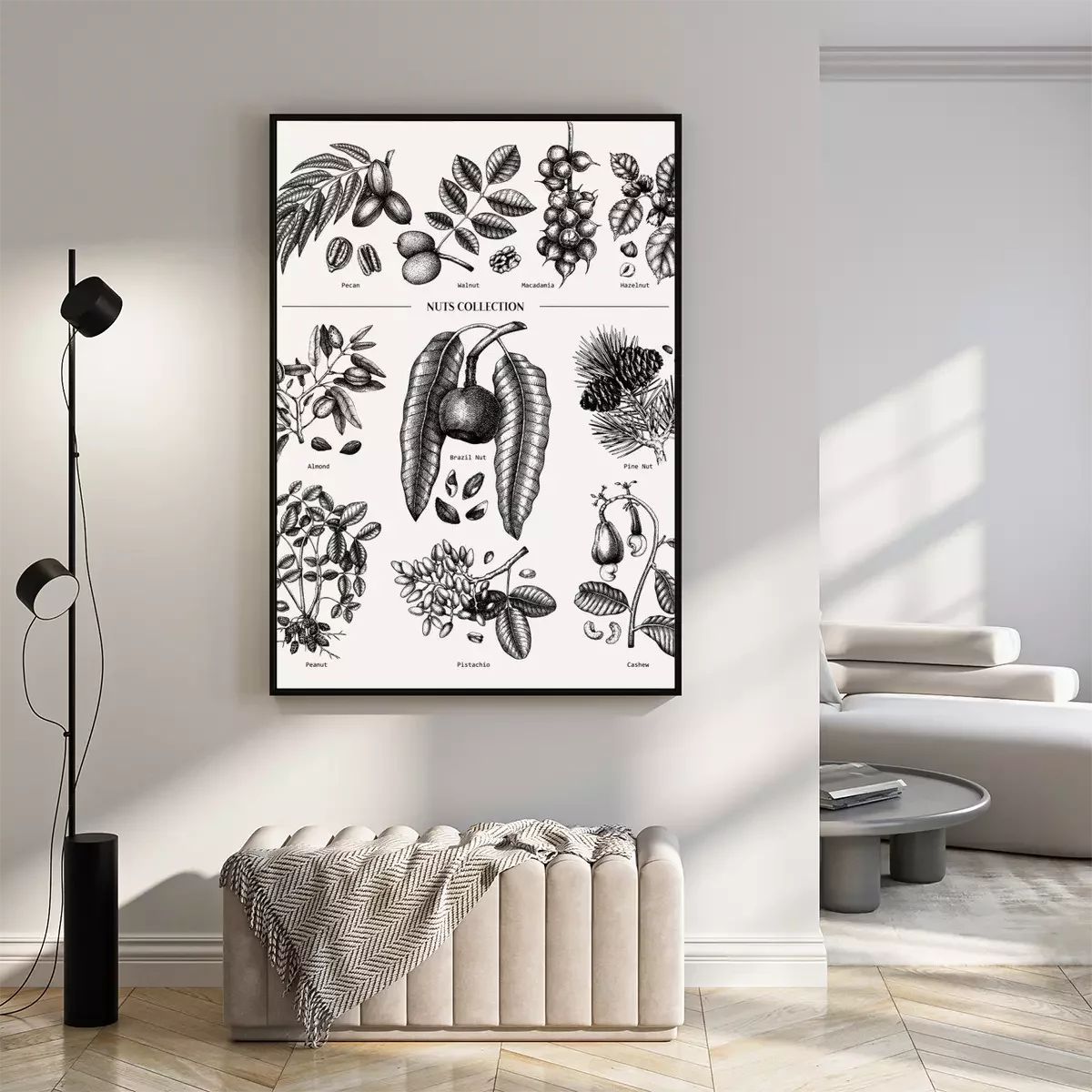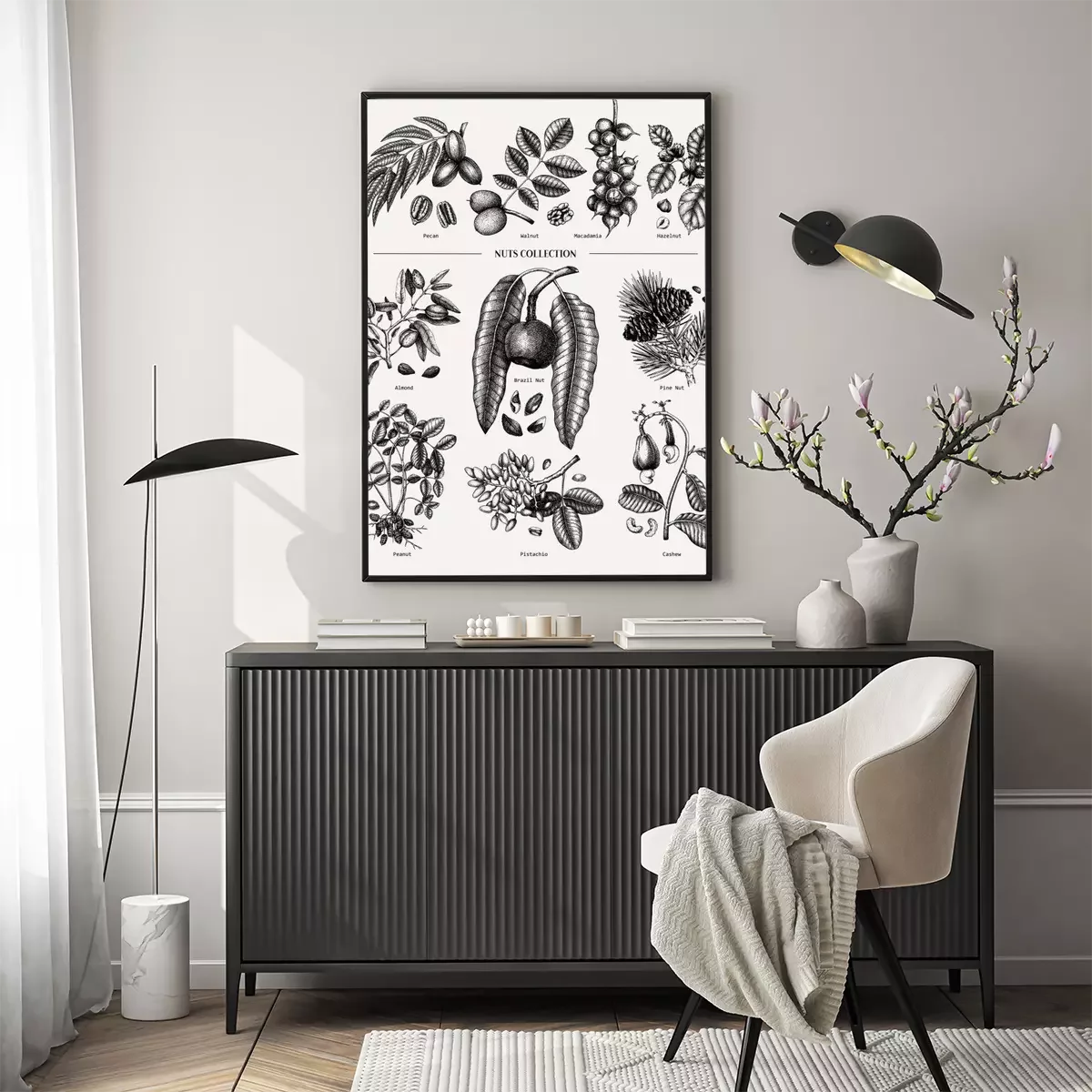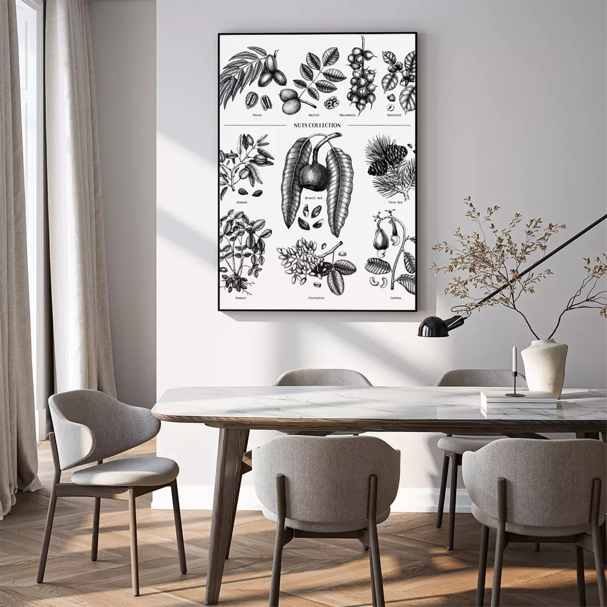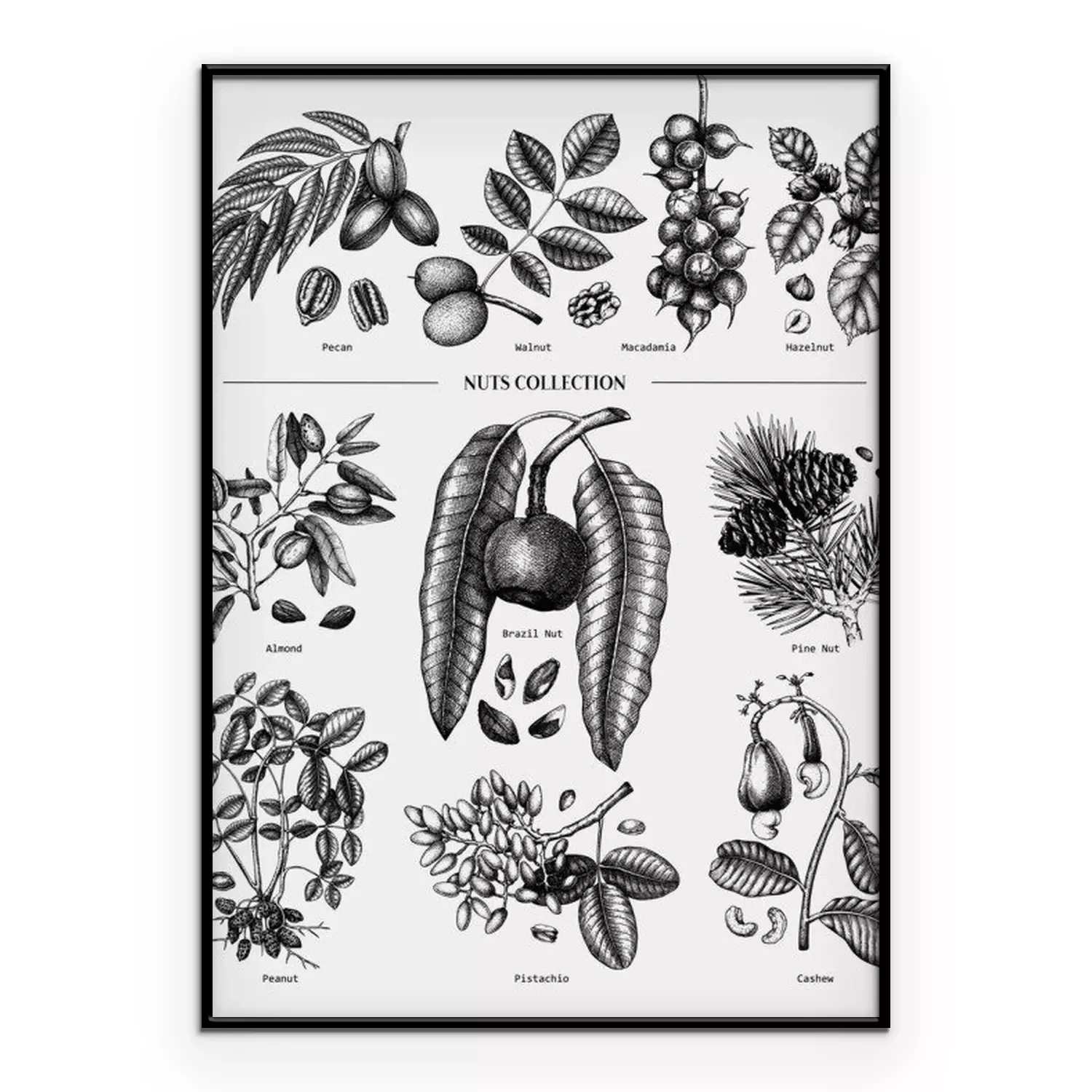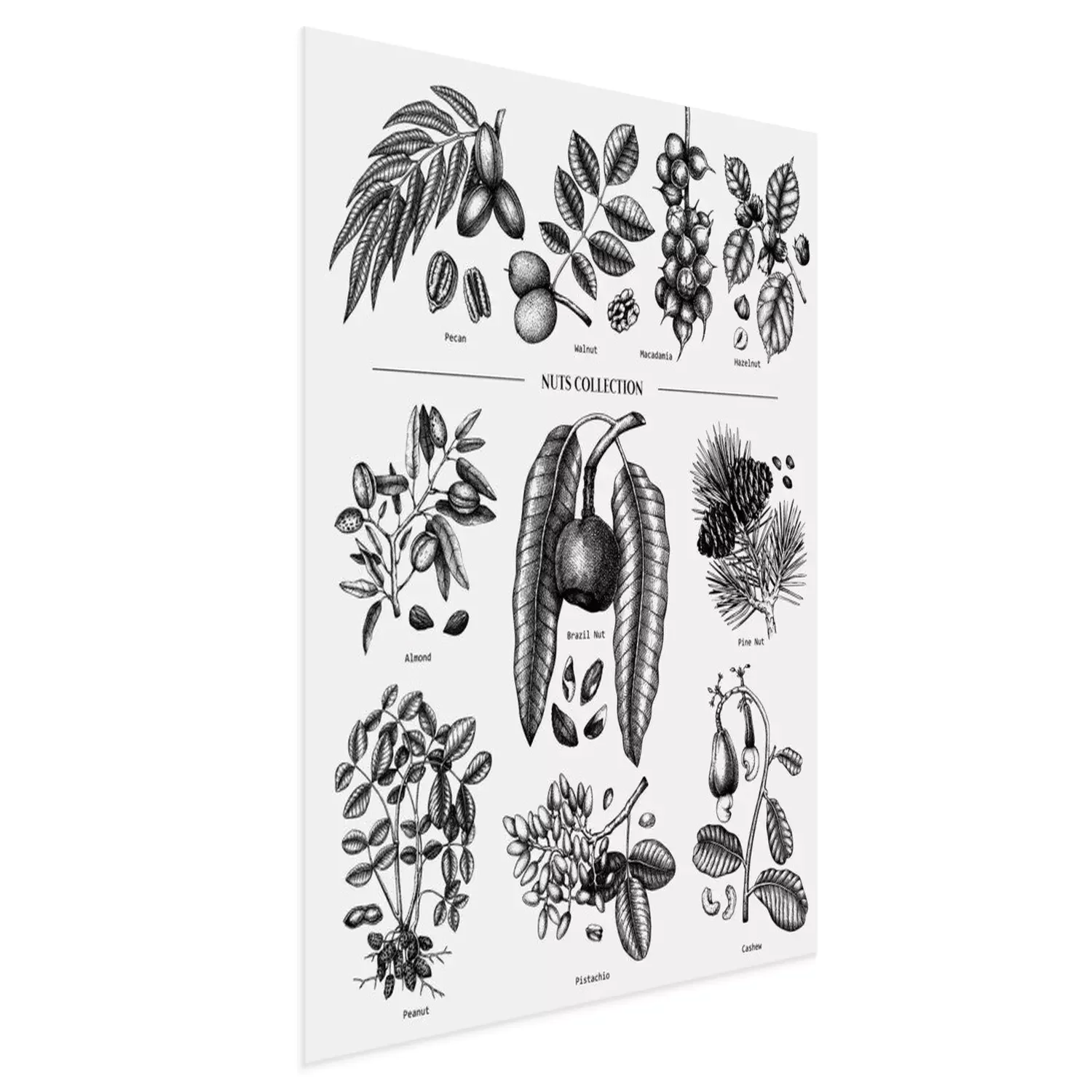 Poster: Hand drawn nut trees and plants collection. Botanical elements set. With branches, nuts, fruits, leaves, conifers and cones sketches. Culinary nuts vector illustrations. Healthy food drawings.
