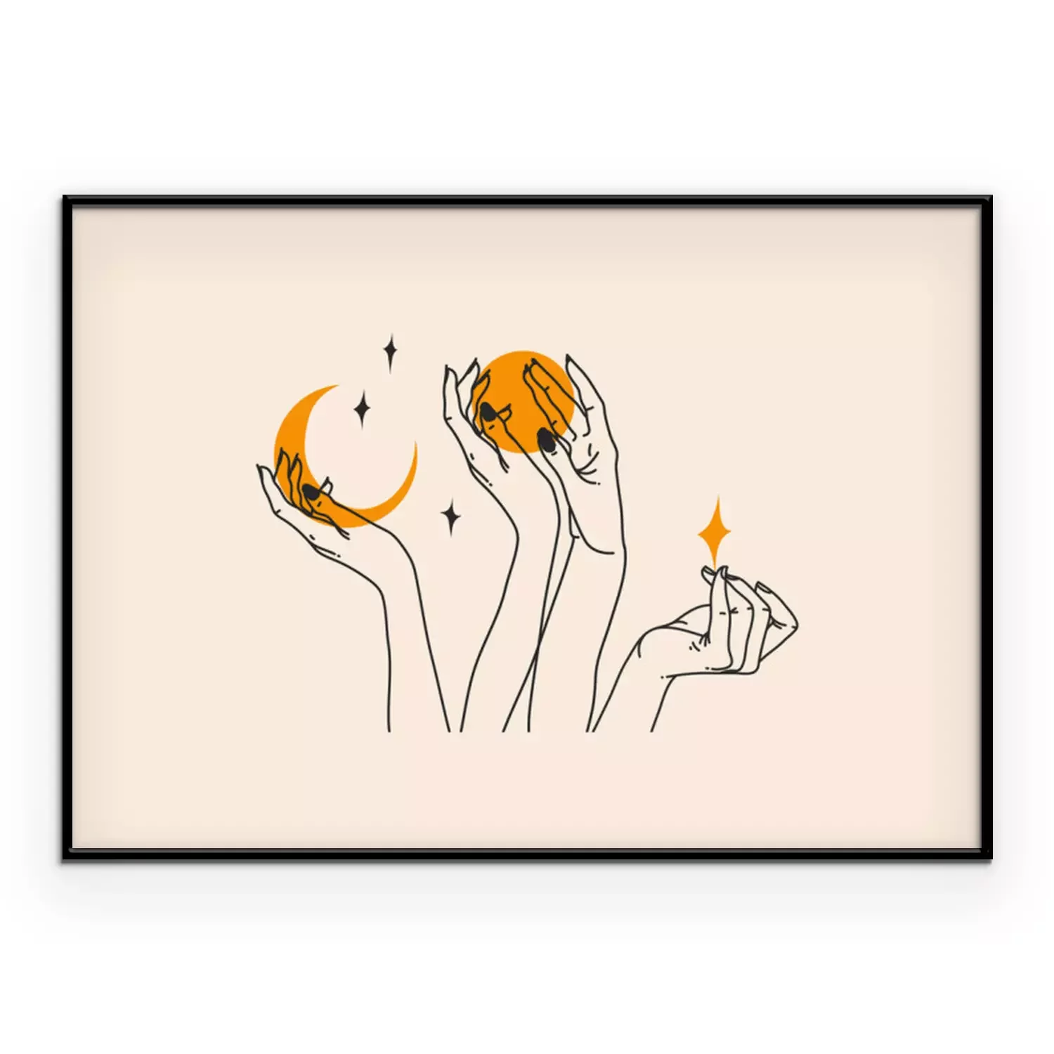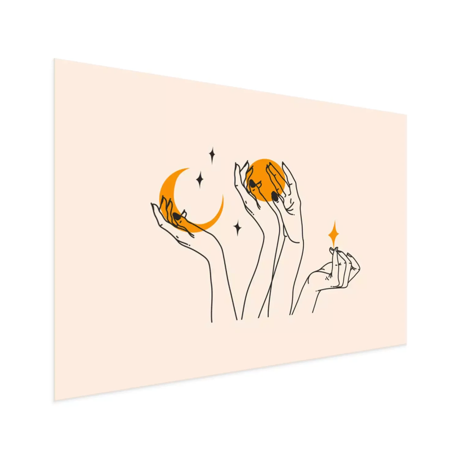 Poster: Hand drawn vector abstract stock flat graphic illustration with logo elements ,woman fashion magic line art hands touch moonand stars in simple style for branding ,isolated on white background