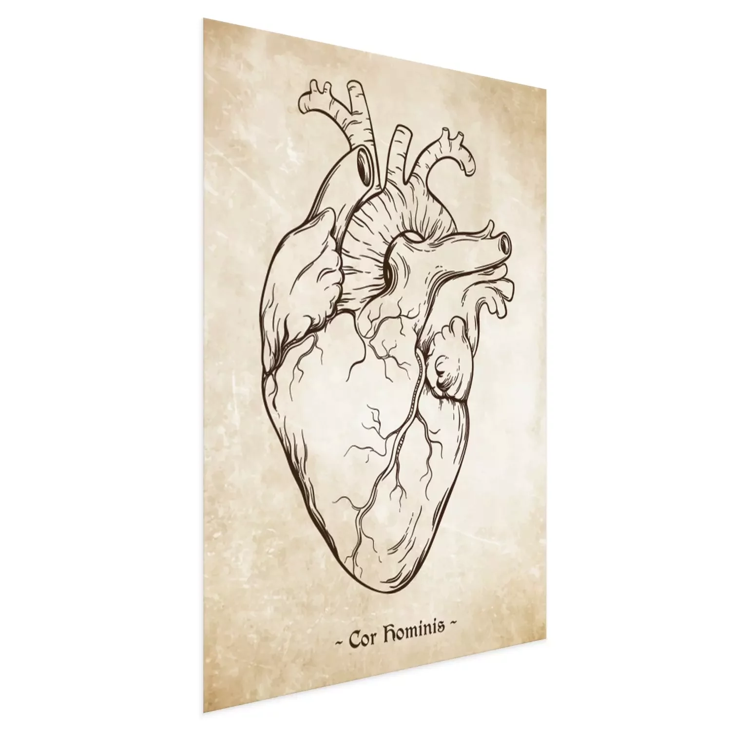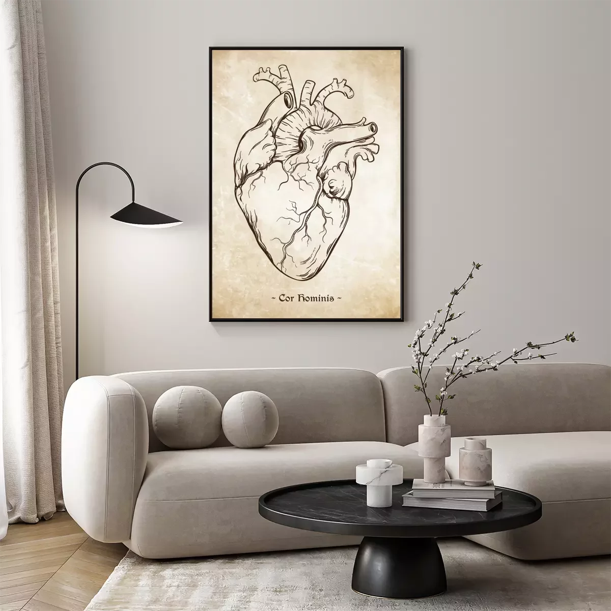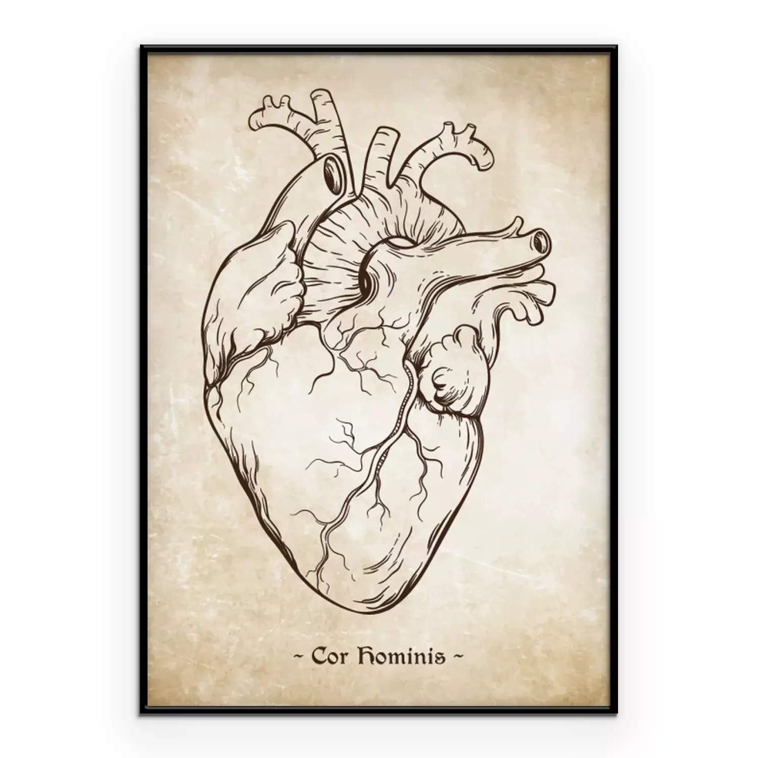 Poster: Hand getrokken lijn art anatomisch correcte menselijk hart. Da Vinci schetst stijl over grunge oud papier achtergrond. Vintage tattoo ontwerp vector illustratie. Enscription is Latijnse term "menselij