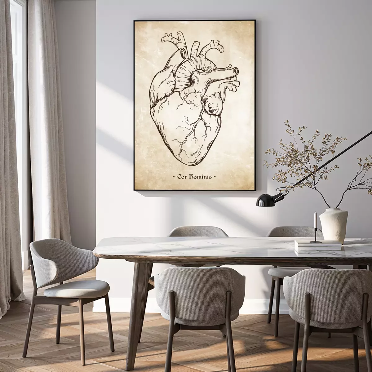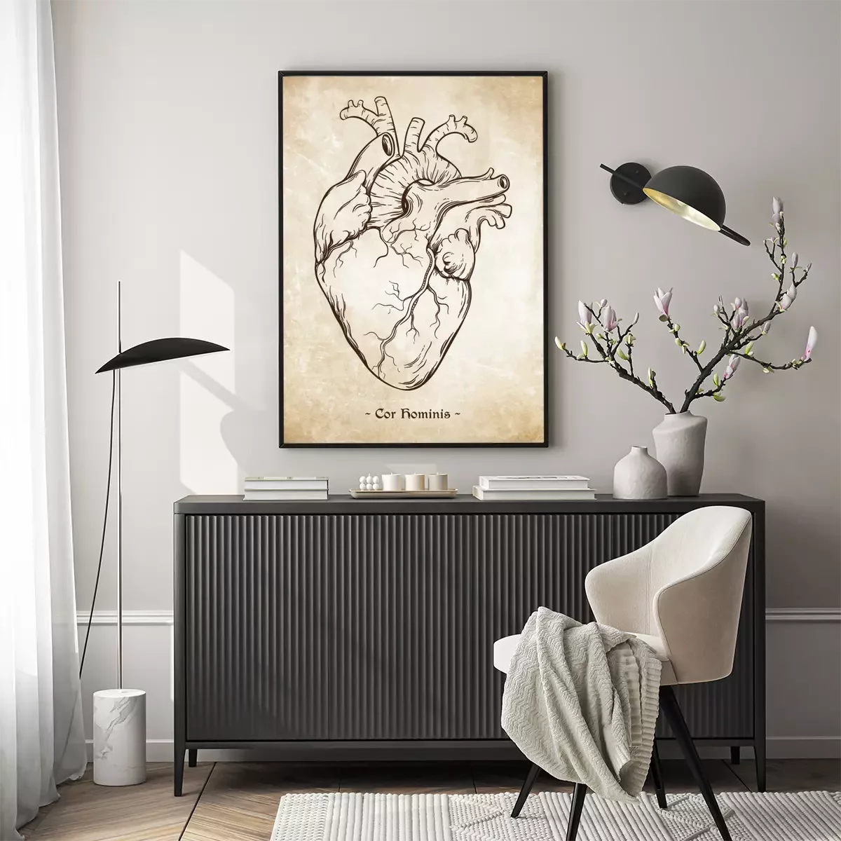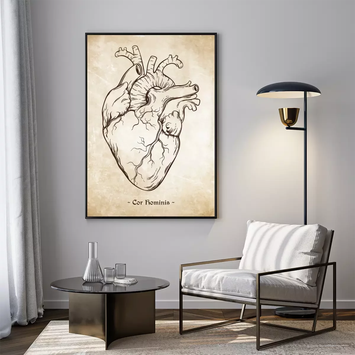 Poster: Hand getrokken lijn art anatomisch correcte menselijk hart. Da Vinci schetst stijl over grunge oud papier achtergrond. Vintage tattoo ontwerp vector illustratie. Enscription is Latijnse term "menselij