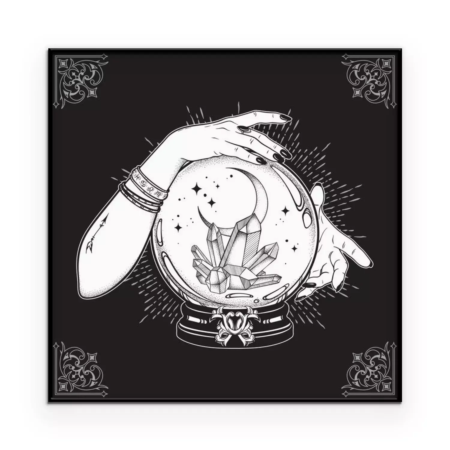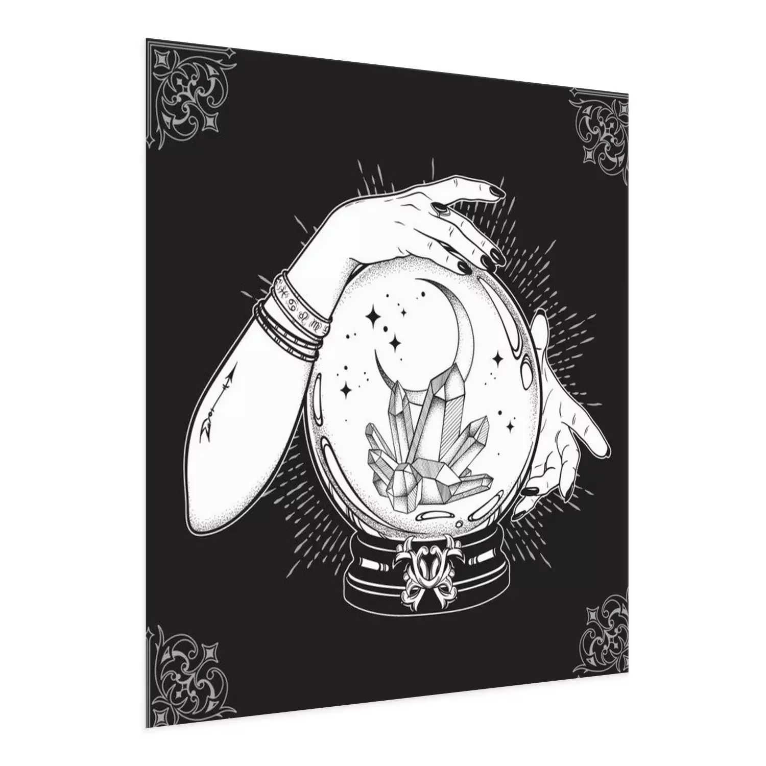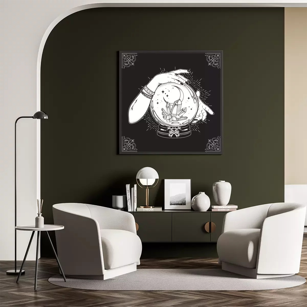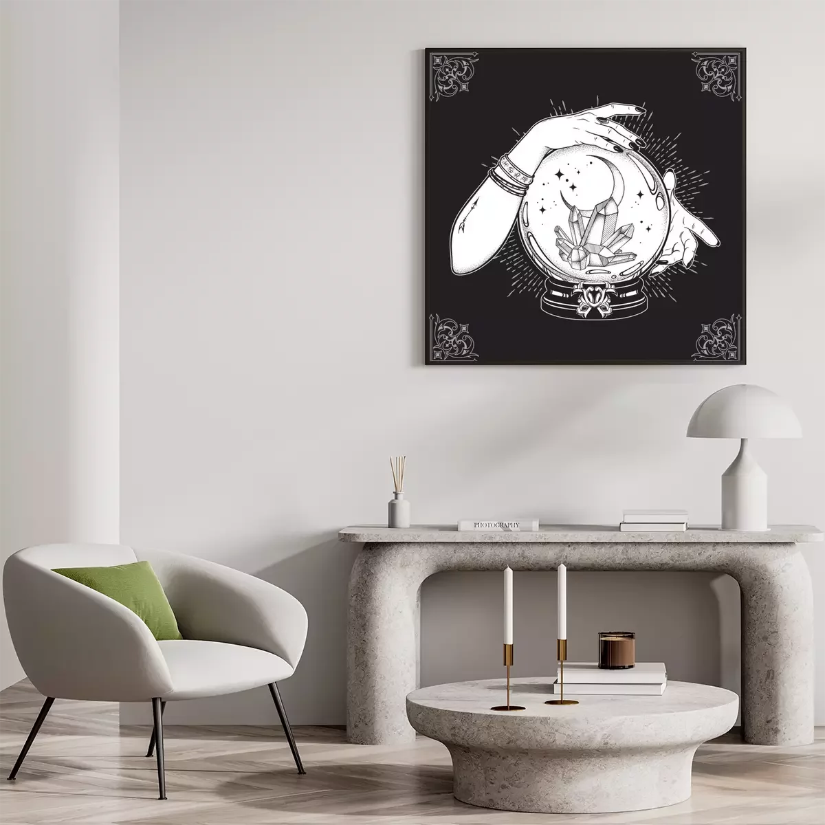 Poster: Hand getrokken magische kristallen bol met edelstenen en maansikkel in handen van fortune teller lijntekeningen en punt werk. Boho chic tattoo, poster, tapijtwerk of altaar sluier afdrukken ontwerp ve