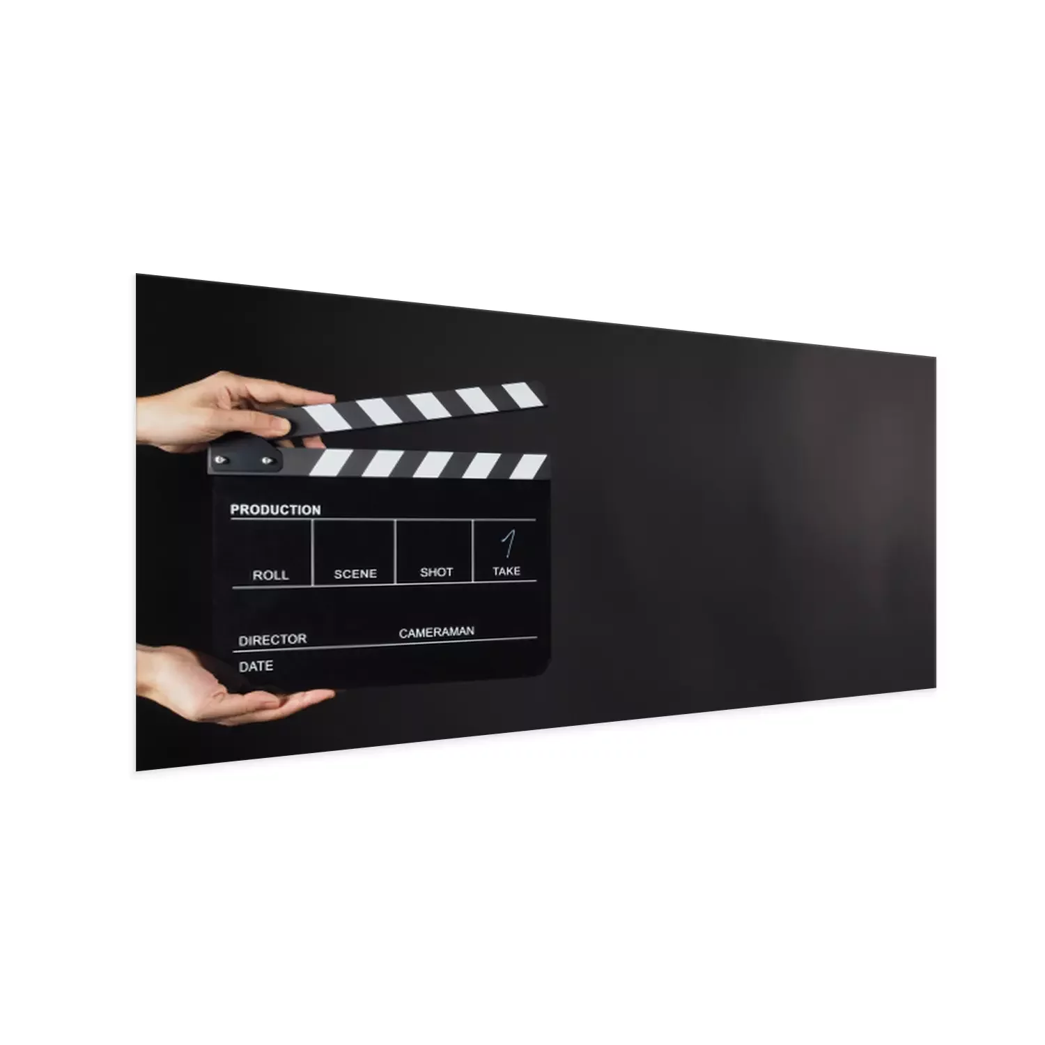 Poster Hand is holding Black clap board or movie slate  use in video production , movie ,film, cinema industry on black background.It have write in number.