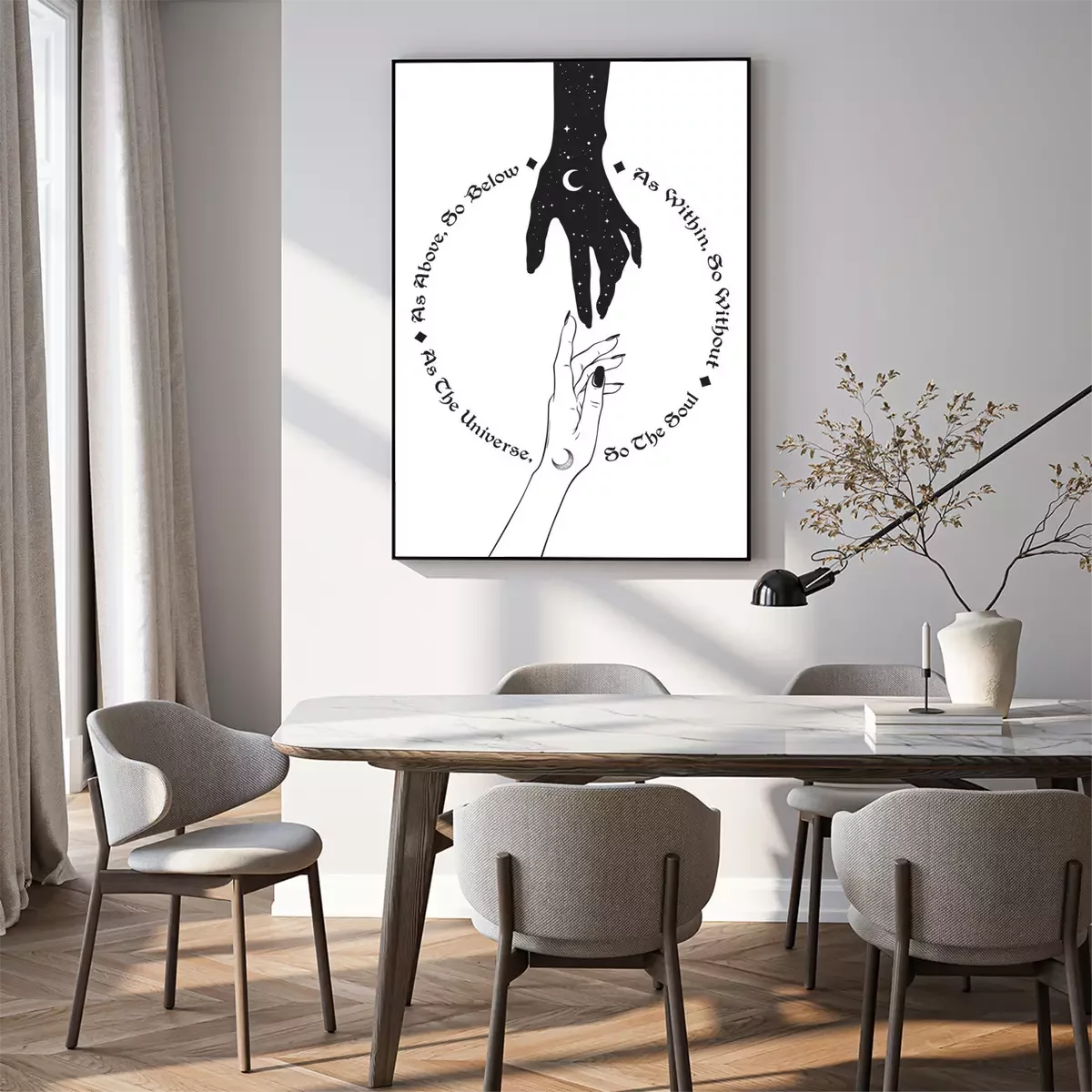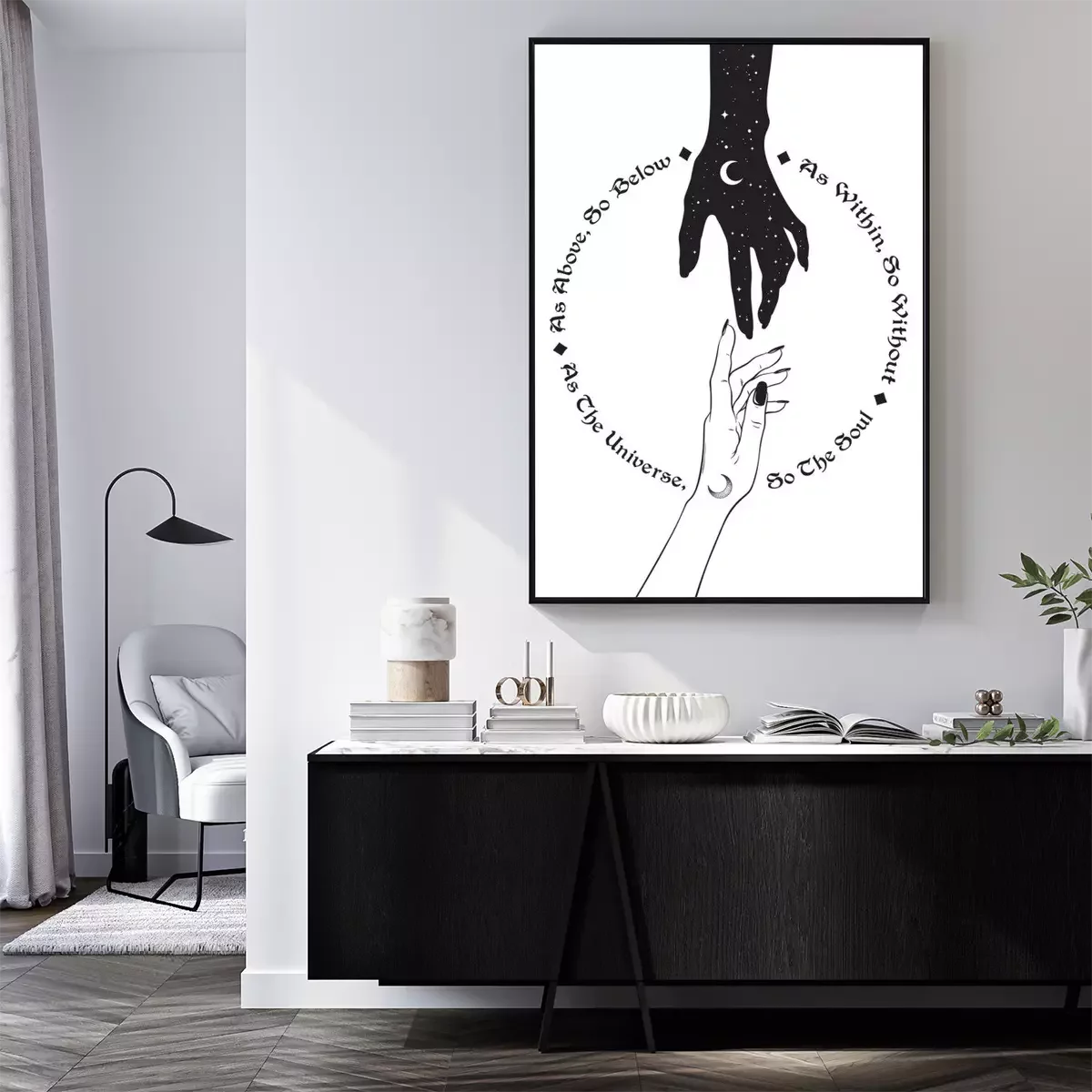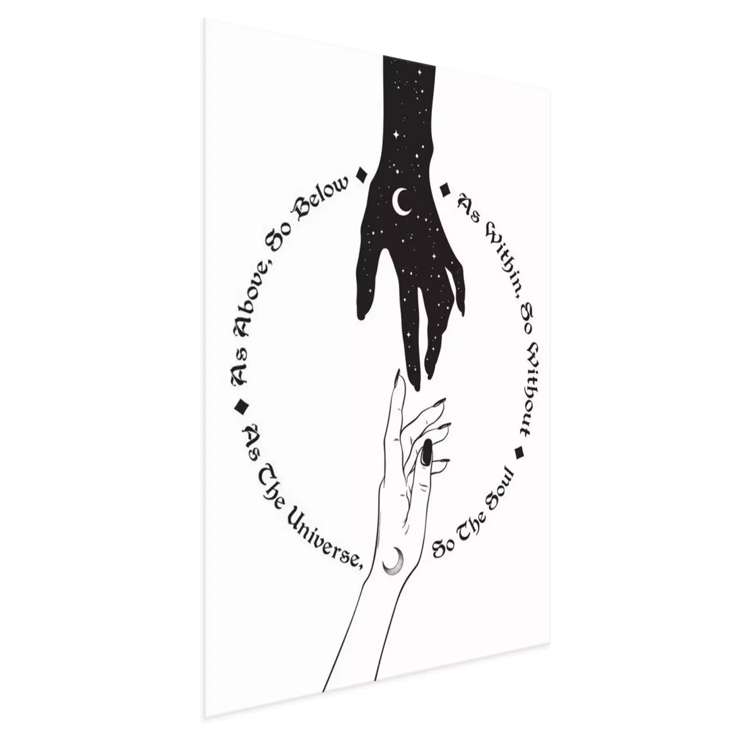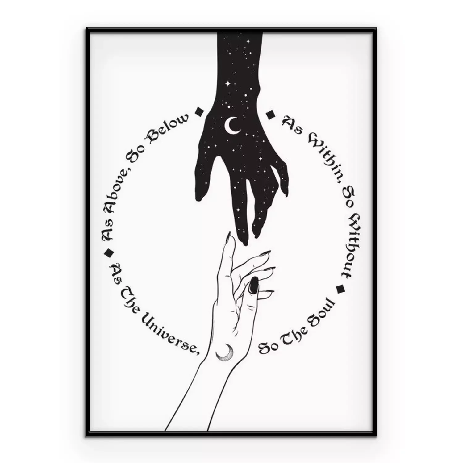 Poster Hand van universum reiken naar menselijke hand. Inscriptie is een stelregel in hermeticisme en heilige geometrie. Zo boven zo beneden. Zwart werk, flash tattoo of print ontwerp vectorillustratie