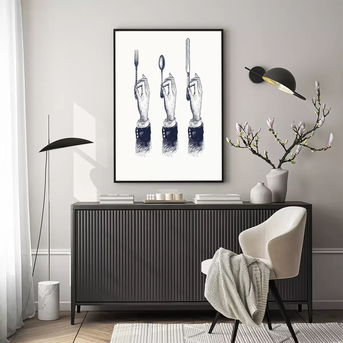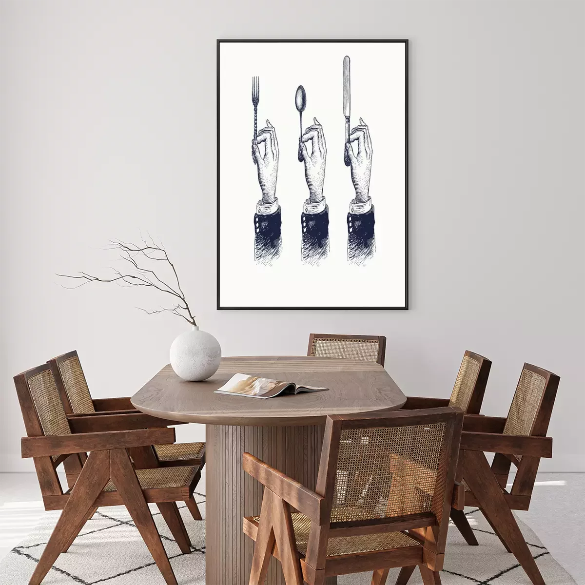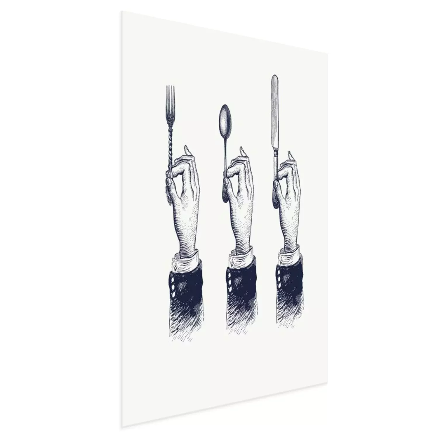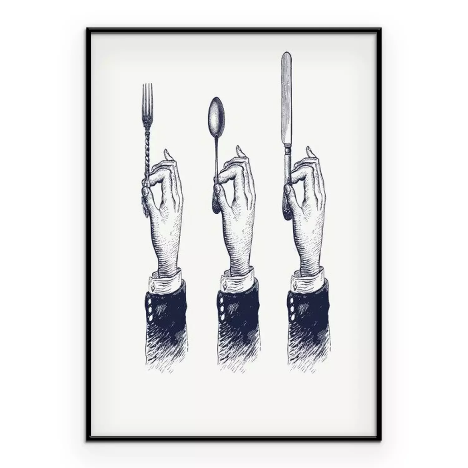 Poster Handen met bestekjes, bakje met cloche, alcoholdrankje. Lepel, vork en mes. Glas, schot, wijnglas met potables Vintage gestileerde tekening. Vector illustratie in een retro houtsnede stijl