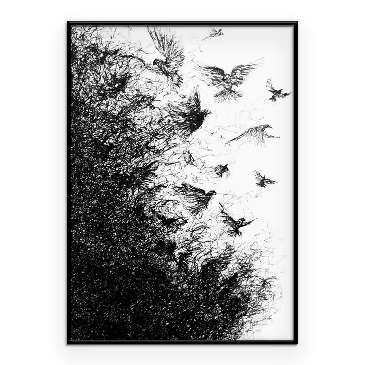 Poster: Handmade symbolic pen drawing of birds disintegrating from a group to individuals and into particles