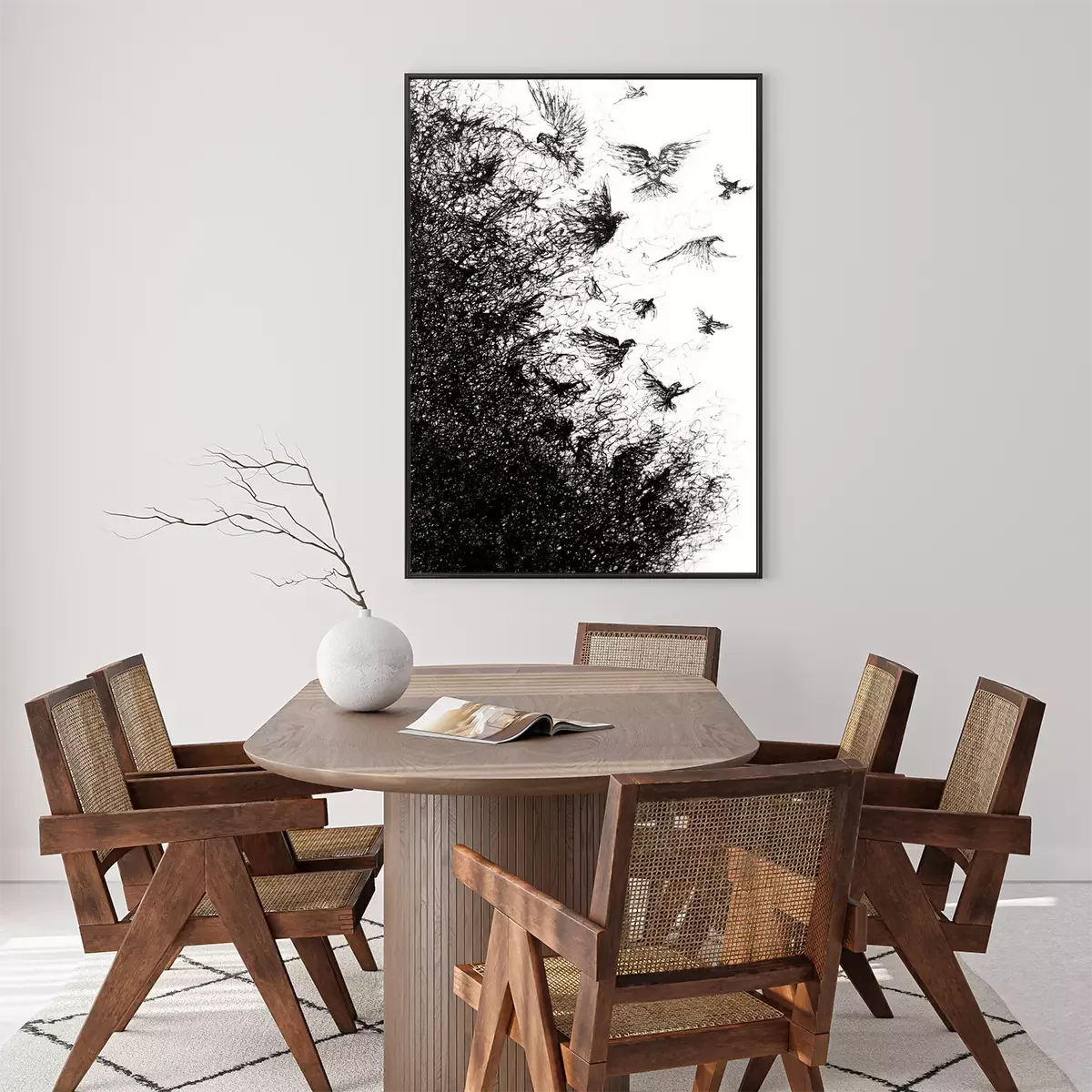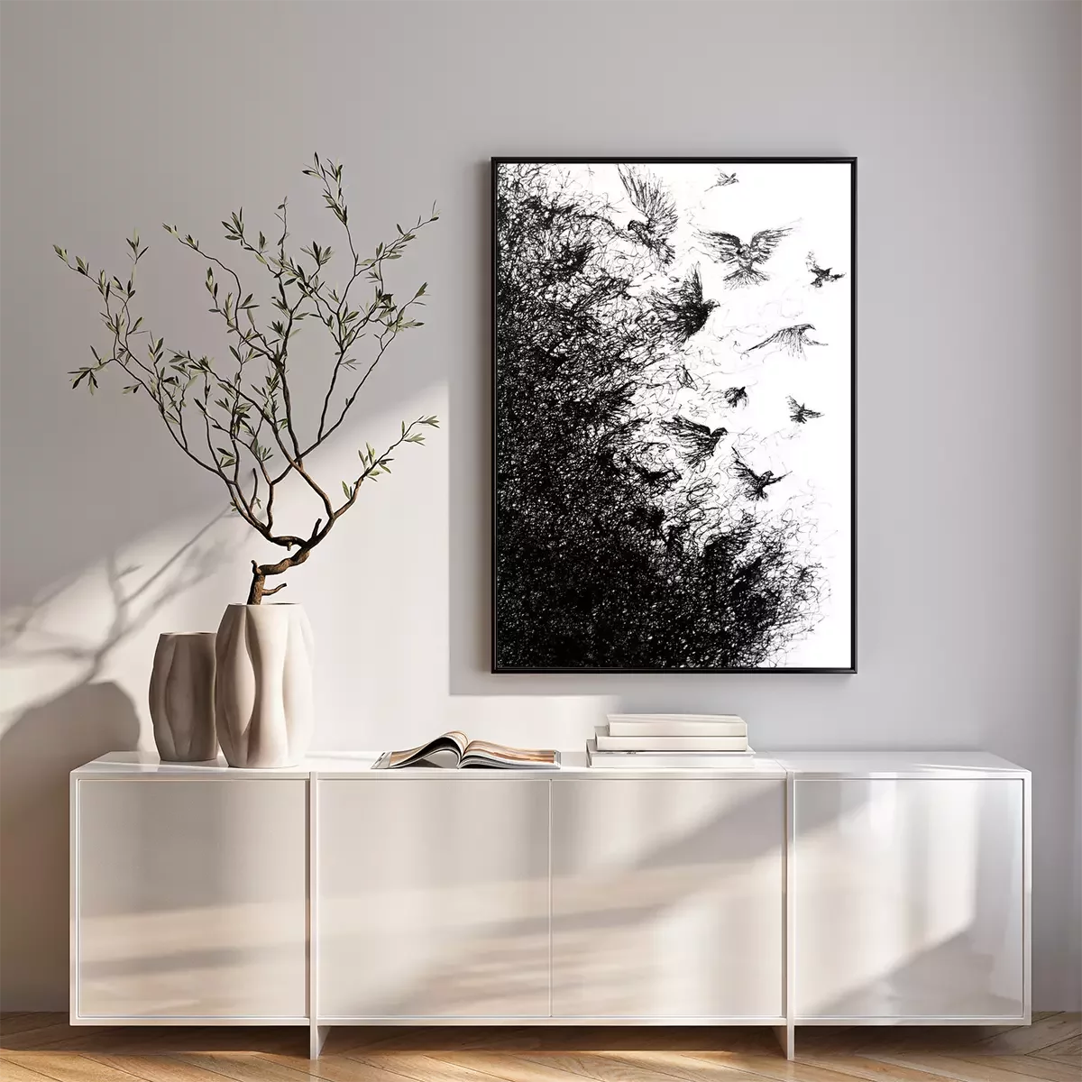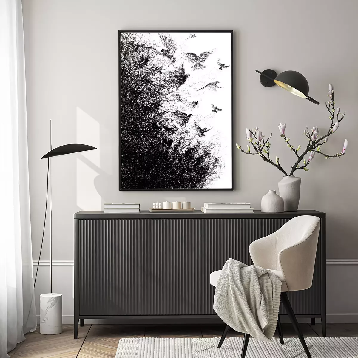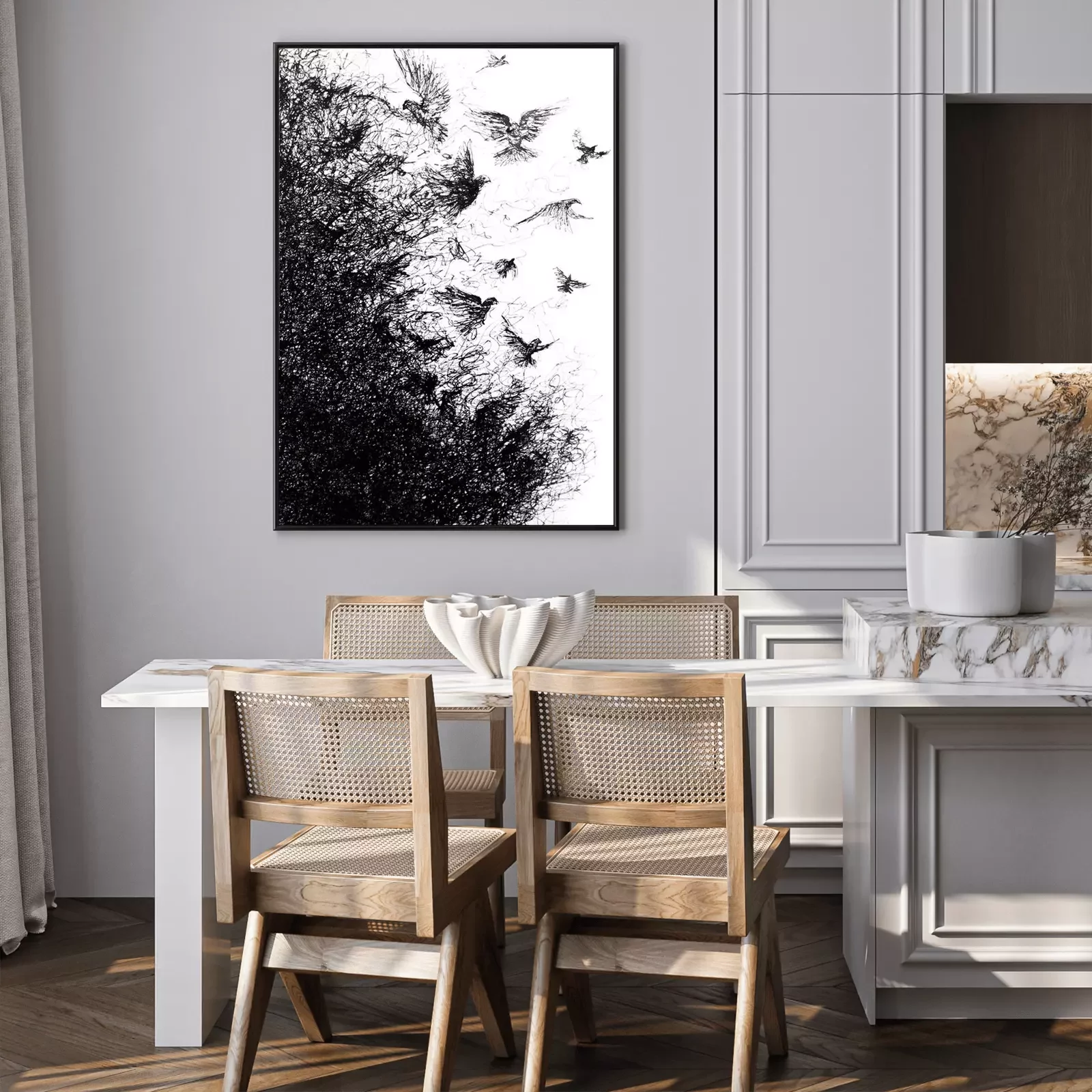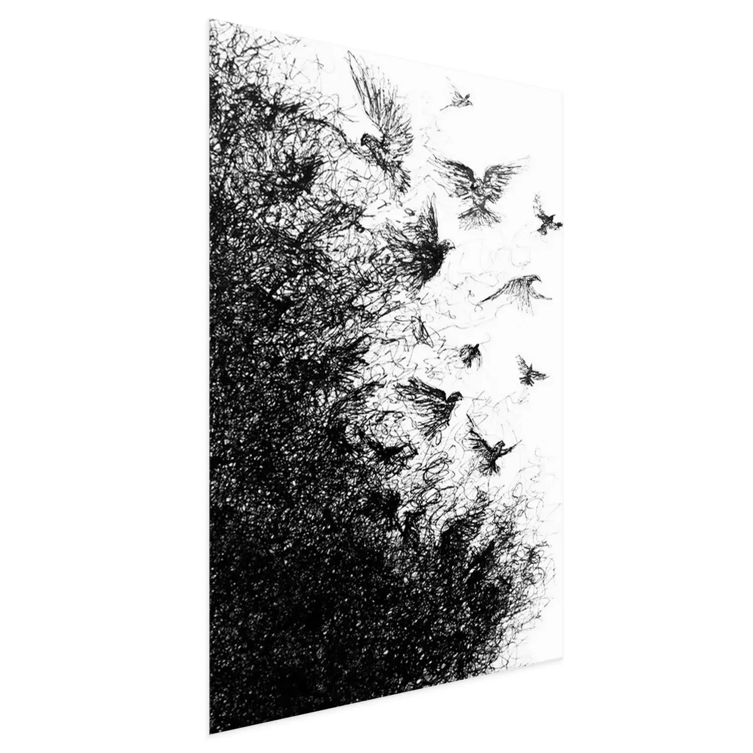 Poster Handmade symbolic pen drawing of birds disintegrating from a group to individuals and into particles