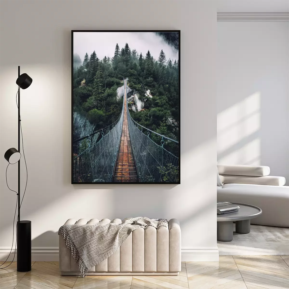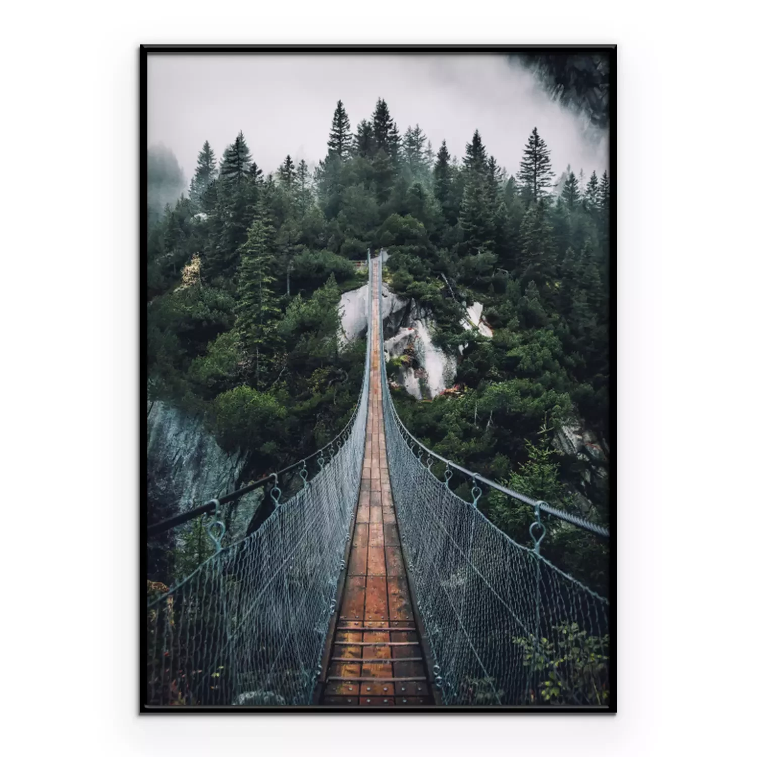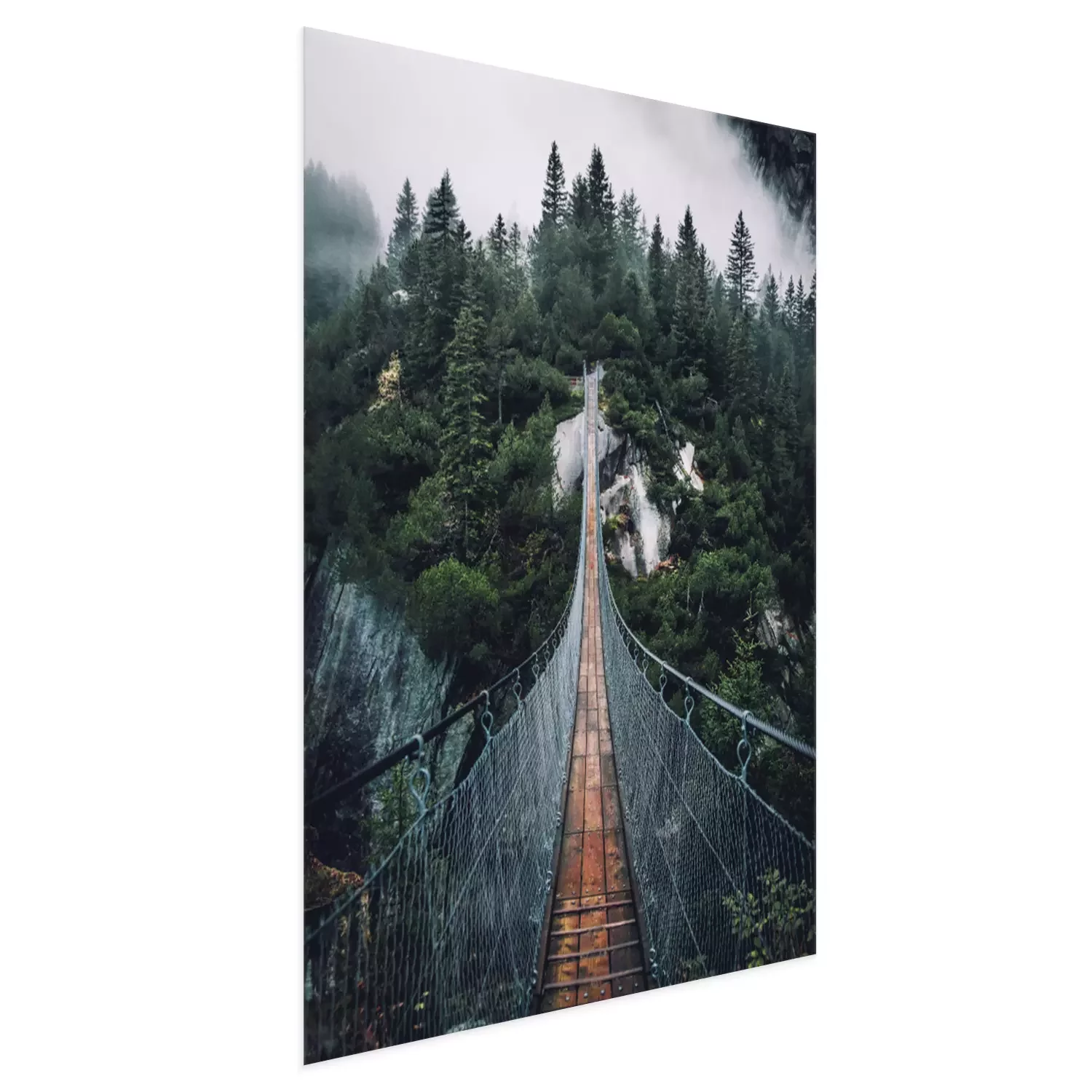 Poster: Hangbrug over een mistig bos