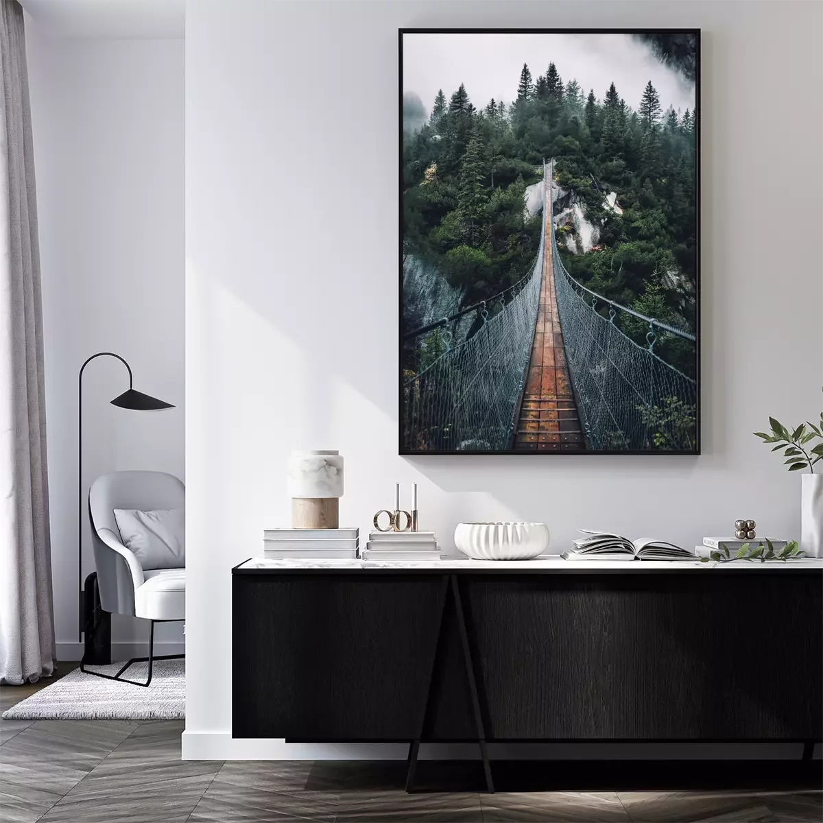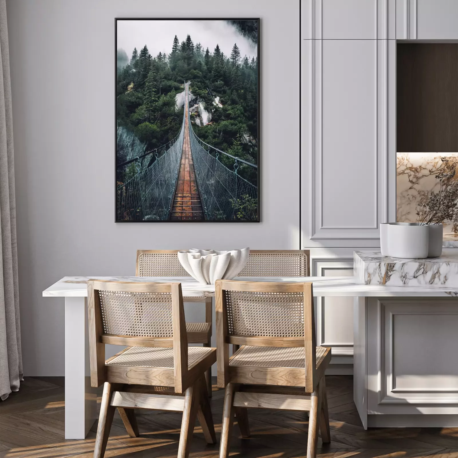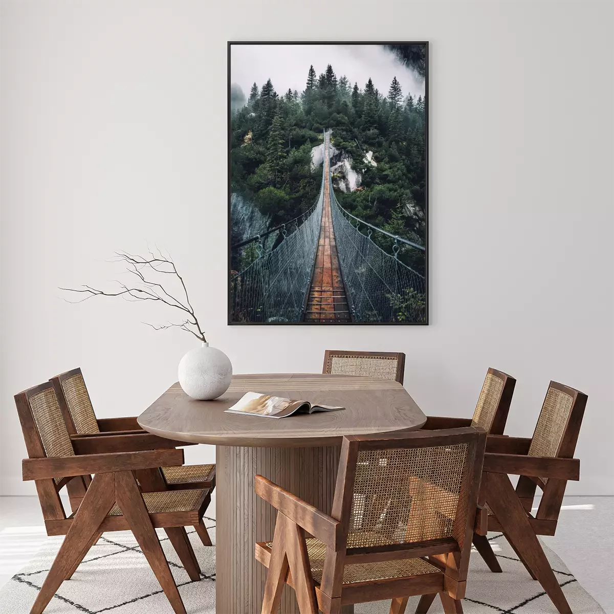 Poster: Hangbrug over een mistig bos