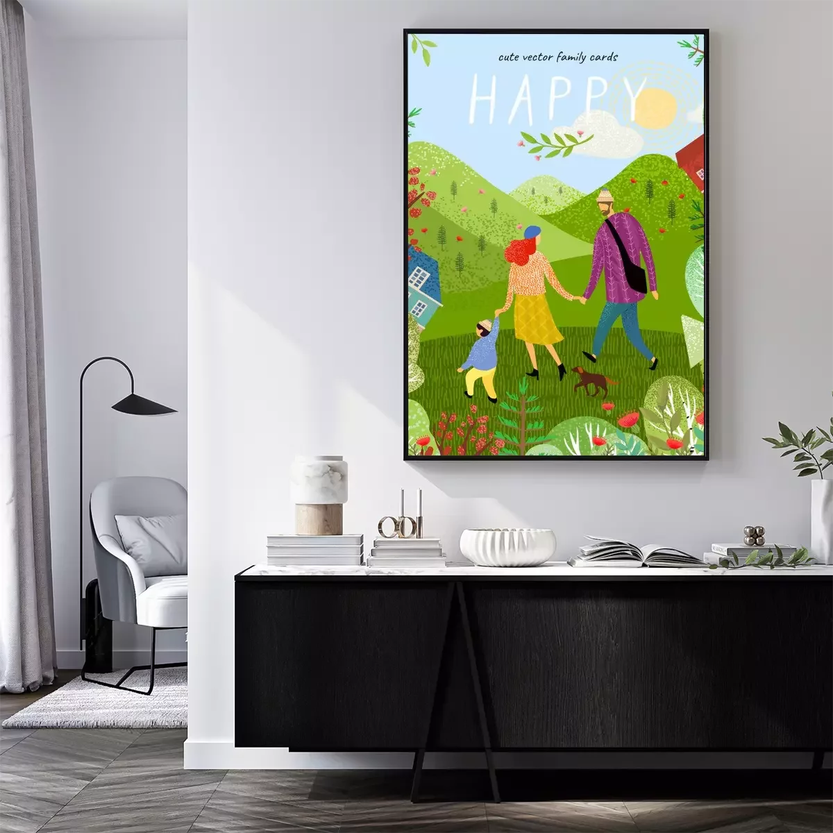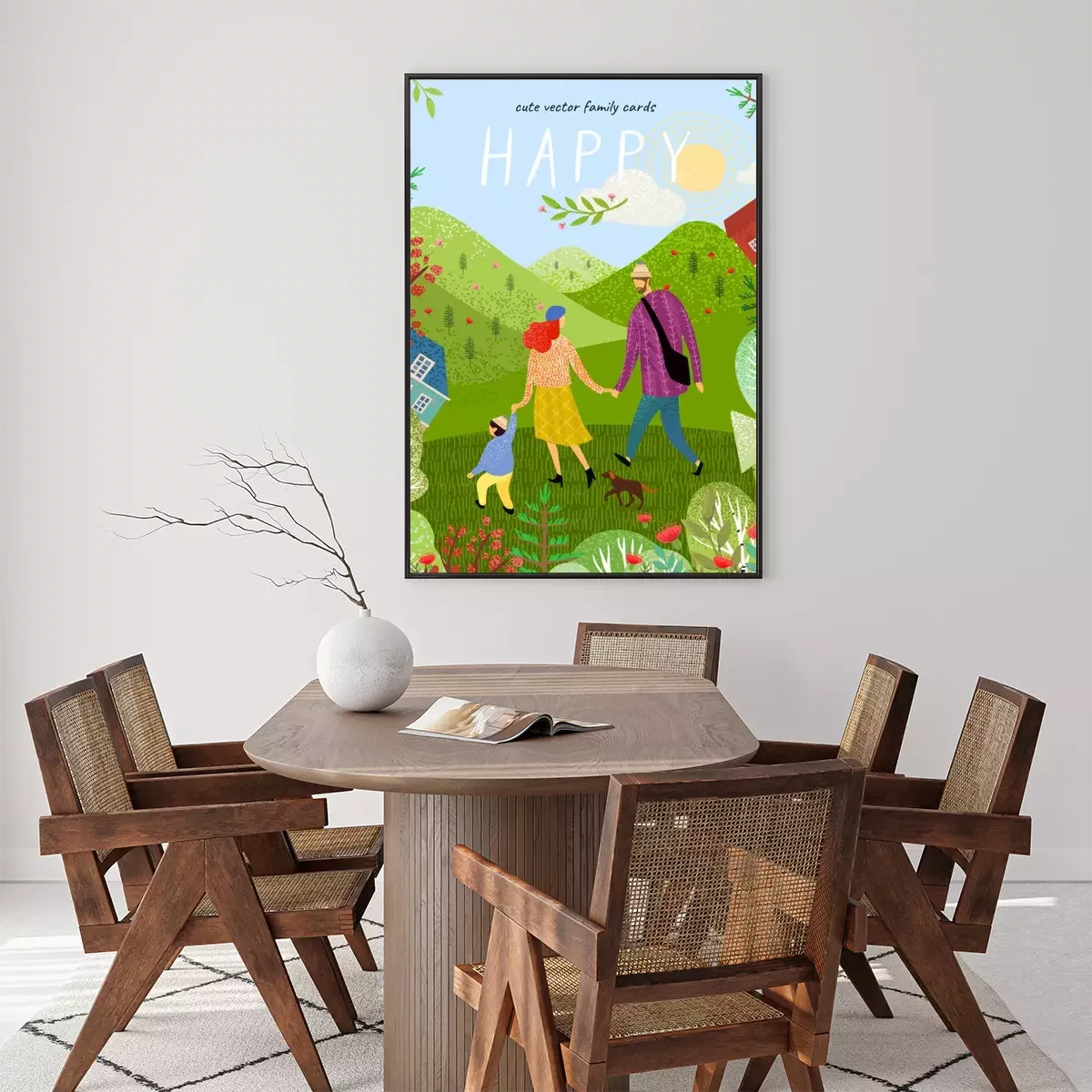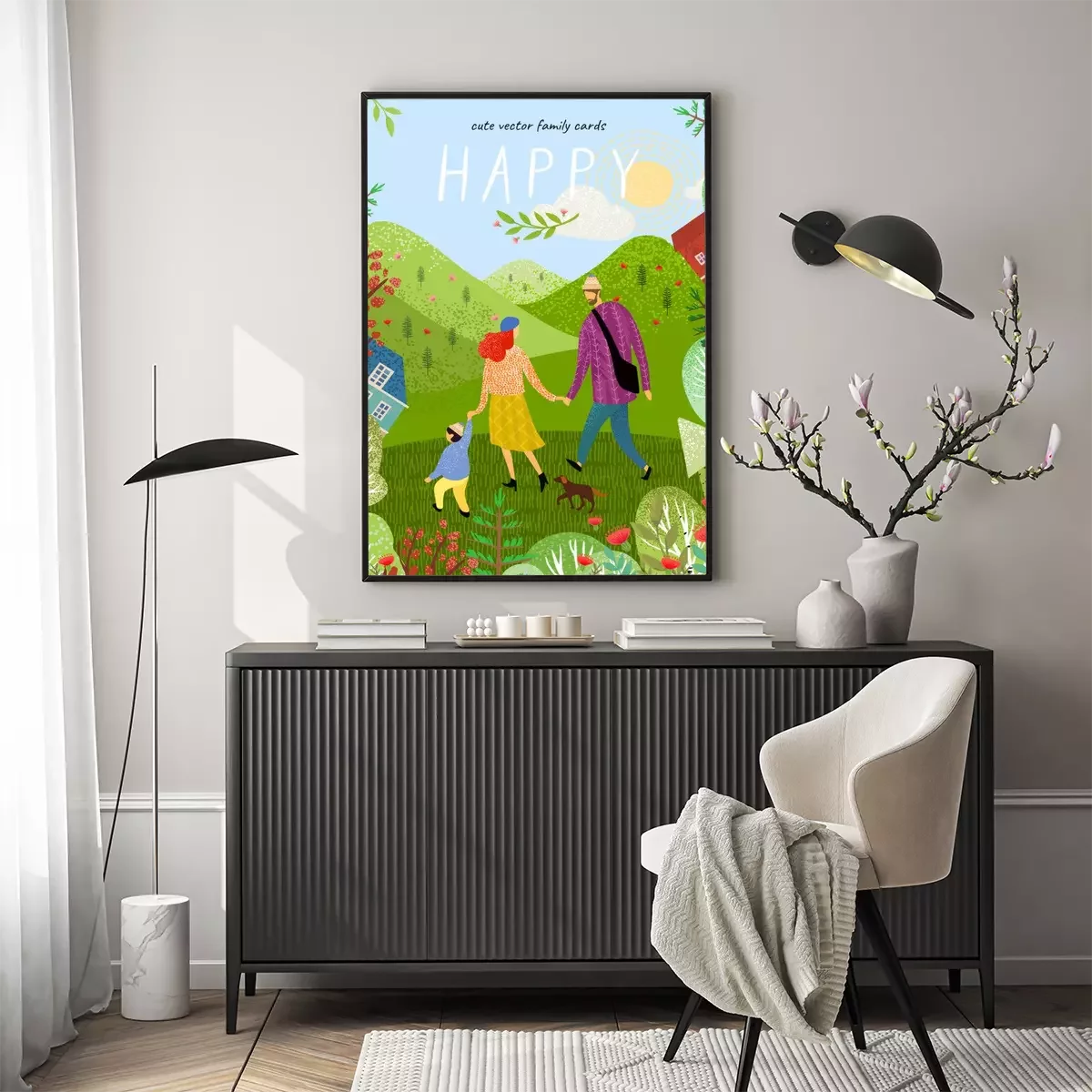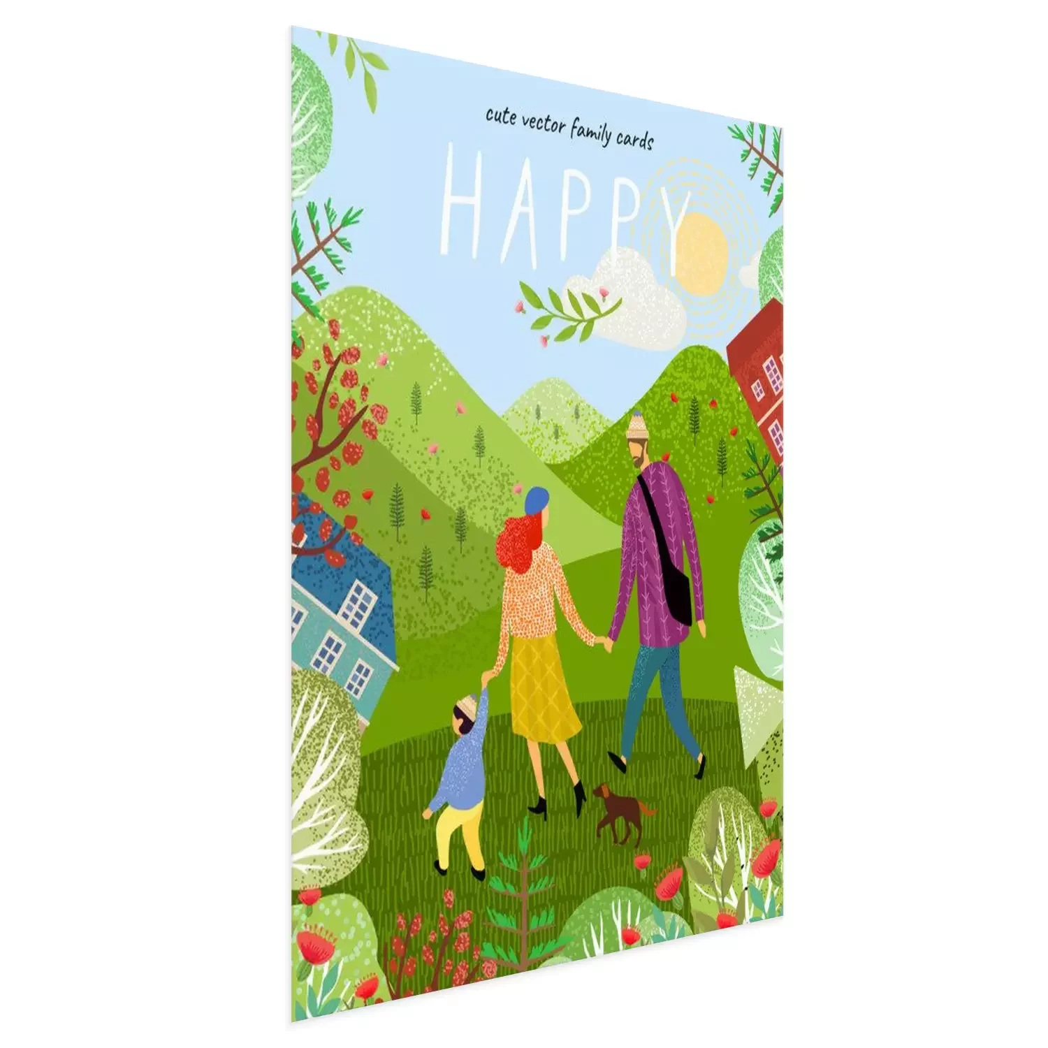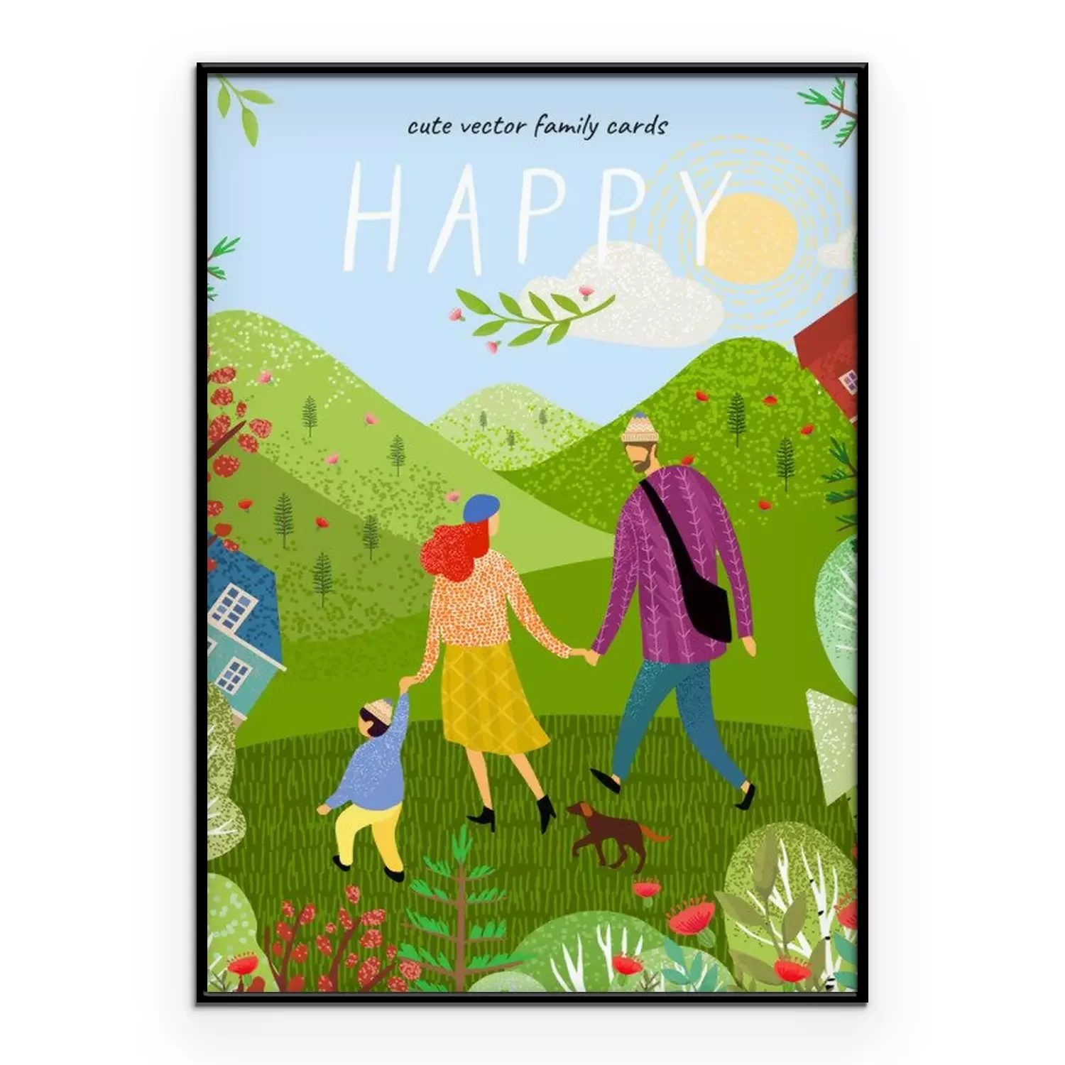 Poster happy family. Cute vector poster, card or cover with an illustration of a father, mother and newborn baby on a background of green nature, mountains and forest landscape with flowers