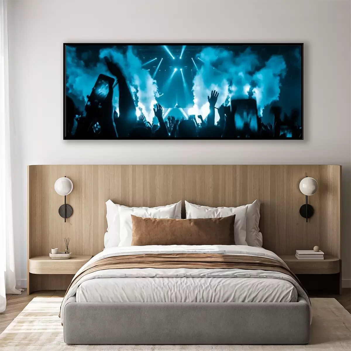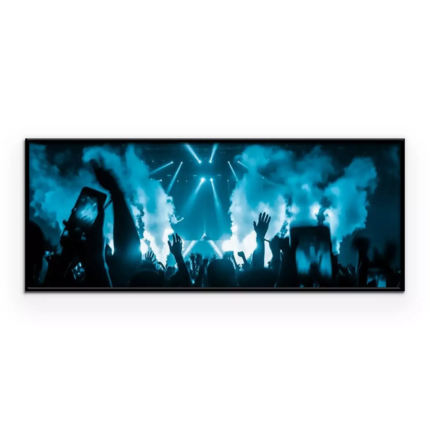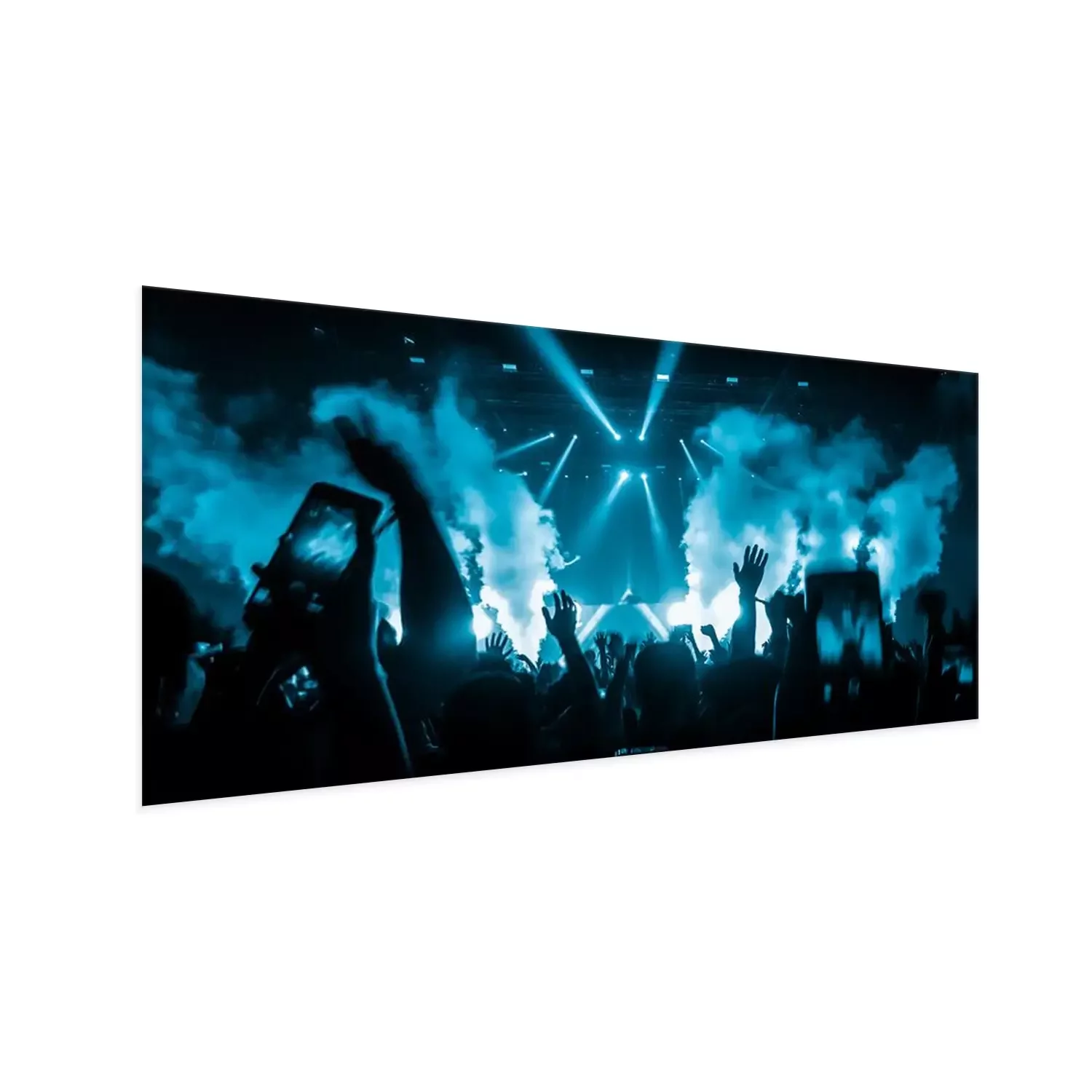 Poster Happy people dance in nightclub DJ party concert and listen to electronic dancing music from DJ on the stage. Silhouette cheerful crowd celebrate New Year party 2020. People lifestyle DJ nightlife.