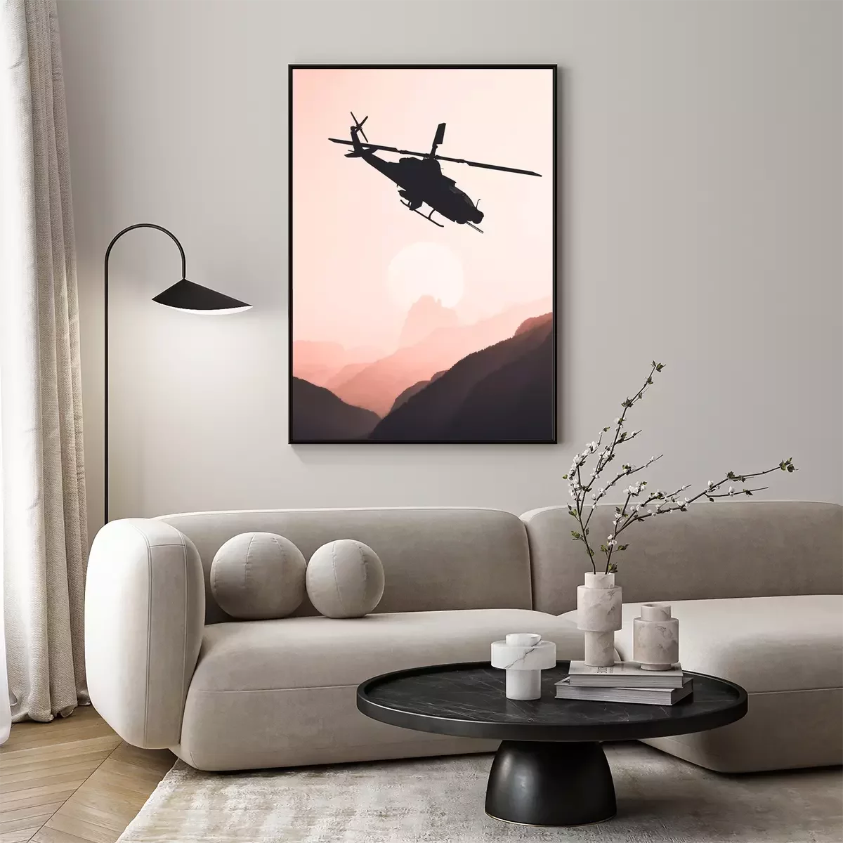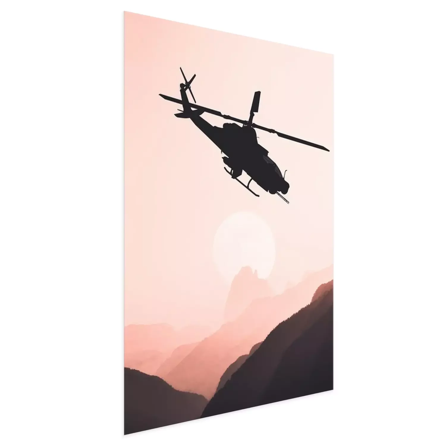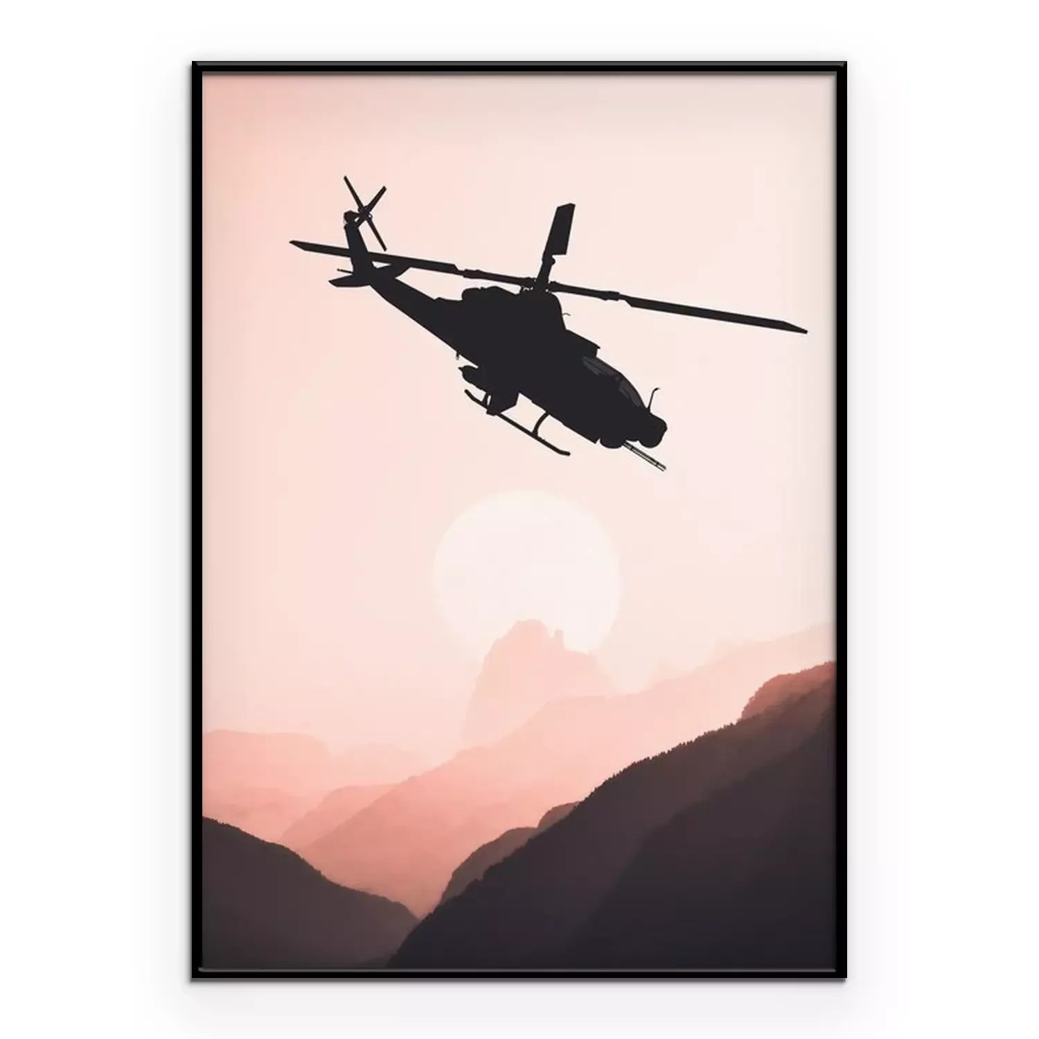 Poster: Helikopter in vlucht op een roze hemelachtergrond