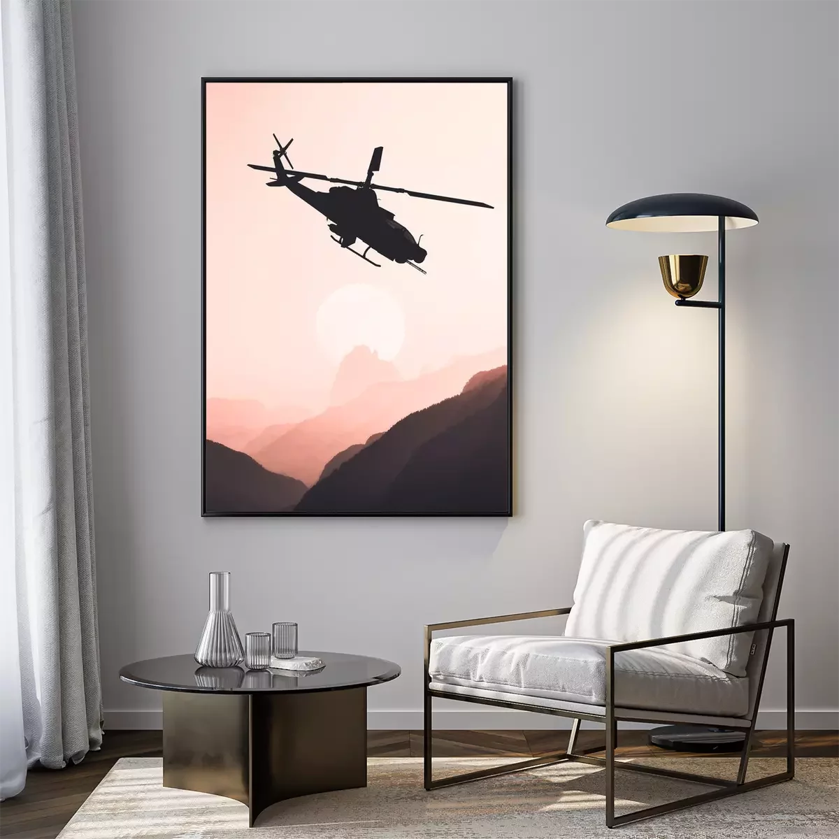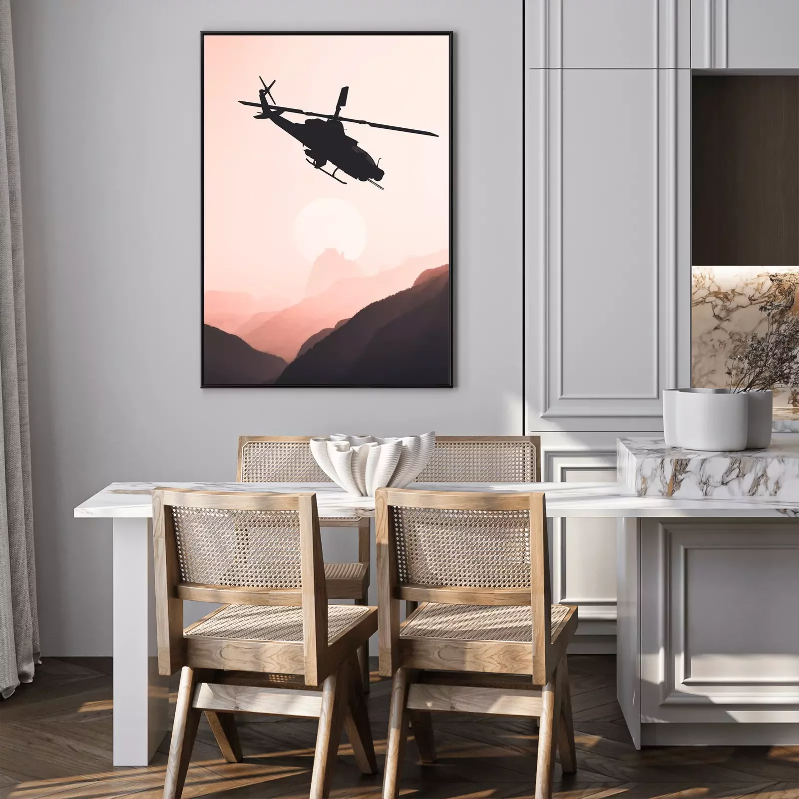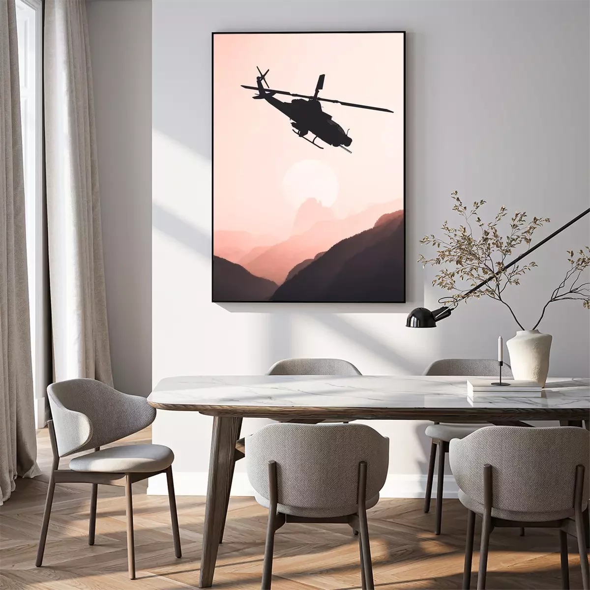 Poster: Helikopter in vlucht op een roze hemelachtergrond