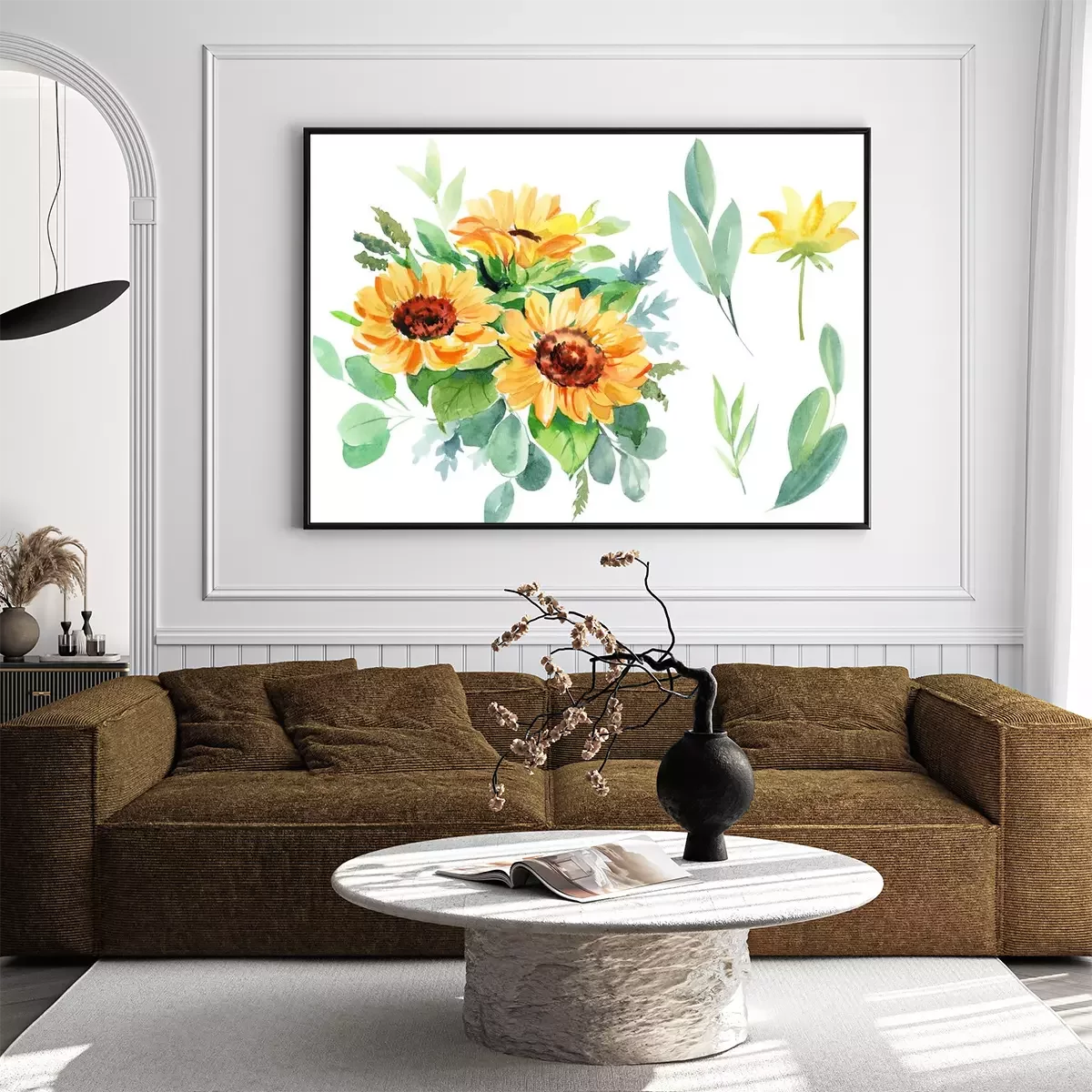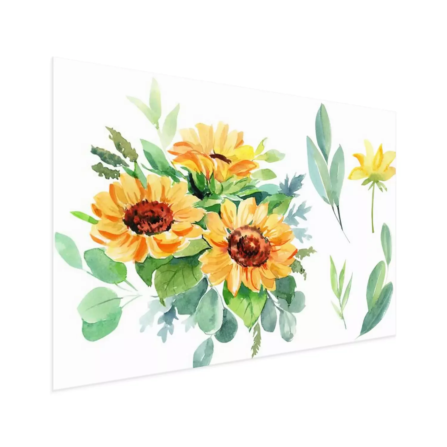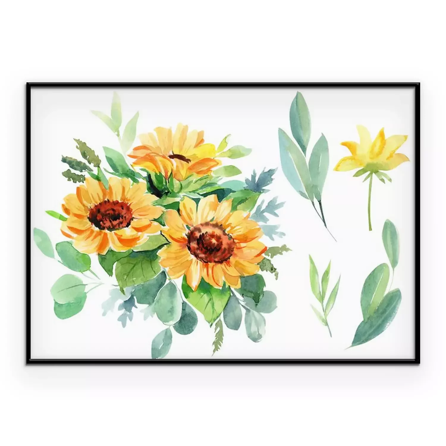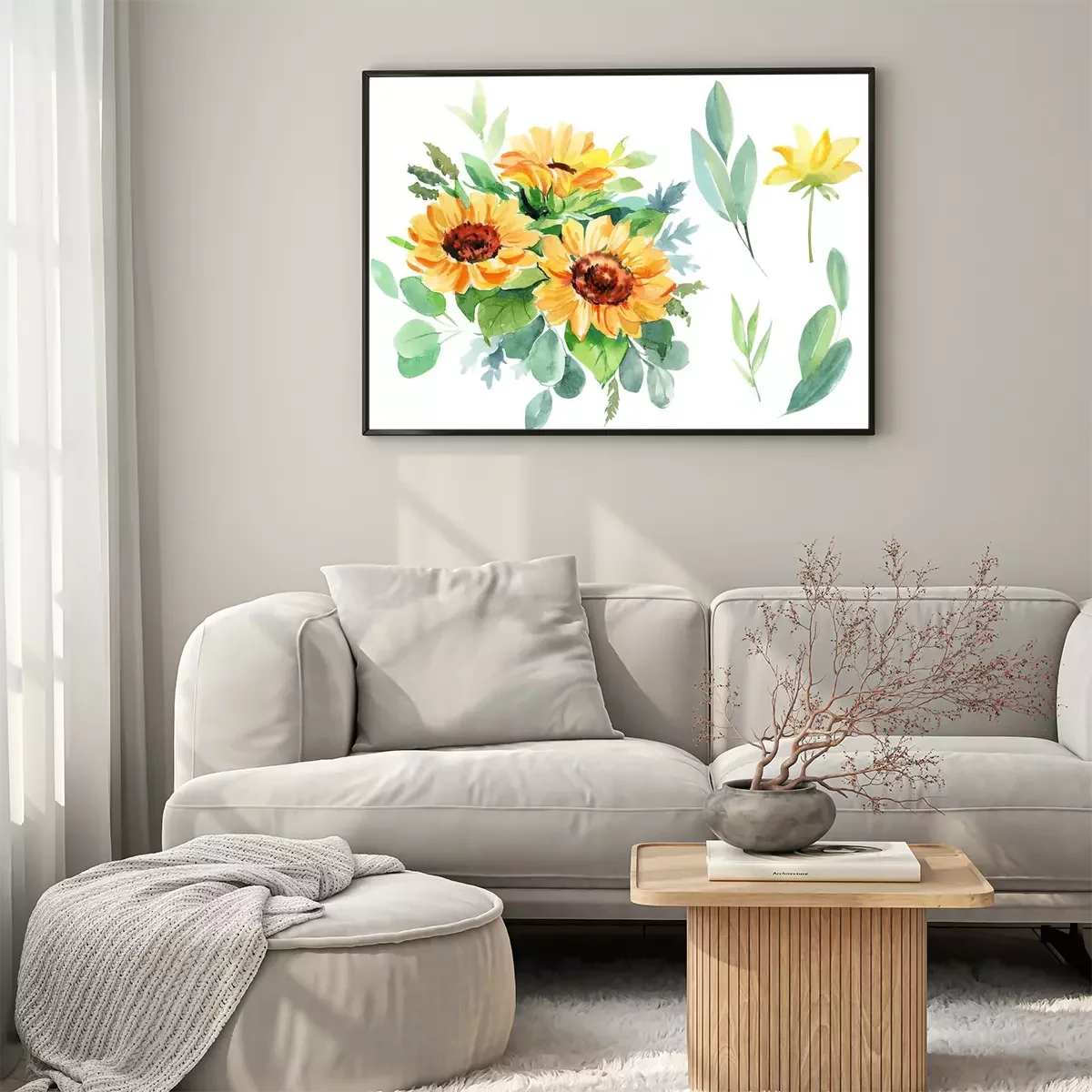 Poster: Het boeket van waterverfzonnebloemen onder bladeren
