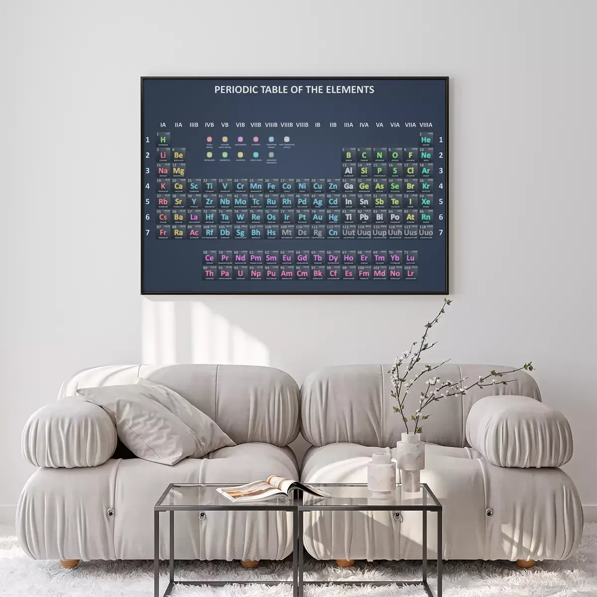 Concept van een atoom met het periodiek systeem op de achtergrond