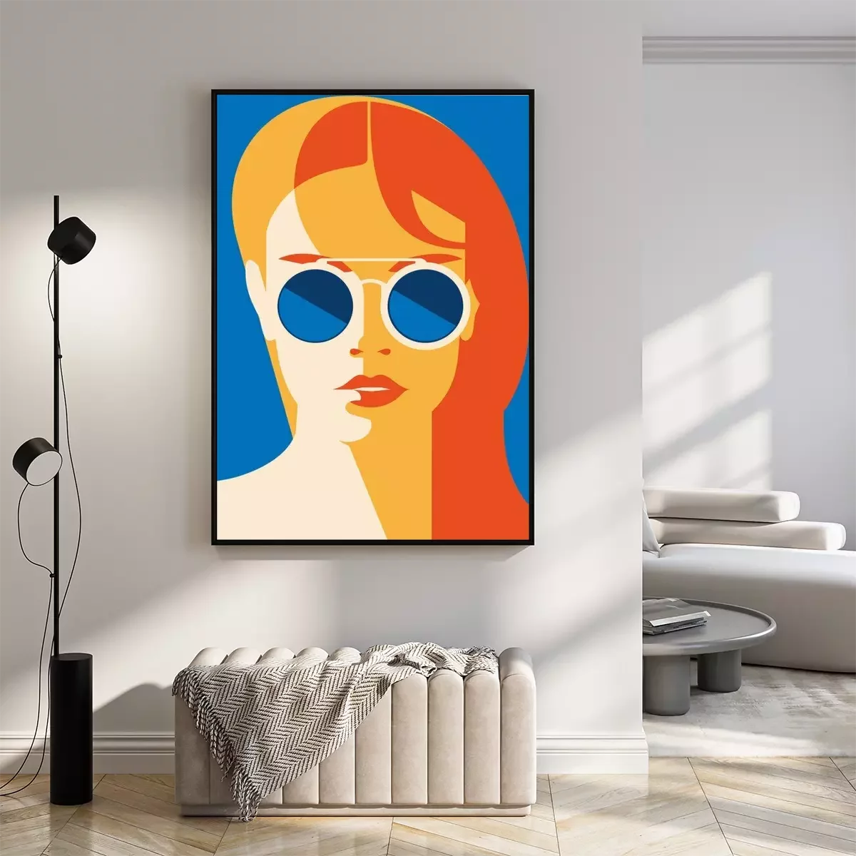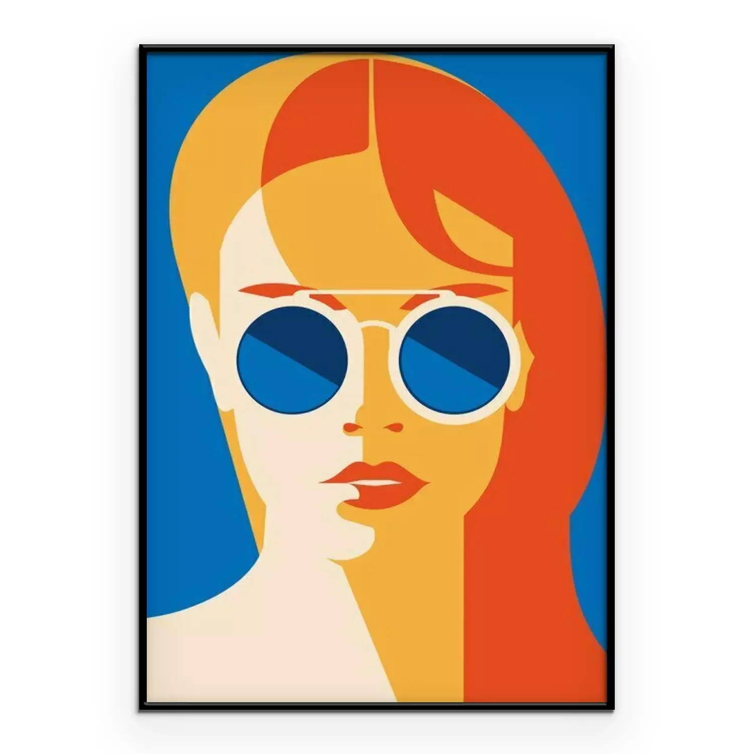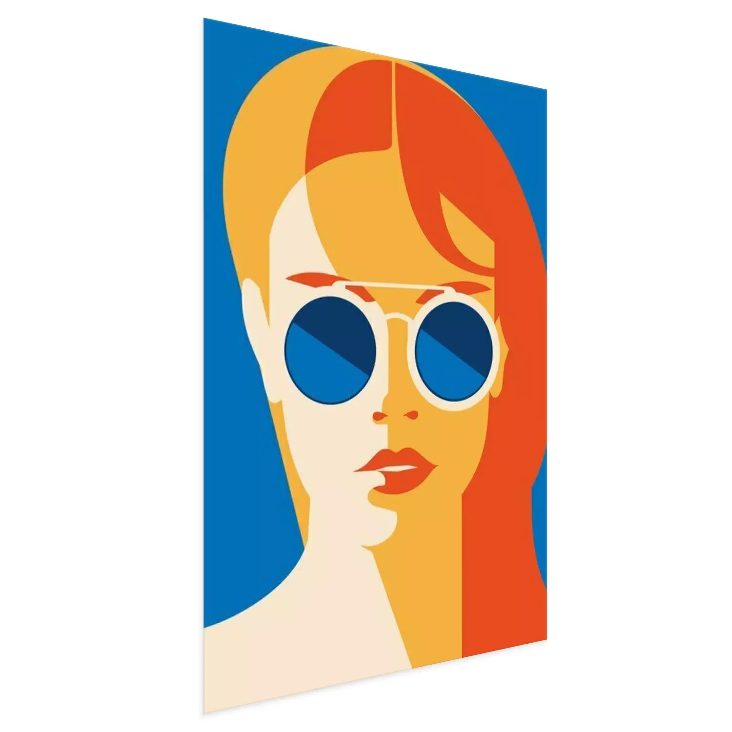 Poster: Het portret van de manier van een modelmeisje met zonnebril. Retro trendy kleurenposter of vlieger.