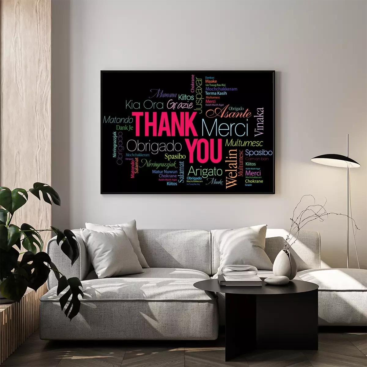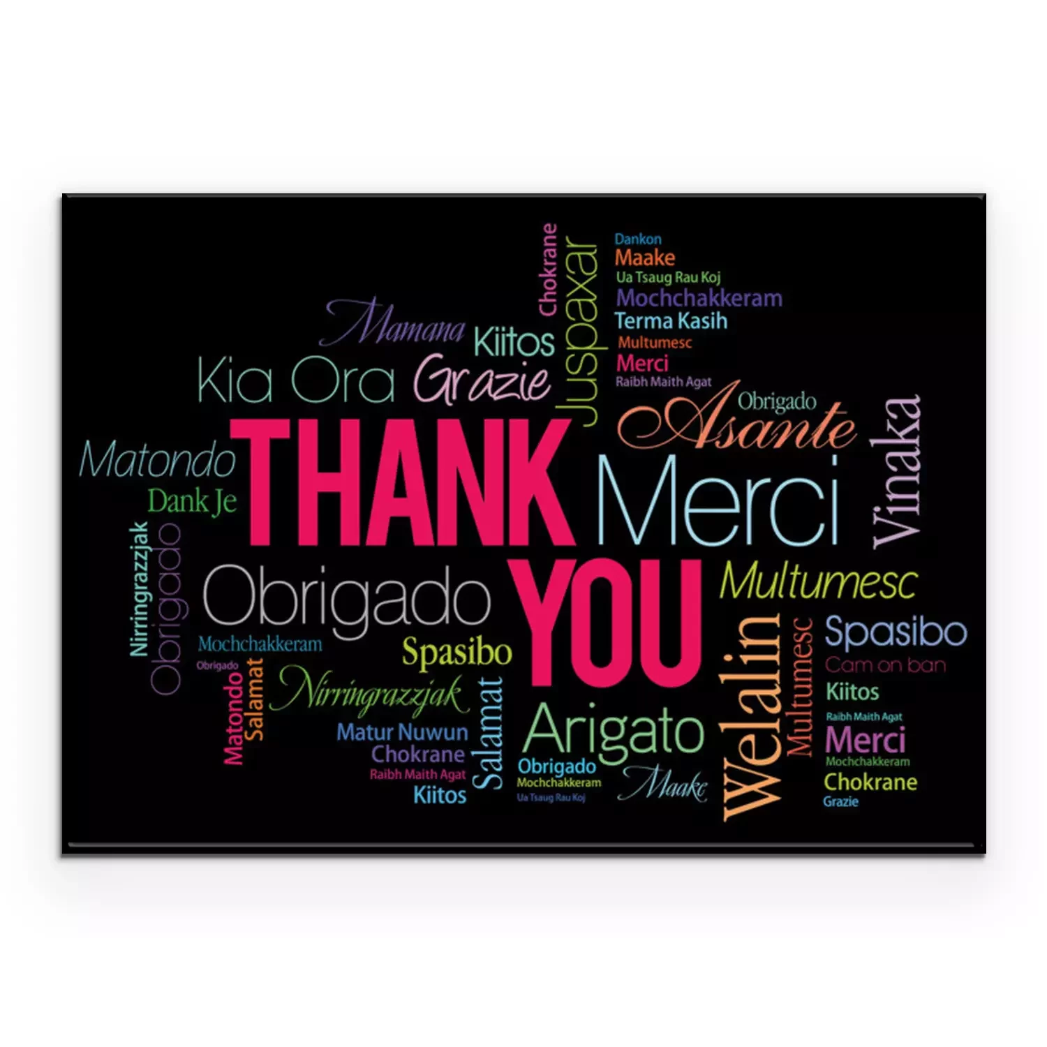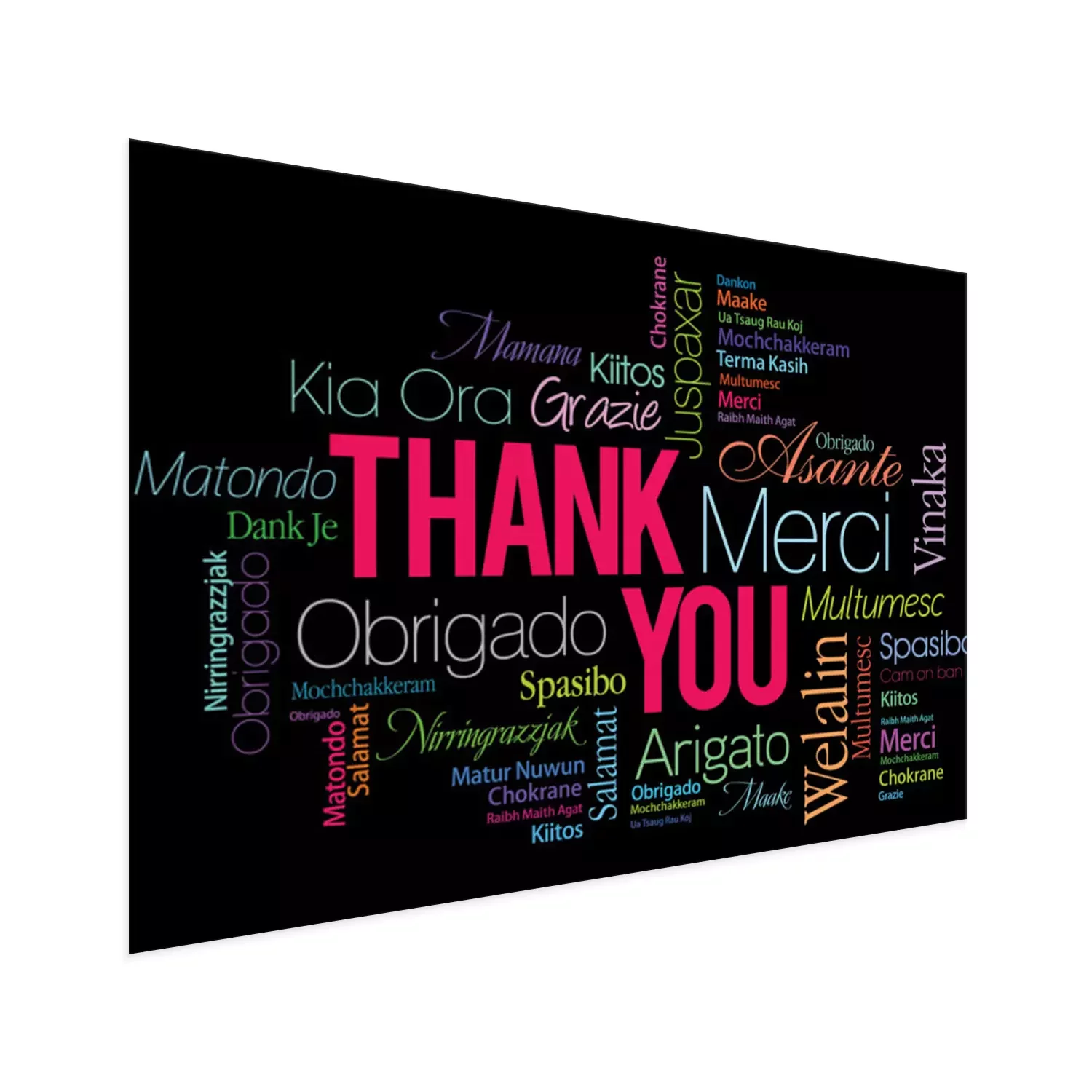 Poster: Het woord bedankt geschreven in verschillende talen