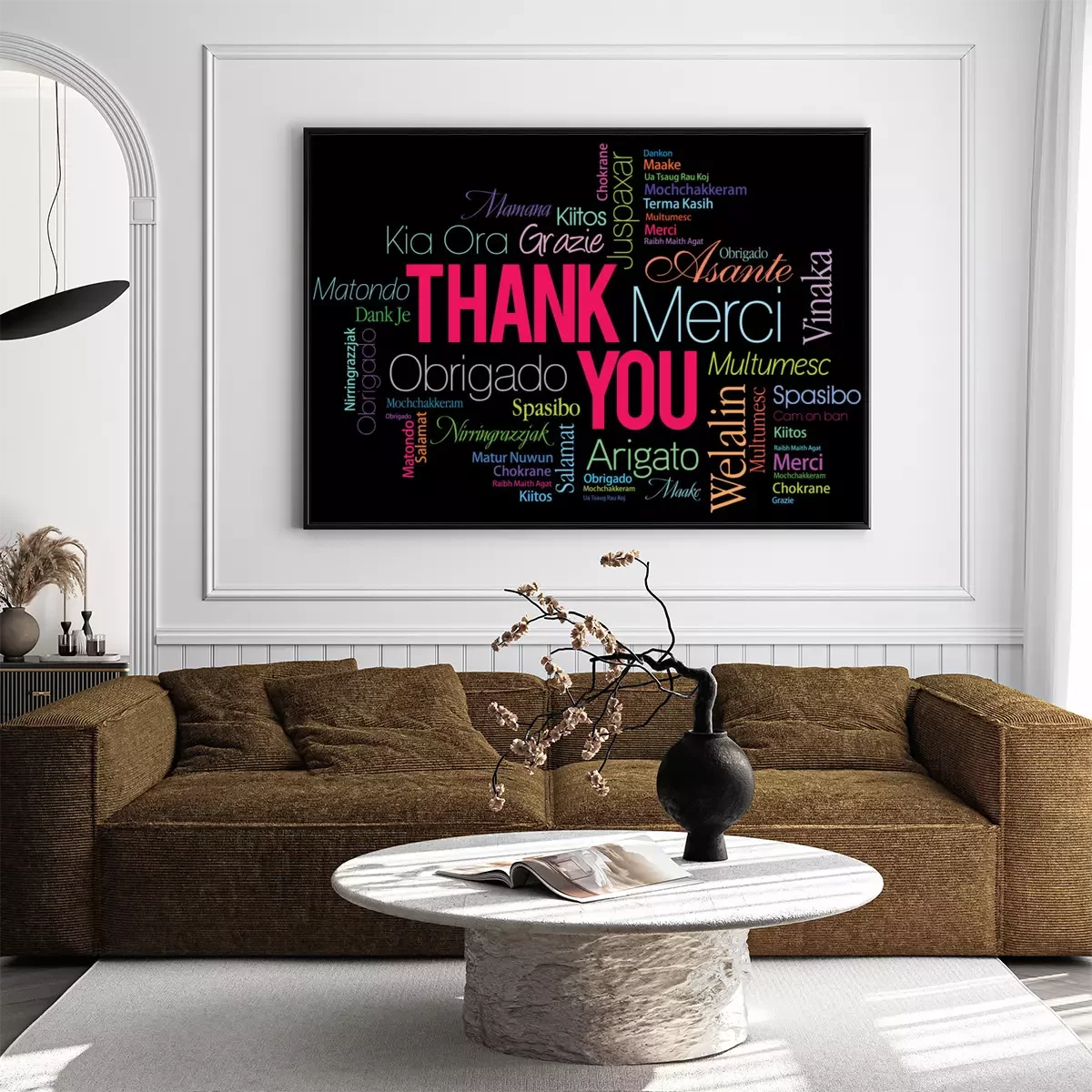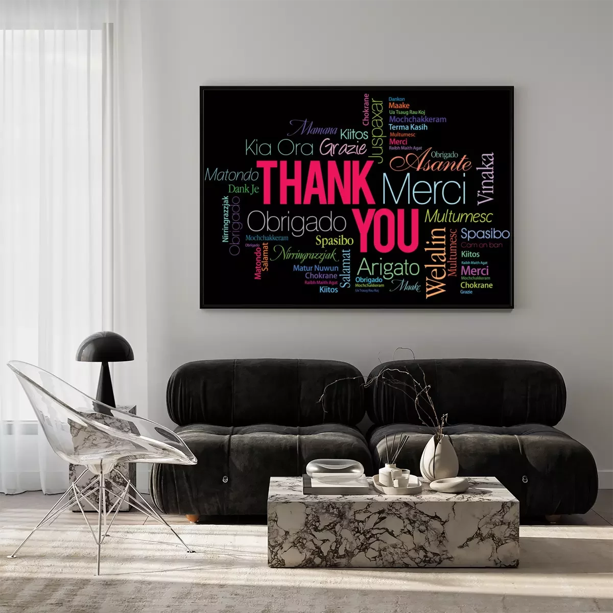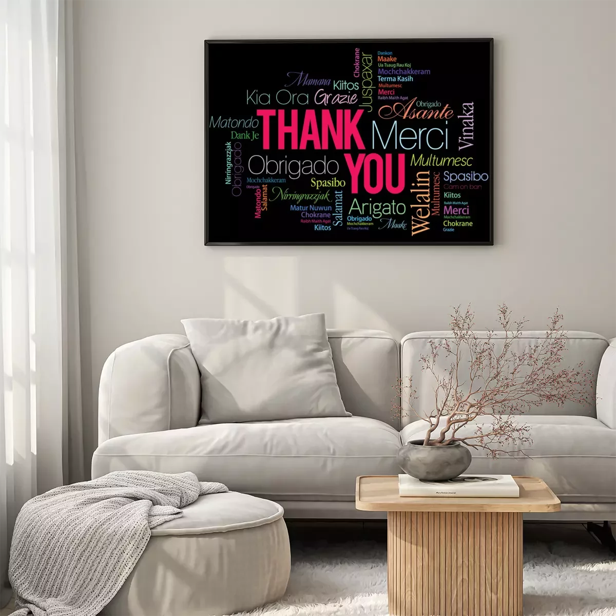 Poster: Het woord bedankt geschreven in verschillende talen