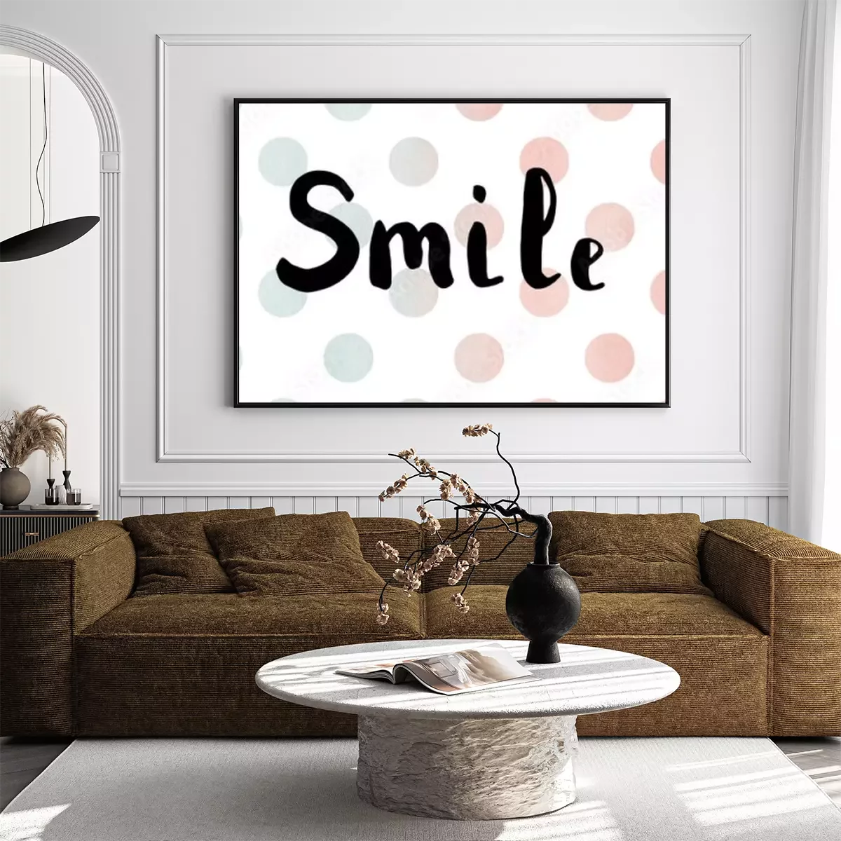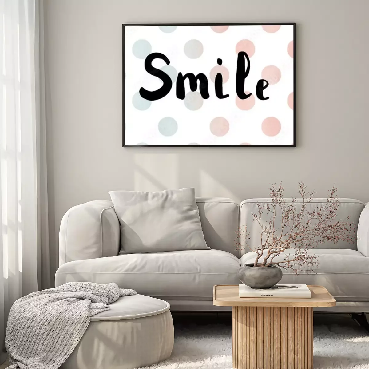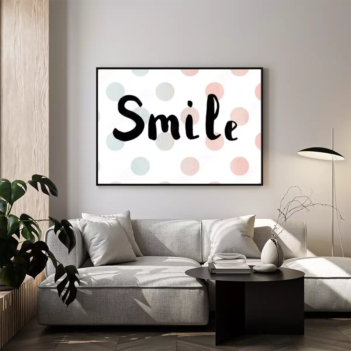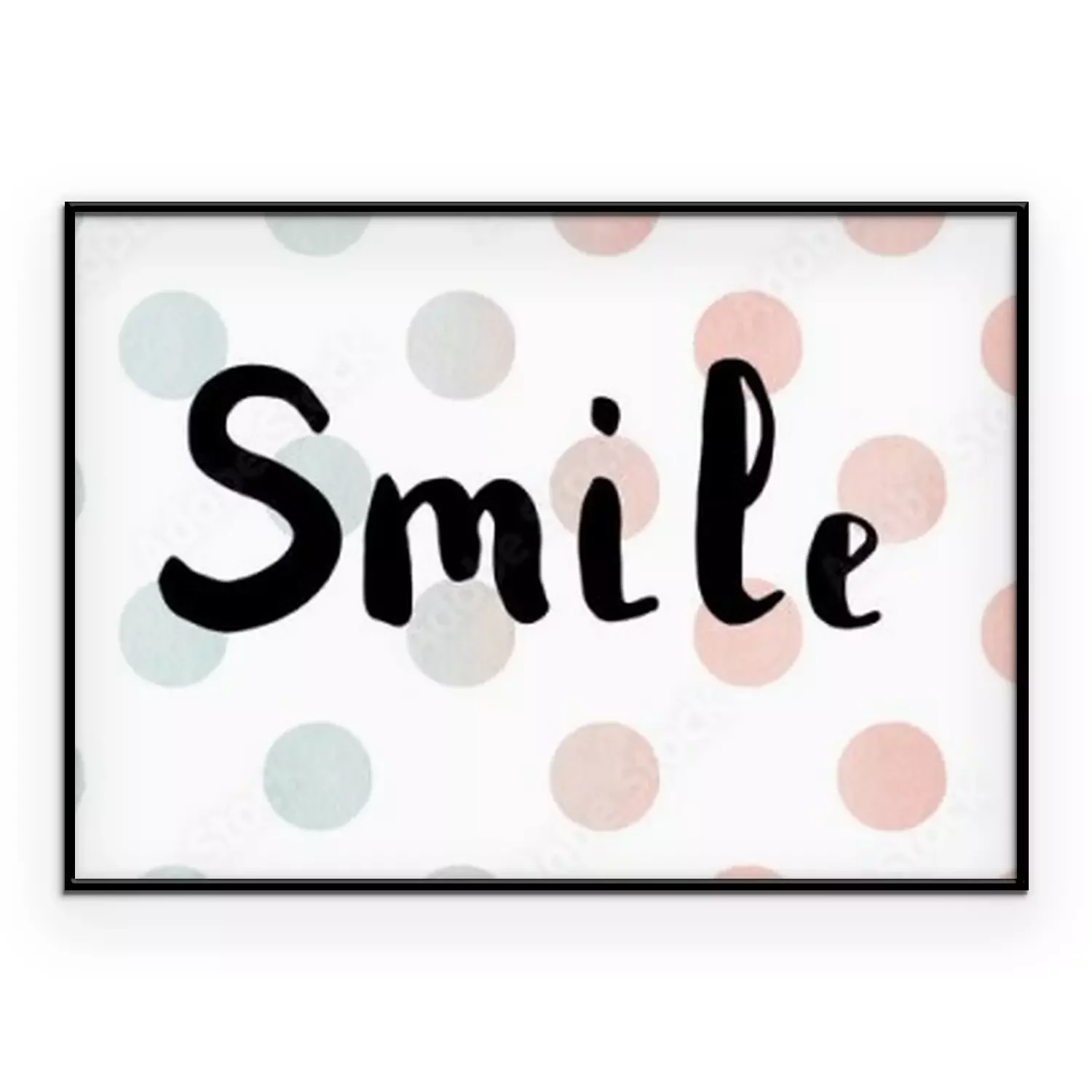 Poster: Het woord glimlach. Belettering. Borstel kalligrafie.