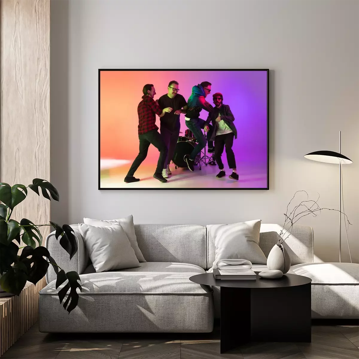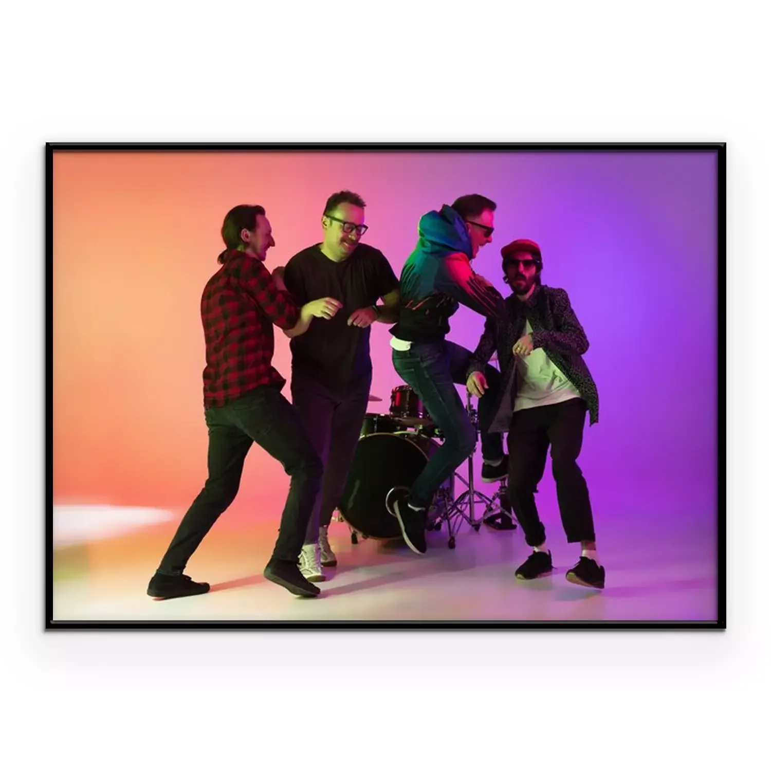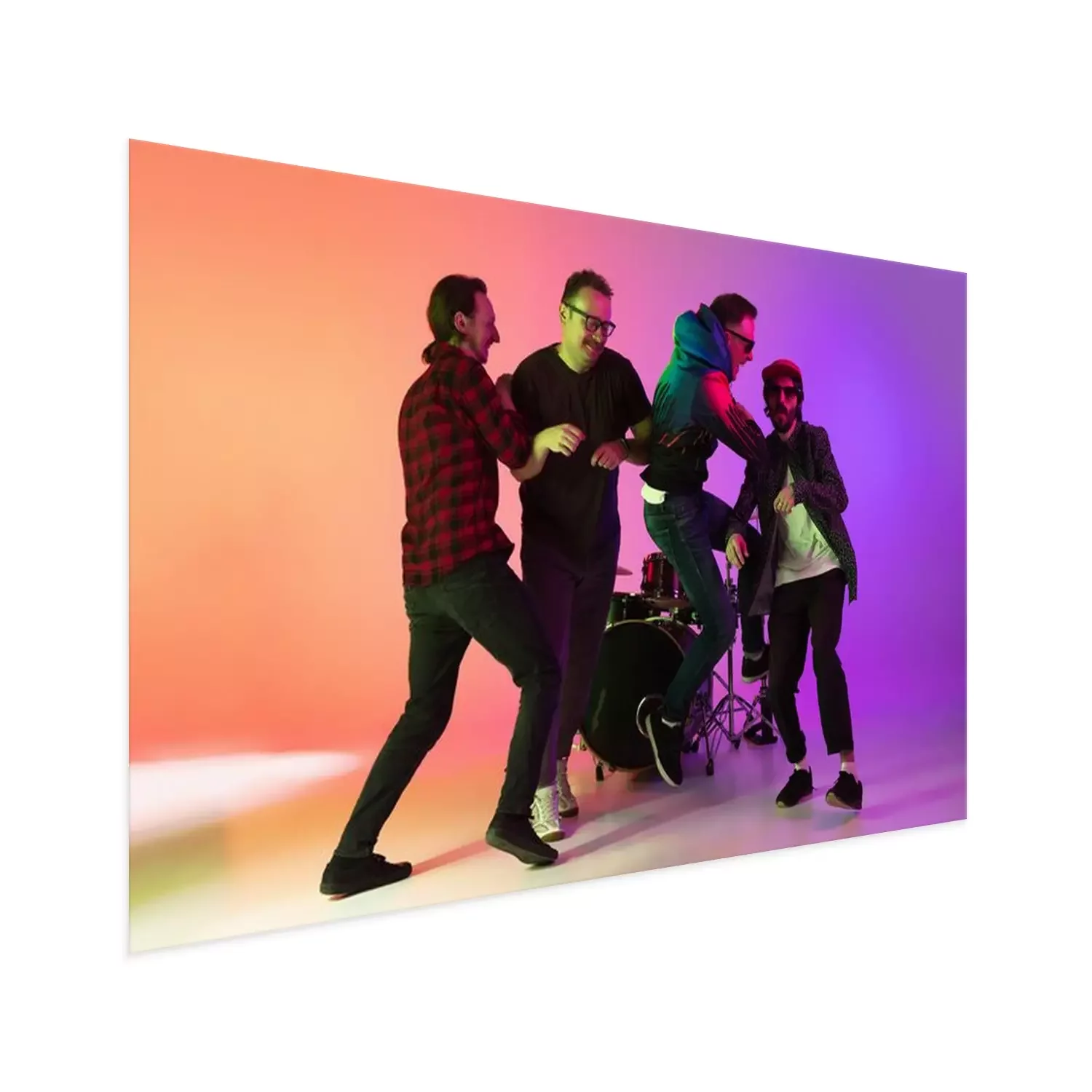 Poster: High jump. Young inspired and expressive music band performing on gradient colored background in neon light. Concept of music, hobby, festival, art. Joyful artist, colorful, bright portrait.