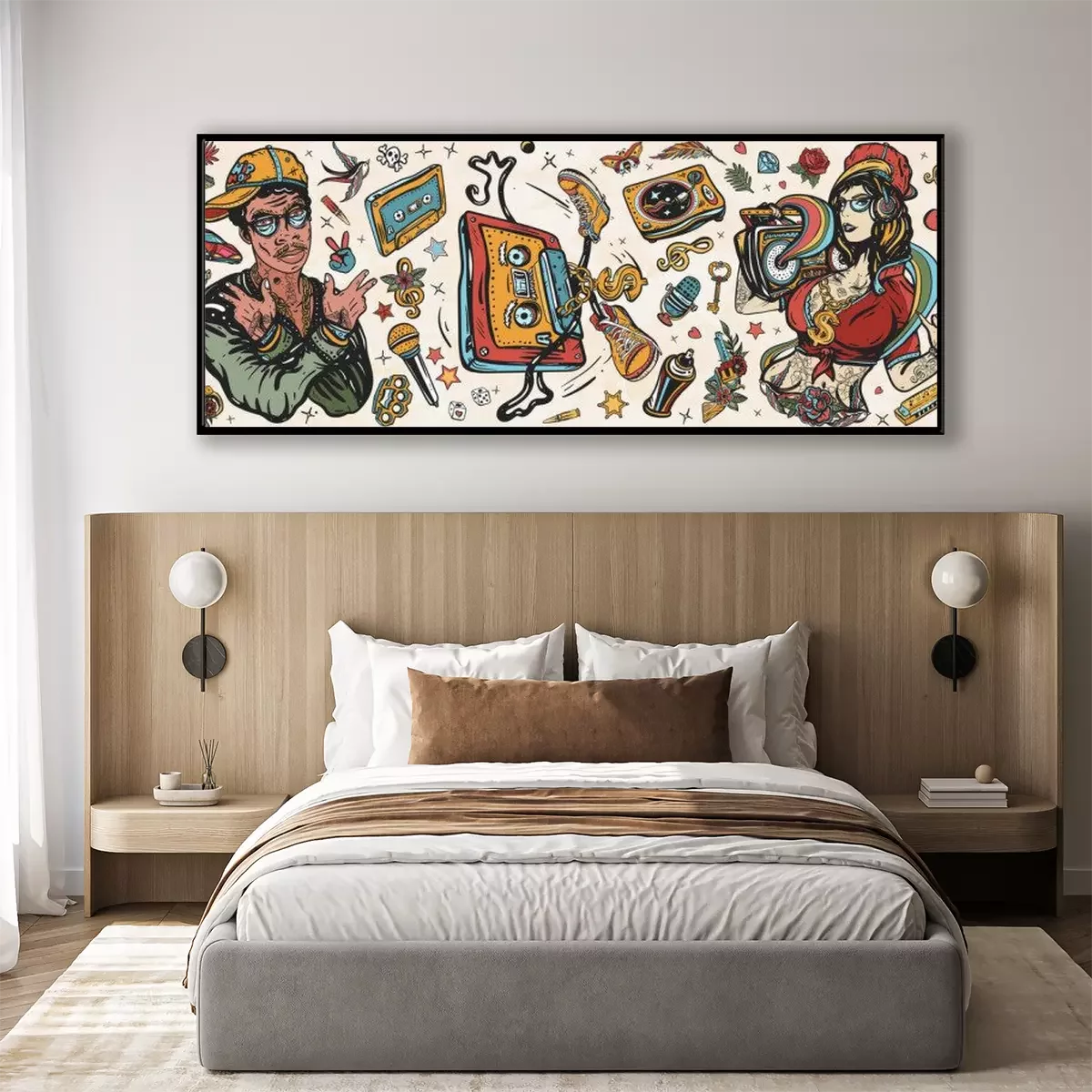 Rap music seamless pattern. Old school tattoo style. Hip hop girl, swag woman. African American man rapper. Audio cassette, break dance art. Street ghetto lifestyle. Pop culture musical background
