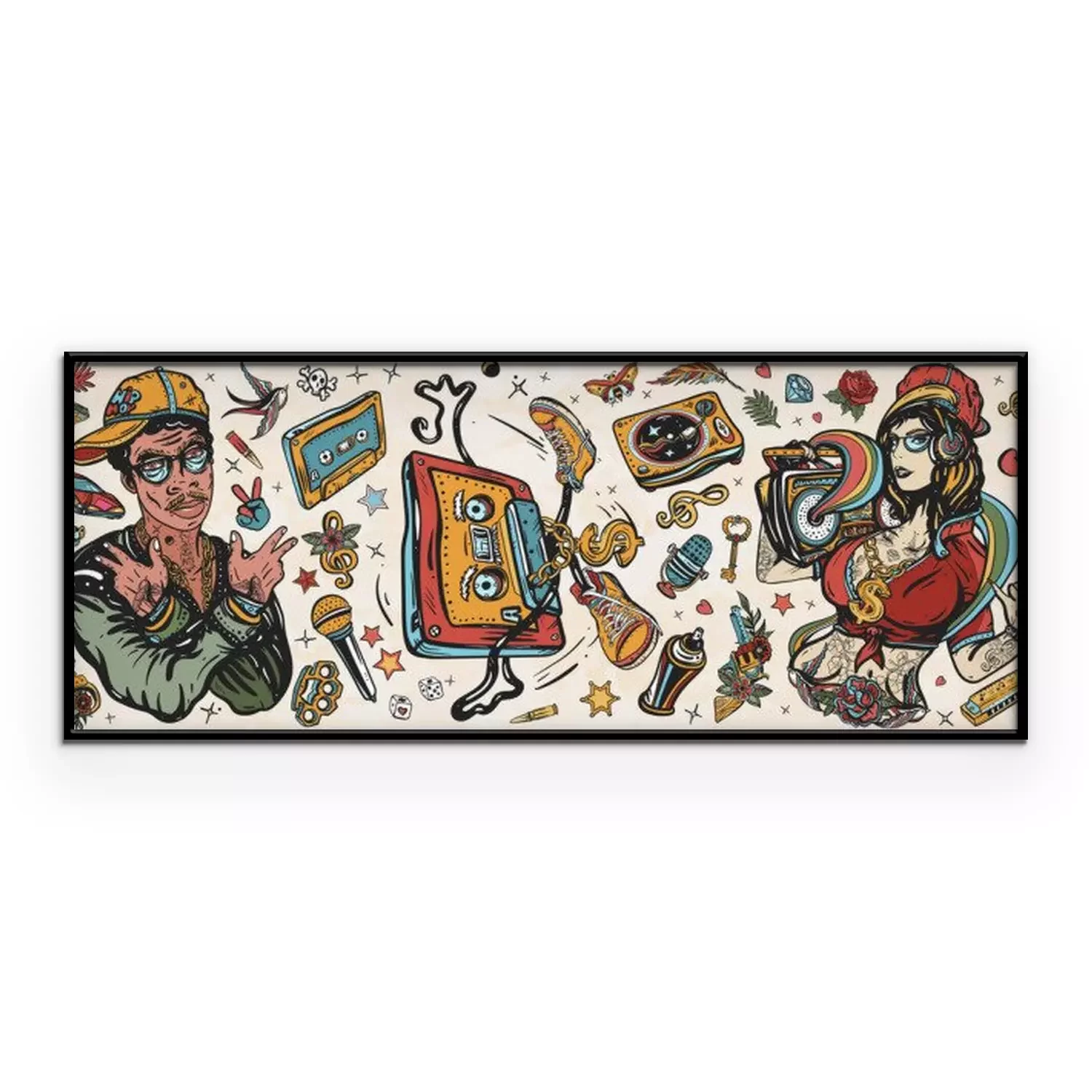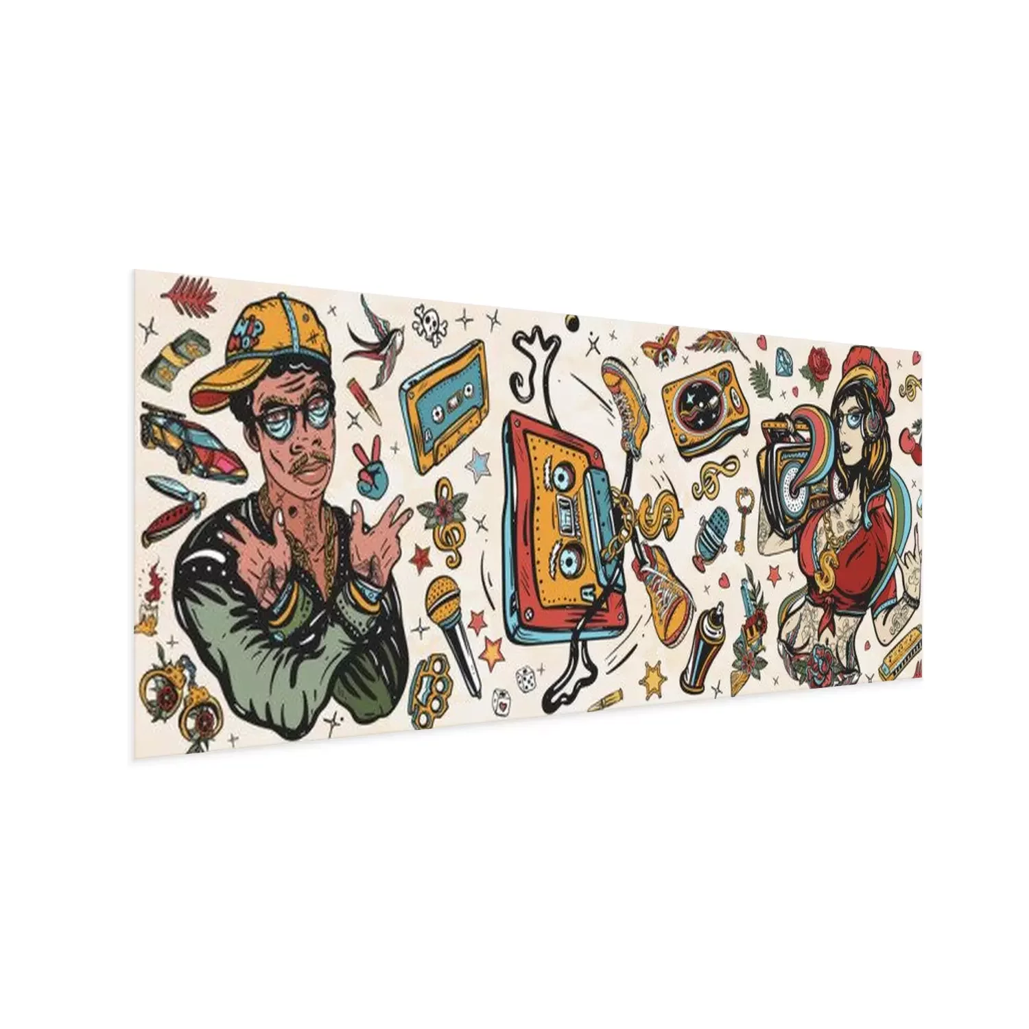 Poster: Hip hop music. Old school tattoo collection. African American man rapper in baseball cap and glasses, Rap girl, swag woman, boom box. Audio cassette, break dance. Tattooing musical street ghetto