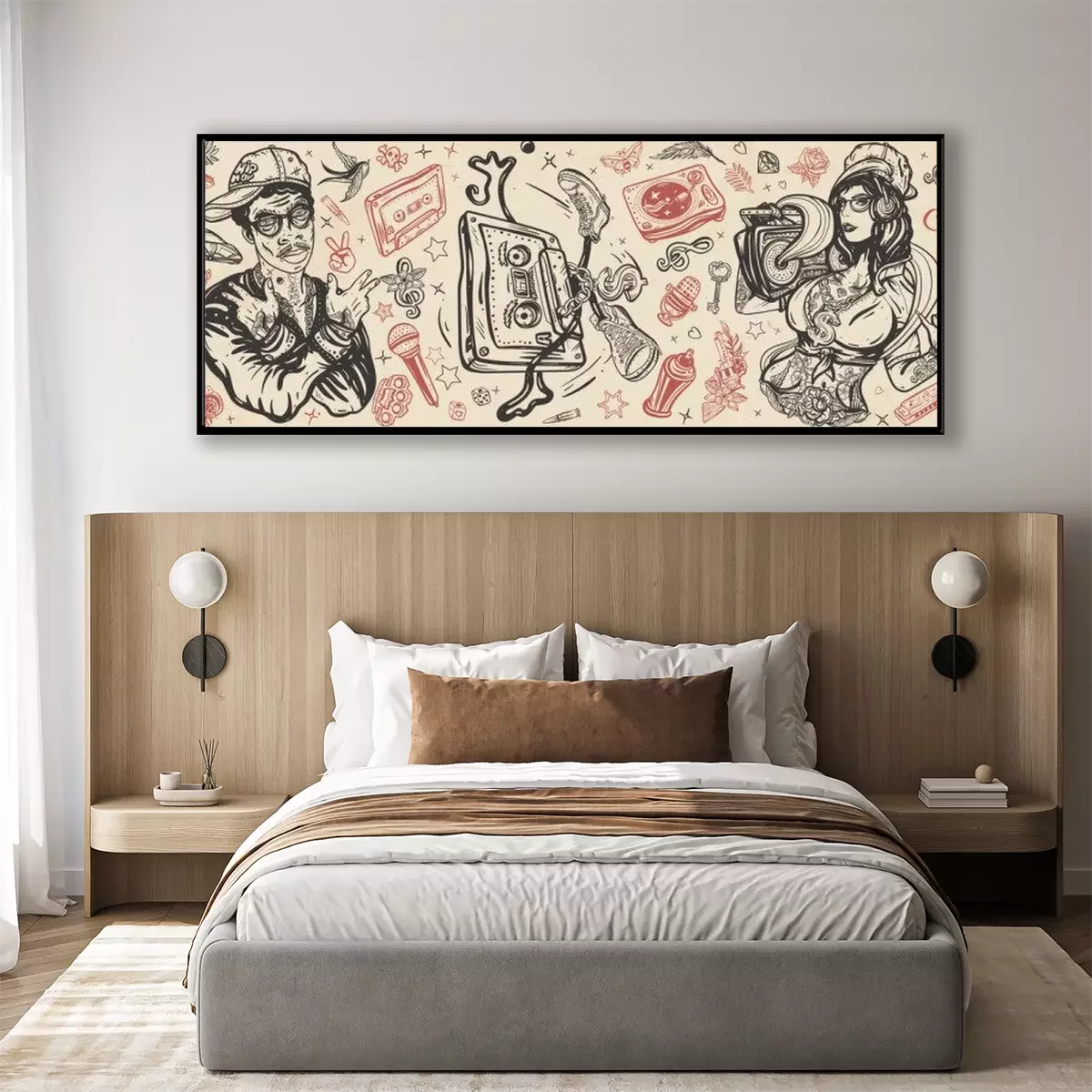 Rap music seamless pattern. Old school tattoo style. Hip hop girl, swag woman. African American man rapper. Audio cassette, break dance art. Street ghetto lifestyle. Pop culture musical background