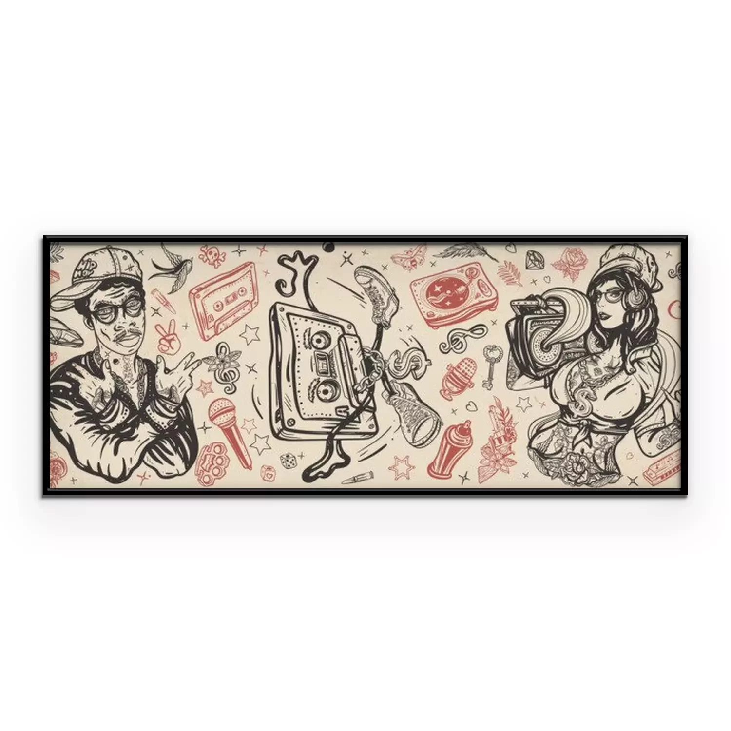 Hip hop music. Old school tattoo collection. African American man rapper in baseball cap and glasses, Rap girl, swag woman, boom box. Audio cassette, break dance. Tattooing musical street ghetto