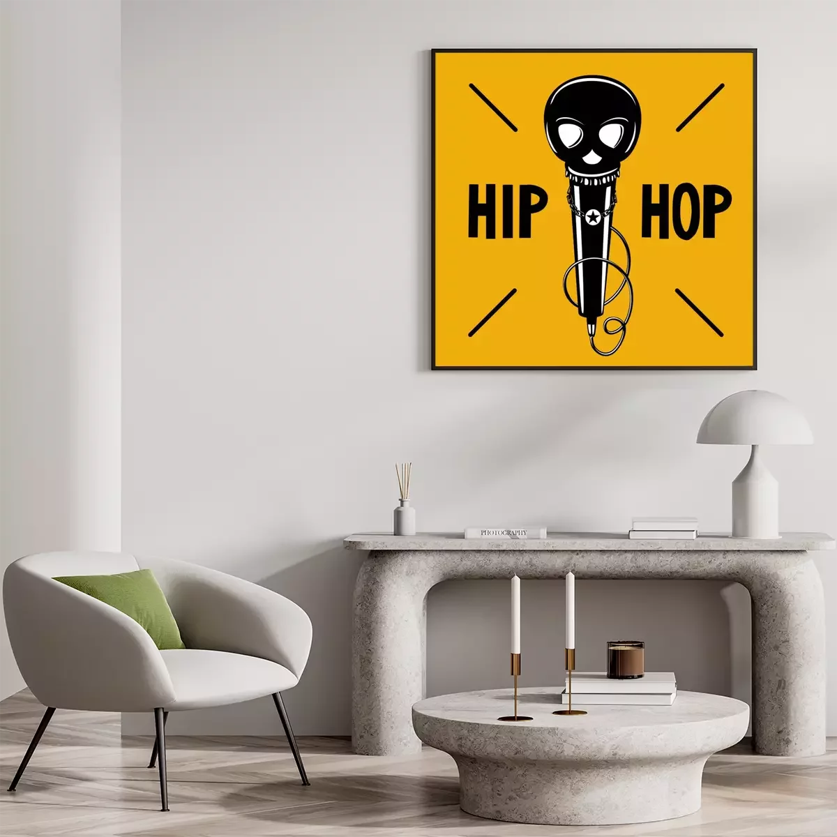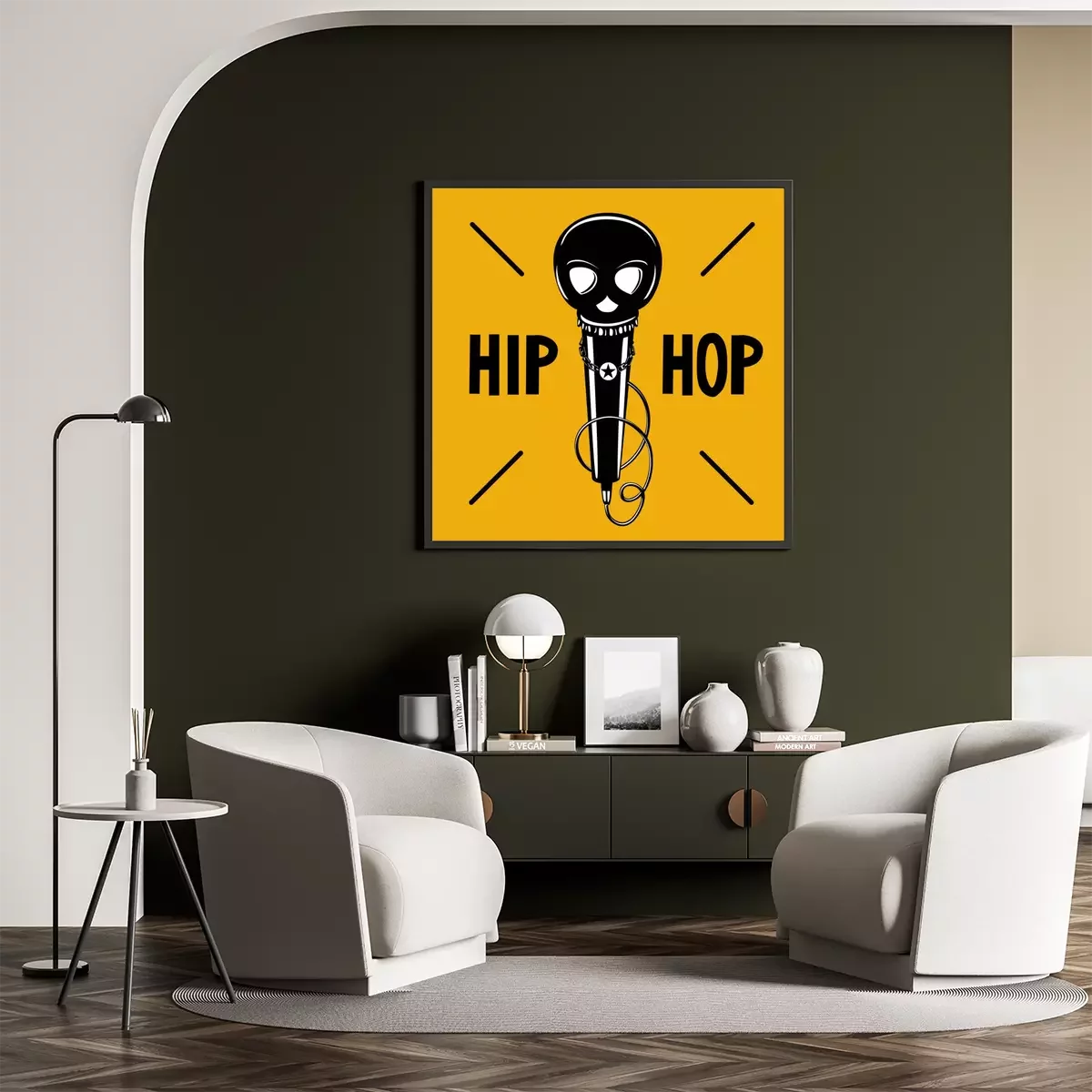 Poster: Hip-hop party poster met microfoon en schedel. Rap illustratie met zwarte kop. Vector teken.