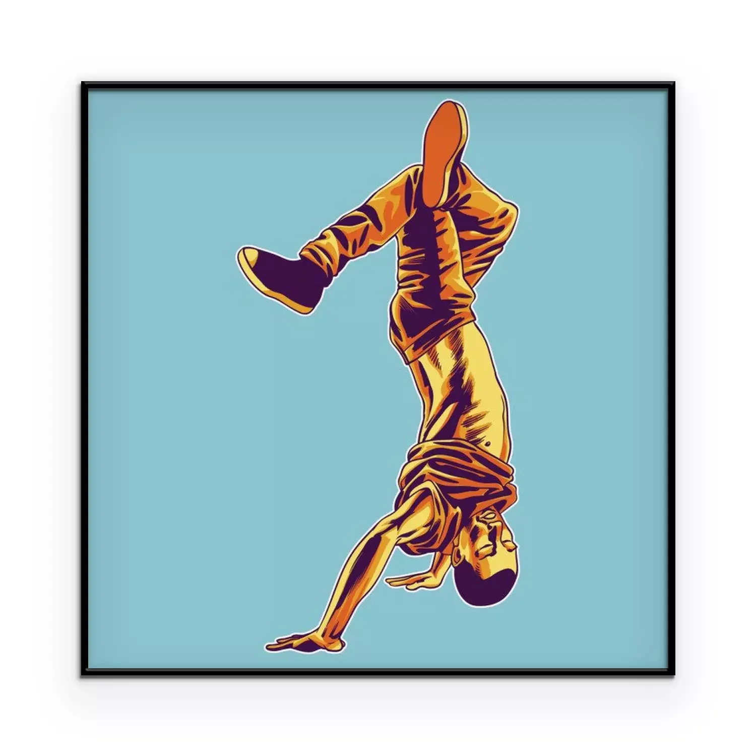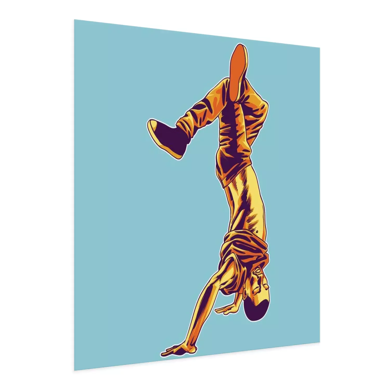 Poster Hiphop dansende jongen die zich op zijn handsVectorillustratie op een blauwe achtergrond bevindt.