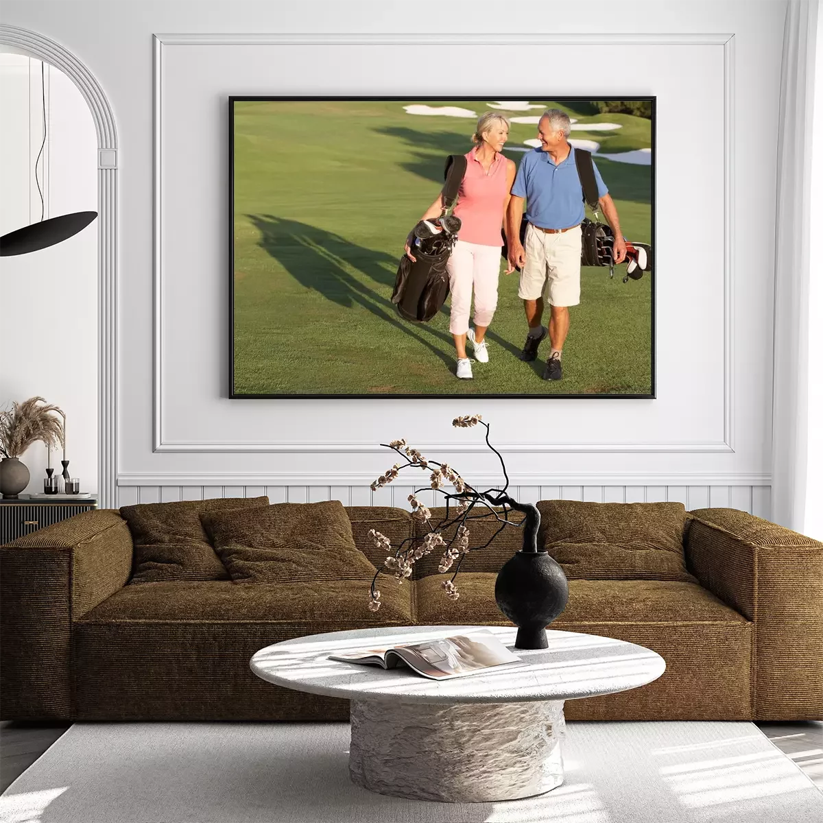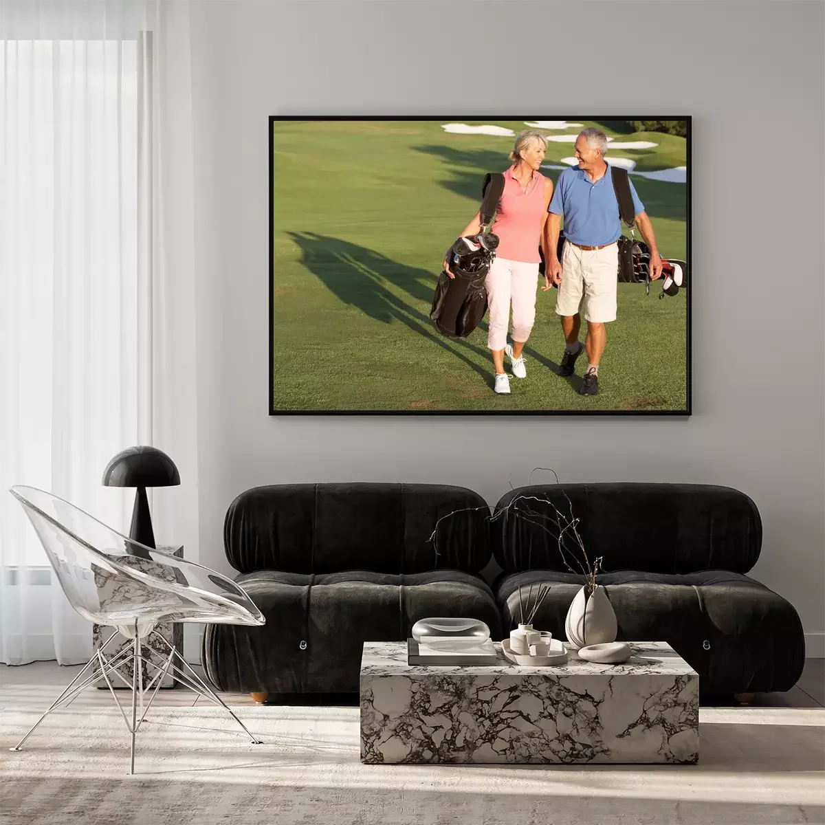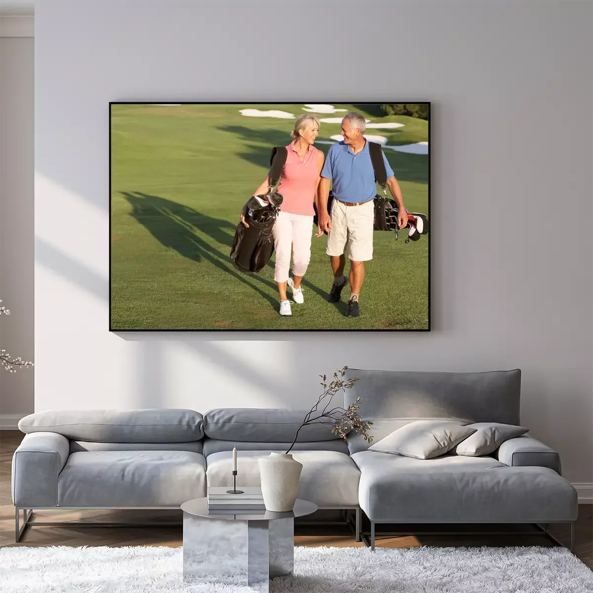 Poster Hoger paar dat langs Golfbaan draagtassen
