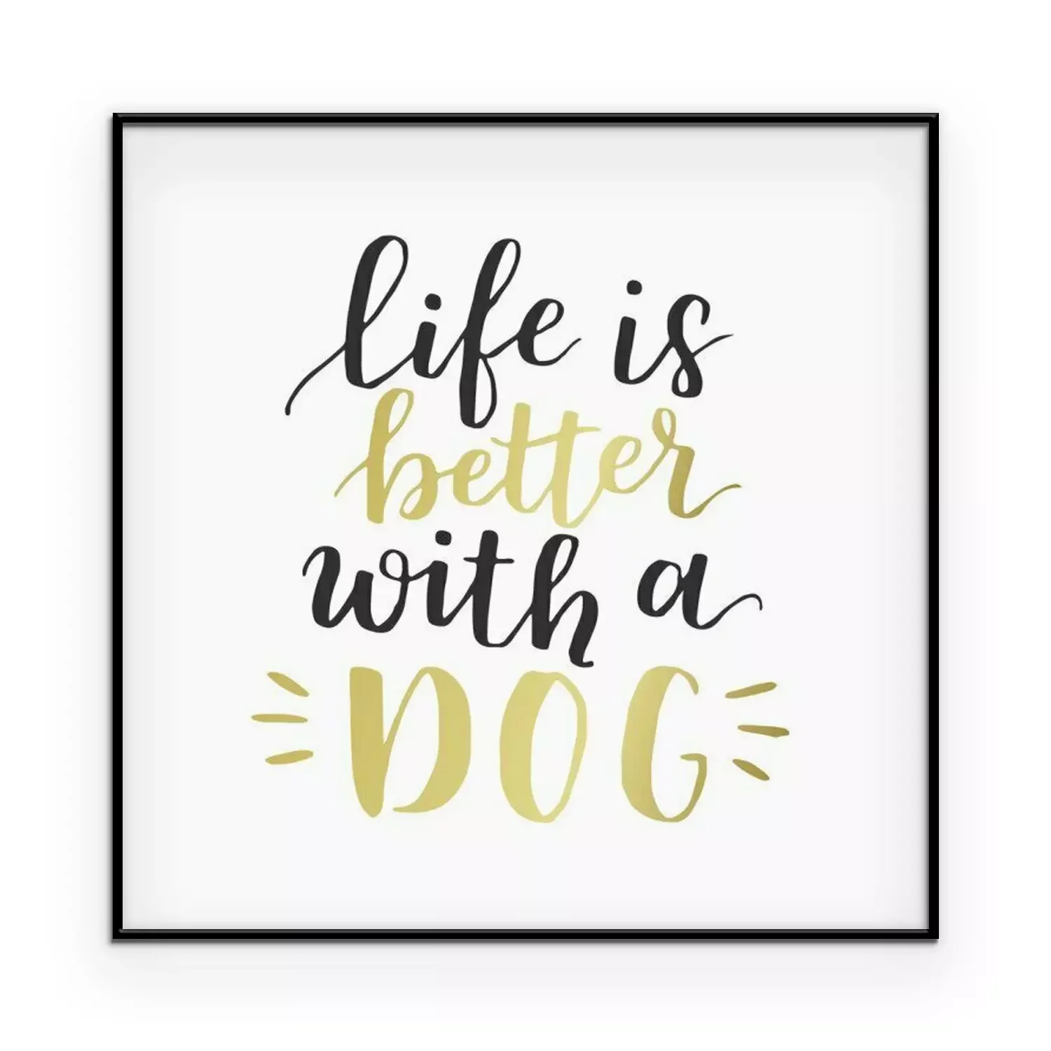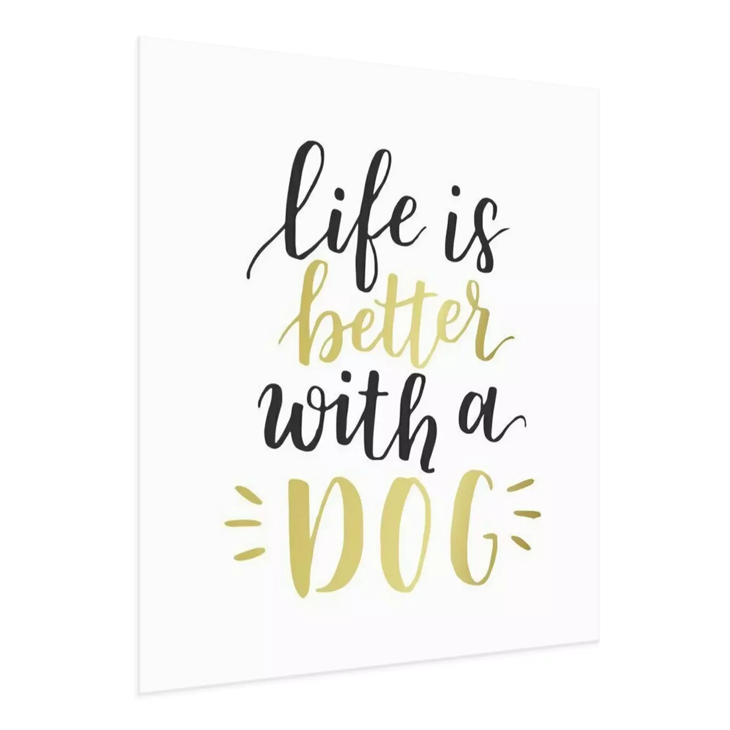 Poster: Hond goedkeuring handgeschreven letters. Brush belettering citaat over de hond Het leven is beter met een hond. Vector motieven zeggen met zwarte en gouden inkt op een witte achtergrond geïsoleerd.