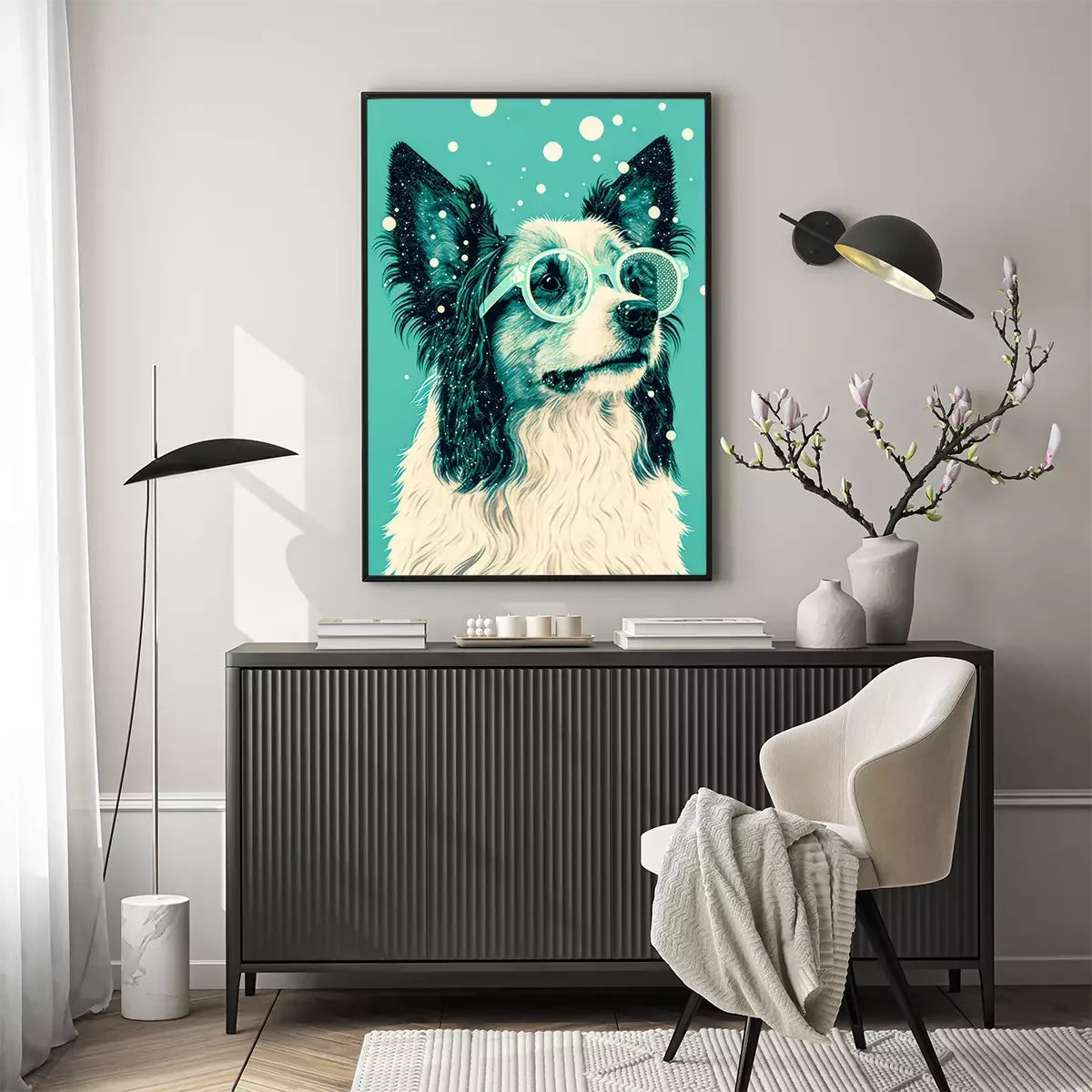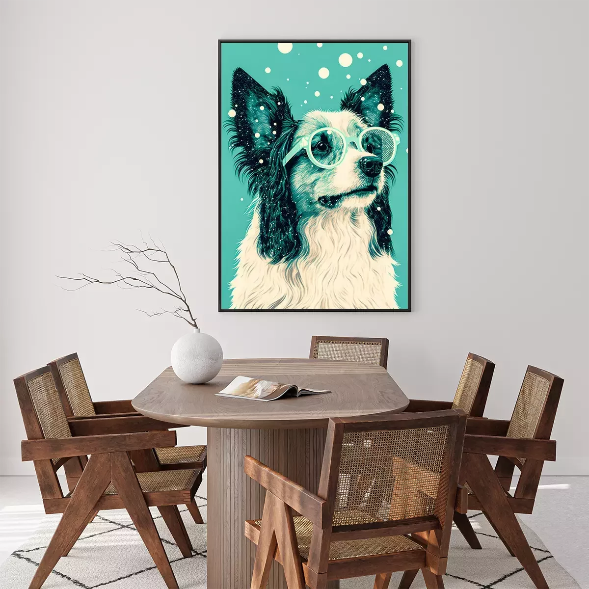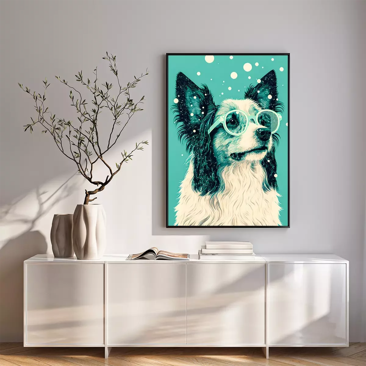 Poster: Hond met bril op een groene achtergrond