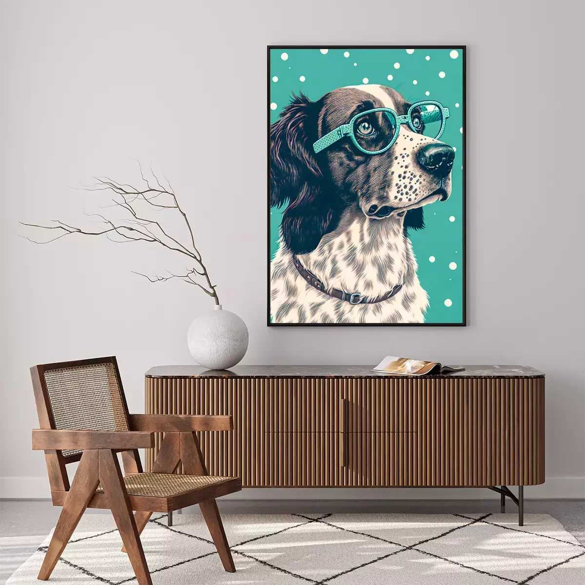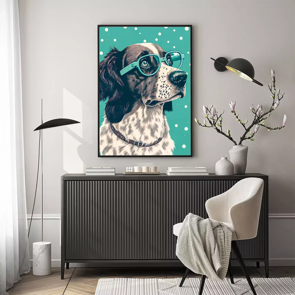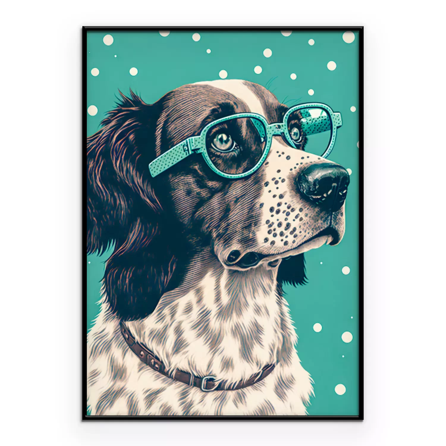 Wie is de beste vriend van de mens? Natuurlijk, de hond! Een hondenposter met een schattige viervoeter is de ideale oplossing voor alle liefhebbers van deze dieren. Hoewel het lijkt alsof posters met honden vooral bedoeld zijn voor de kinderkamer of tienerkamer, omdat de ontwerpen vaak een vrij kinderlijk karakter hebben, is dat in dit geval anders. Het is waar dat we hebben gekozen voor tekenachtige posters. De hond wordt afgebeeld in de illustratie, maar dat betekent niet dat het een kinderlijke decoratie is. Het ontwerp heeft een retro sfeer - dankzij het realistische portret en de polkadot-achtergrond - en daardoor zijn het extreem veelzijdige hondenposter. Een hond in deze uitvoering zal perfect passen in een woonkamer ingericht in een vintage stijl, met meubels geïnspireerd op het tijdperk van de moderne mid-century. Tegelijkertijd is het ook een ideale keuze voor een moderne inrichting in grijstinten of bruinen. Een groot voordeel van onze hondenposters is de kleursetting. Aan de ene kant is het ontwerp ingetogen, aan de andere kant krijgt het door de mintgroene accenten karakter en uitstraling, waardoor de afbeelding de aandacht trekt. Het is de moeite waard om met een knipoog naar het decoreren van interieurs te kijken, want op die manier kunnen interessante resultaten worden behaald, en onze hondenposter zijn daar een uitstekend voorbeeld van. Honden zijn voor velen van ons gezinsleden, en een getekend portret aan de muur zal de liefde voor deze dieren benadrukken. Op deze manier zal de decoratie niet alleen de muur versieren, maar ook een toevoeging worden die illustreert wat belangrijk voor ons is. Posters met honden zullen ook geweldig staan in een jeugdige inrichting. Het stripachtige karakter van het ontwerp maakt het een voorstel dat zeker in de smaak zal vallen bij veel tieners die van viervoeters houden. Dezelfde ontwerpen kunnen worden gebruikt in de kinderkamer, omdat dergelijke hondenposter zeker in de smaak zullen vallen bij de kleintjes. Een hond afgebeeld op een grappig portret, waarop hij een bril met dikke monturen draagt, zal een glimlach op het gezicht van het kind toveren. Als de kleintjes fans zijn van viervoeters, beperk je dan niet tot één muurdecoratie, maar kies drie posters. Honden in de vorm van grappige illustraties kunnen een drieluik vormen boven het bureau waar het kind tekent en huiswerk maakt, of boven het wiegje als het kind niet van slapen houdt en zich beter voelt in het gezelschap van kleine hondenvrienden.