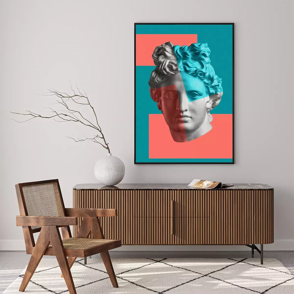 Poster: Hoofd van oude figuur op geometrische achtergrond