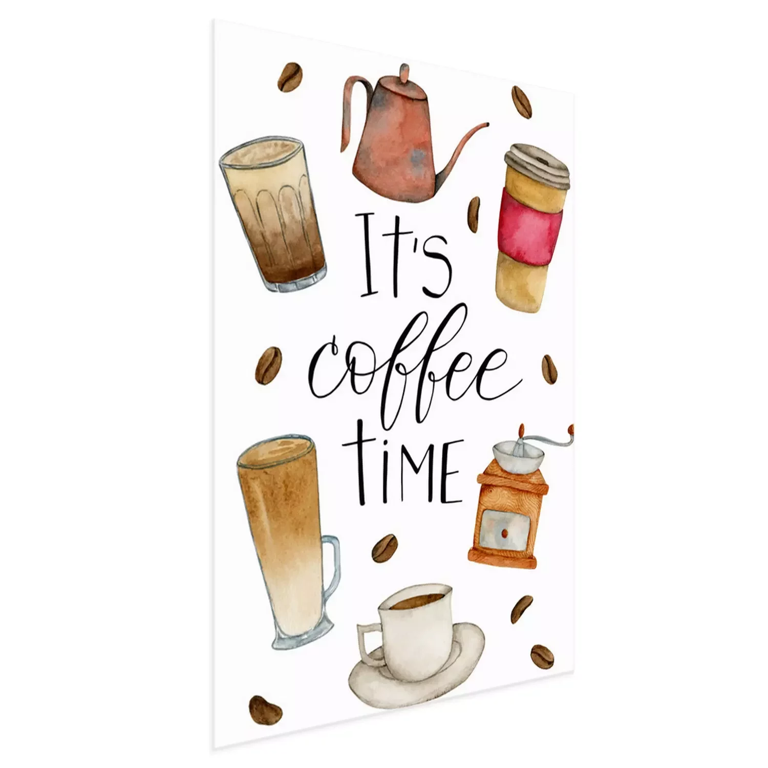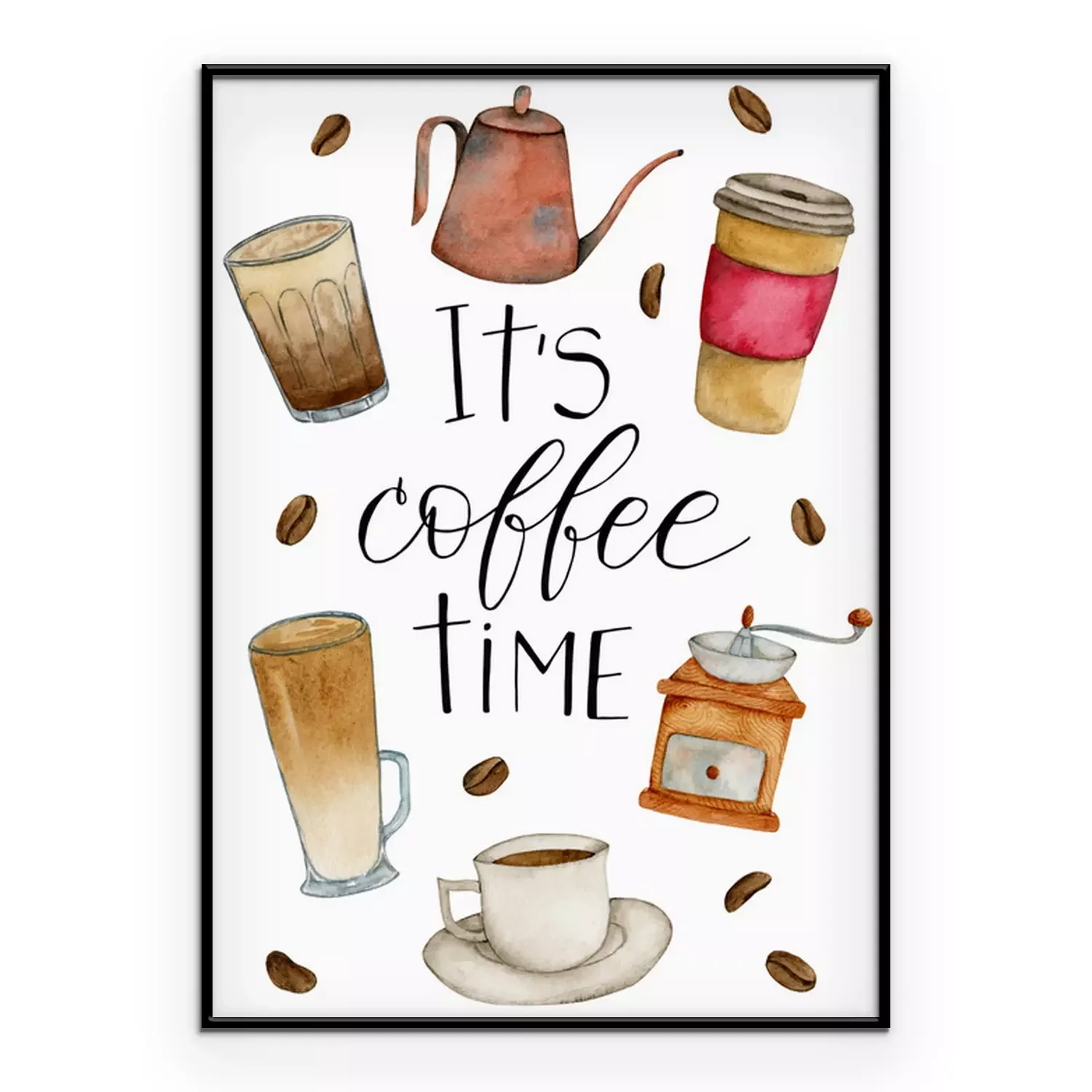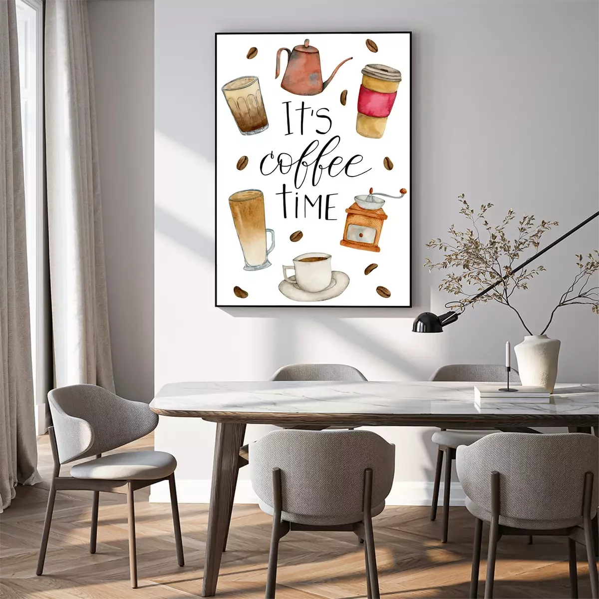 Een van de meest beproefde motieven voor wanddecoratie in de keuken en eetkamer is zonder twijfel koffie. De koffieposter die wij aanbieden, vangt dit thema op een bijzonder charmante en artistieke manier. De afbeeldingen op de poster zijn geïnspireerd op aquarelkunst. De koffie kleurstelling waarin de wordt afgebeeld, verdient bijzondere aandacht. De poster is rijk aan verschillende tinten bruin en beige, en dankzij de aquareltechniek vloeien de kleuren in elkaar over en vormen ze een harmonieuze compositie. Daarom wordt de poster in een lichte keuken een van de centrale elementen van de ruimte. De witte achtergrond brengt evenwicht, waardoor de grafiek goed samengaat met minimalistische interieurs. Bovendien past de illustratie met haar subtiele en elegante kleurenschema perfect in een boho-eetkamer, waar houten meubels en rotan accessoires een aangename visuele harmonie creëren. Deze stijl houdt van aardetinten en plantenkleuren, waardoor een lijst in zacht rood of oranje de compositie mooi kan afronden. De warme kleurtinten van de illustratie passen ook goed in een rustiek interieur, waar ze de gezellige sfeer van deze stijl aanvullen. Omdat de afbeeldingen op de poster – koffie in verschillende varianten en thematische accessoires – een doordachte compositie vormen, is deze poster ook geschikt voor een formelere ruimte. Tekening kenmerkt zich door de typische zachtheid van aquarelkunst, zelfs in donkere tinten, waardoor het een rustige en universele decoratie is. In een werkomgeving werken warme en gedempte kleuren, zoals die op de poster, bijzonder goed. Daarnaast geeft de tekst in het midden een optimistische toon aan het geheel. Al deze kenmerken maken de koffieposter tot een ideale decoratie voor zowel een kantoor- als een thuiskeuken.