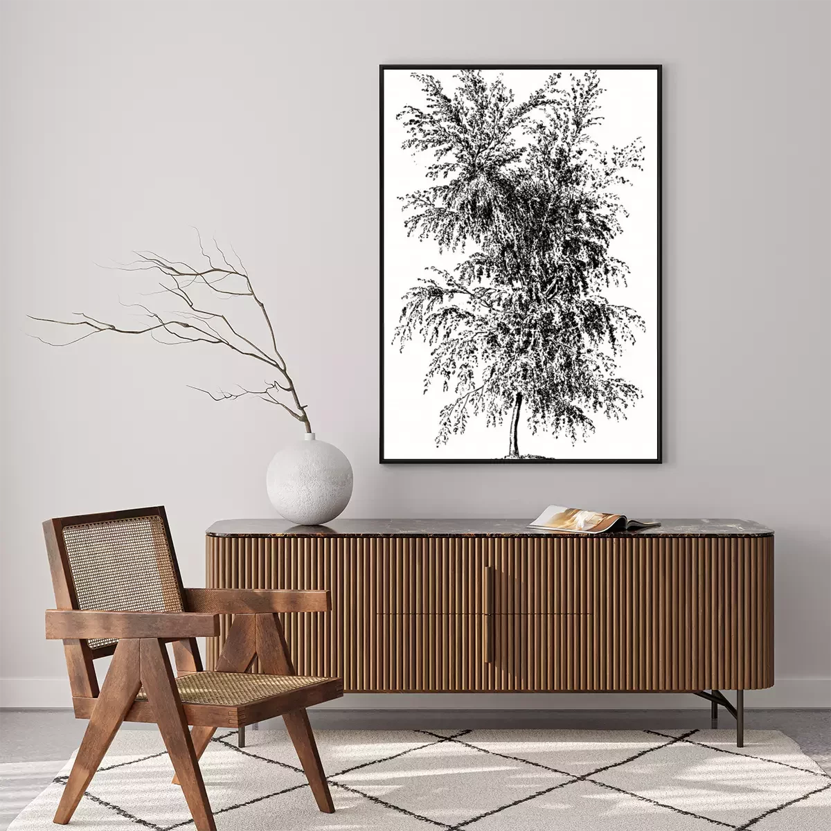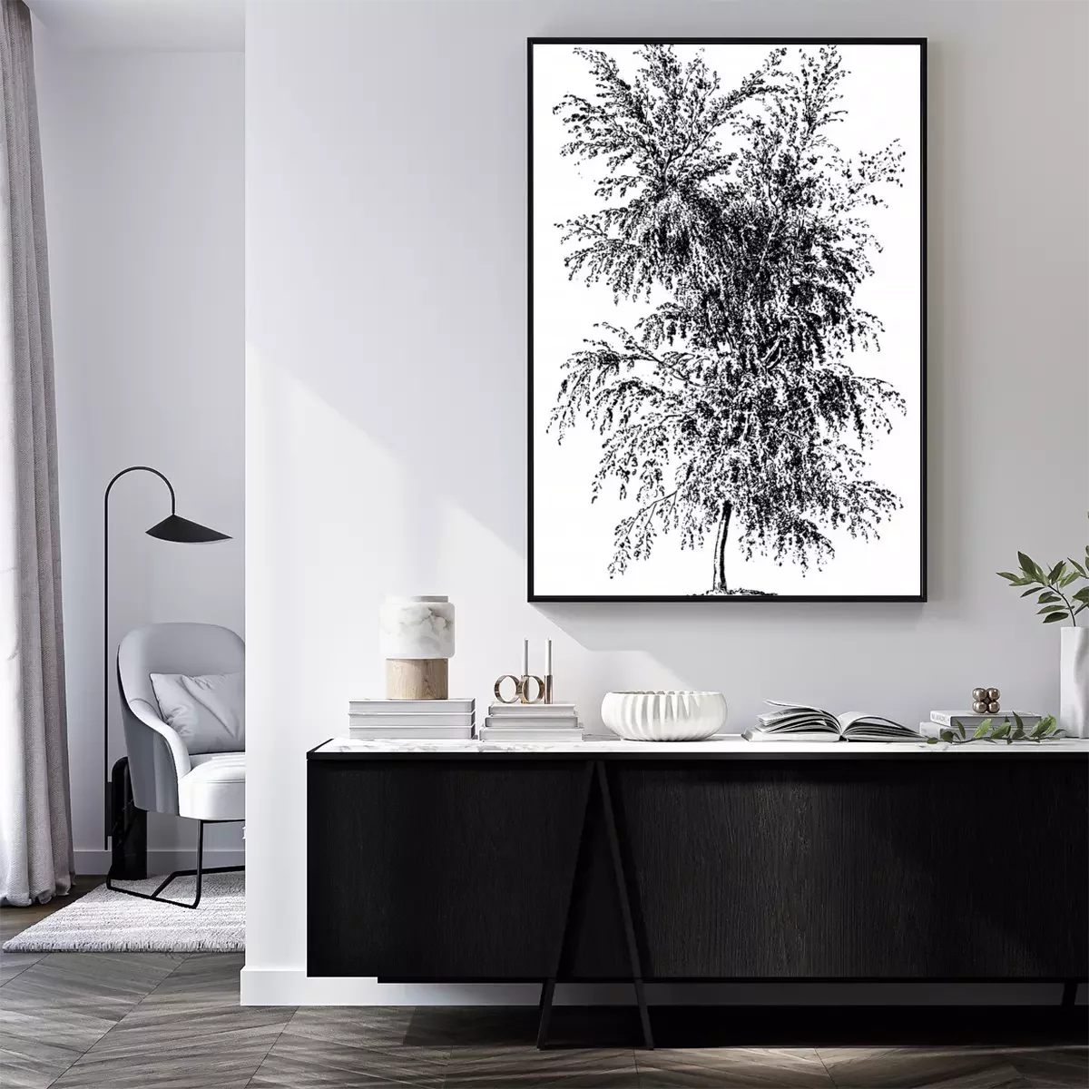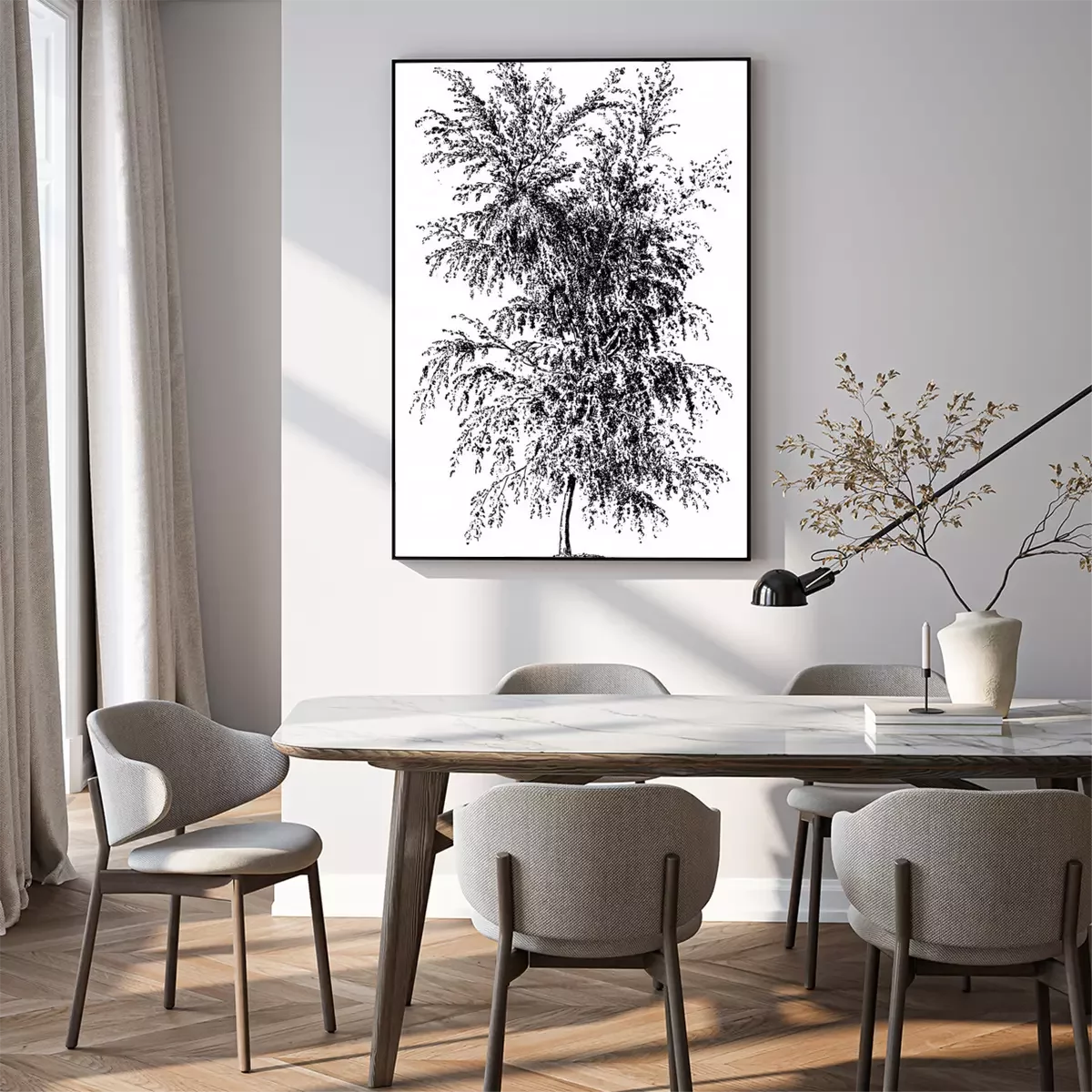 Poster: Illustratie van een verdwijnend berkenbos in de mist