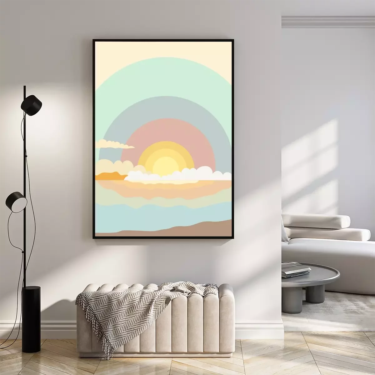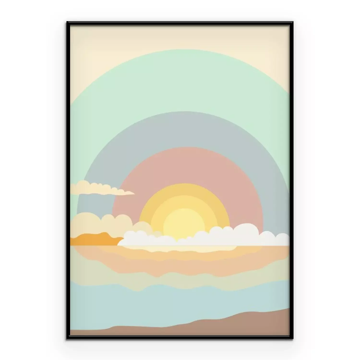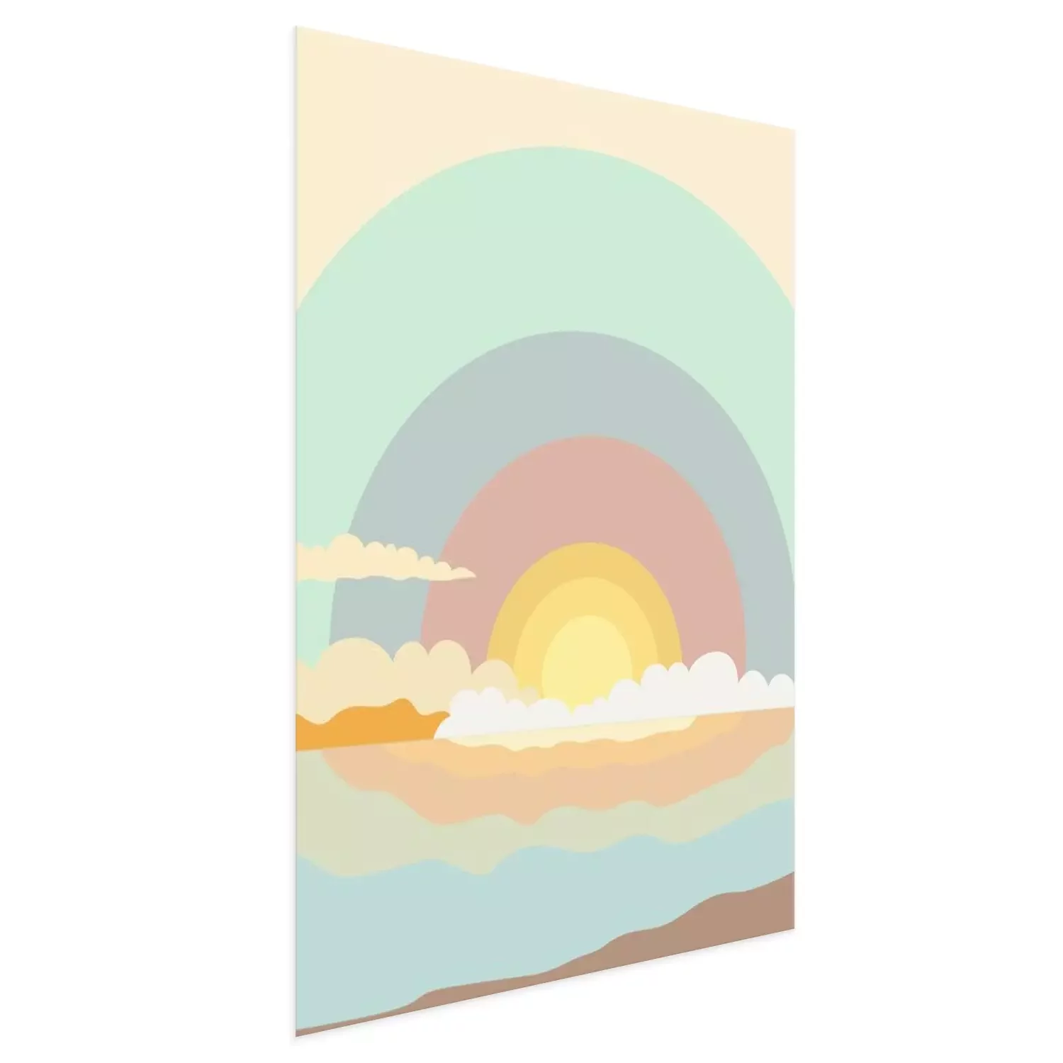 Poster: Illustratie van zonsopgang in het overzees in gevoelige pastelkleuren met wolken en kust voor affiche, decoratie, boekdekking, achtergrond