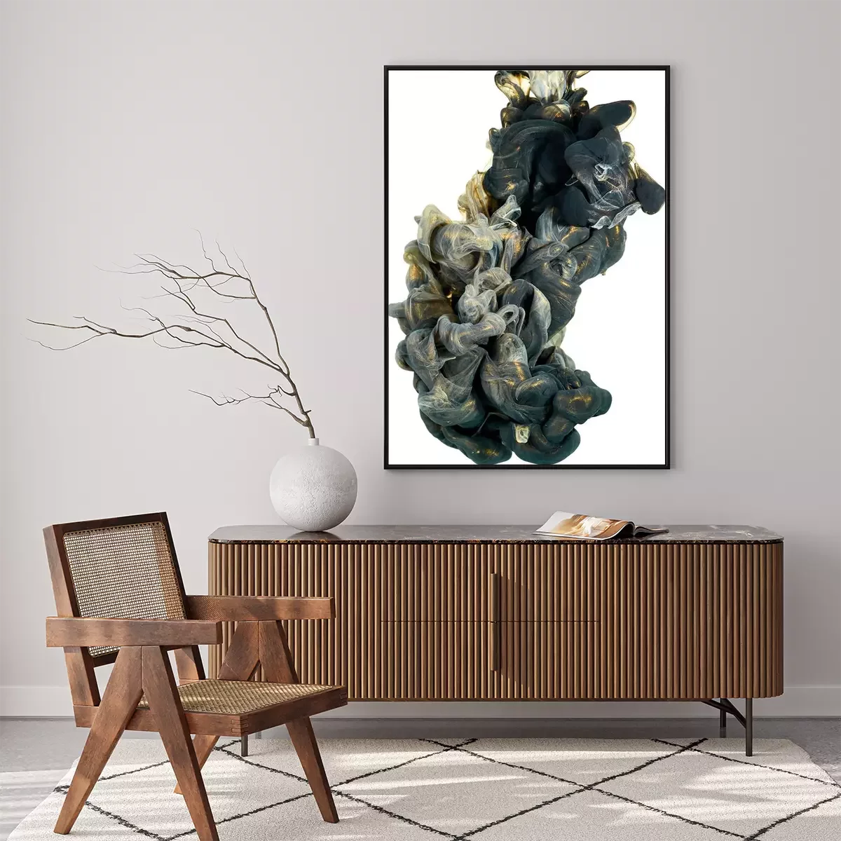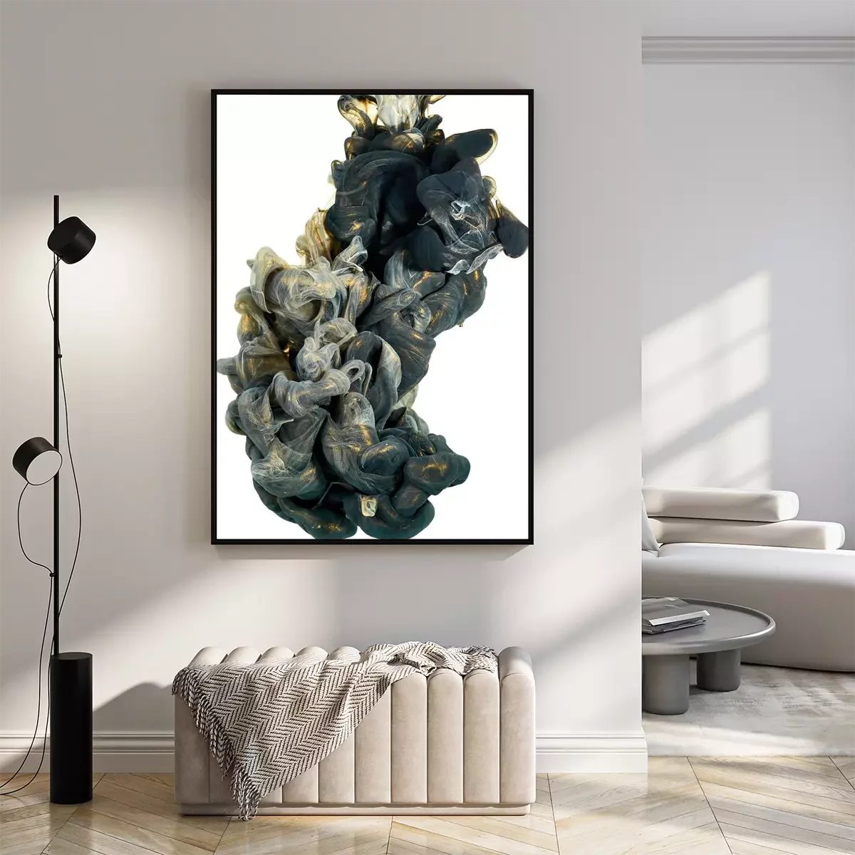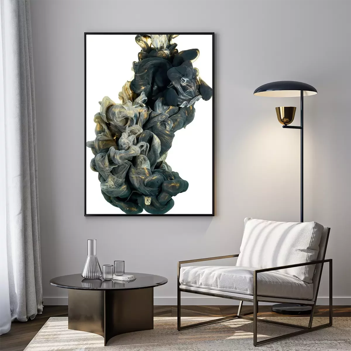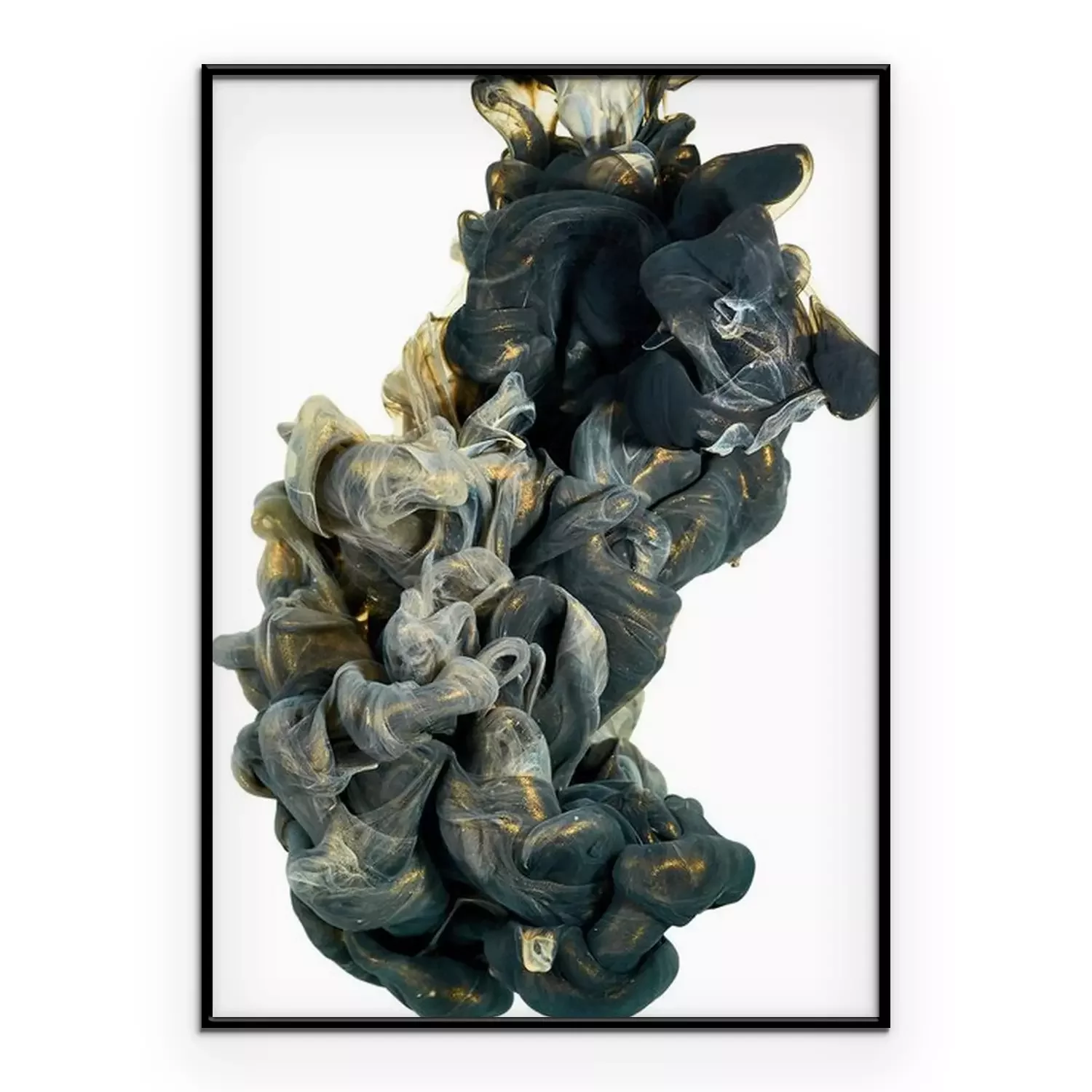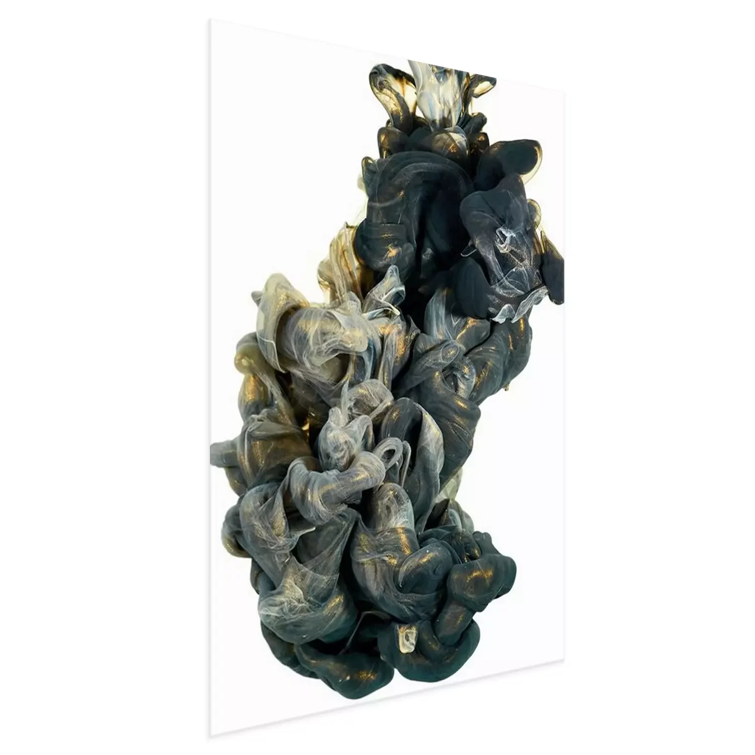 Poster: inkt in het water. Een scheut zwarte en gouden verf. Abstracte achtergrondkleur
