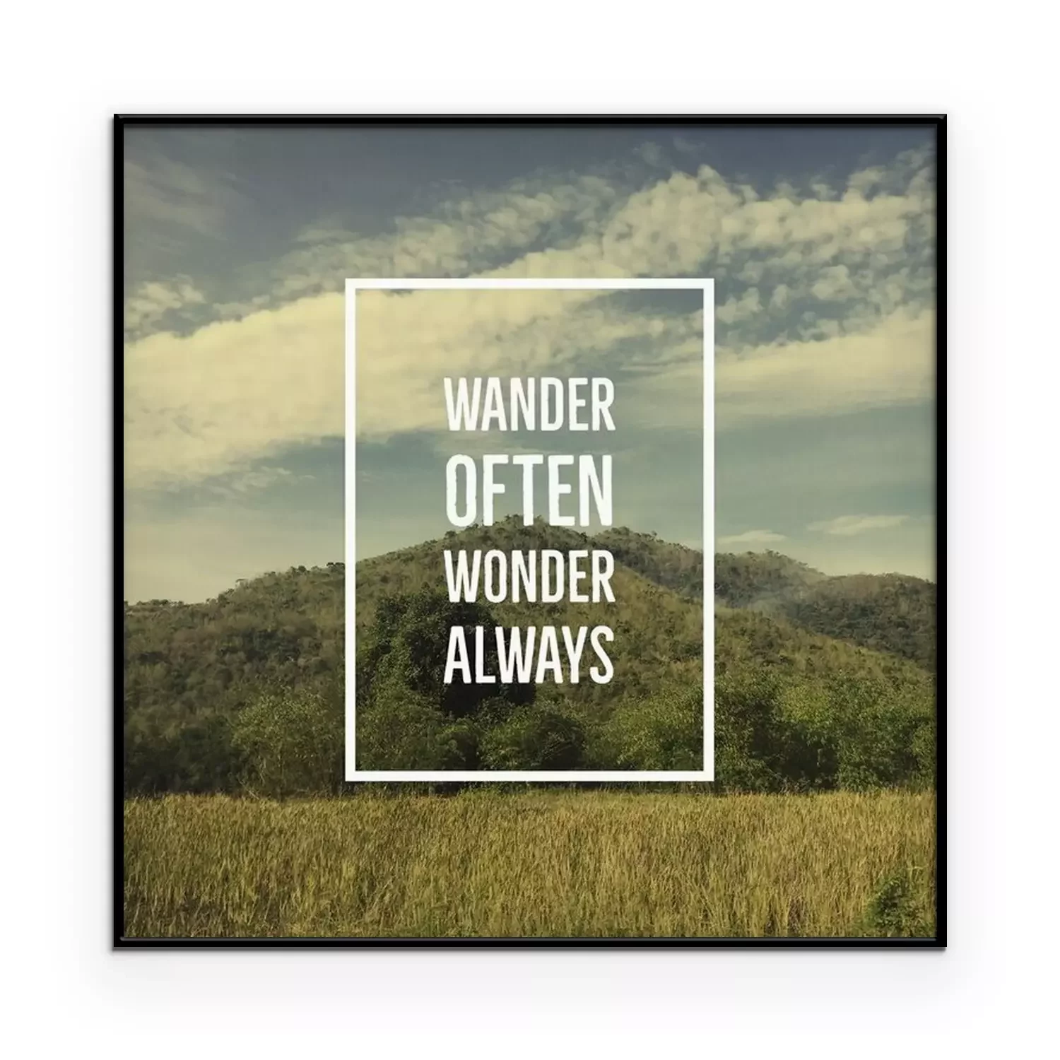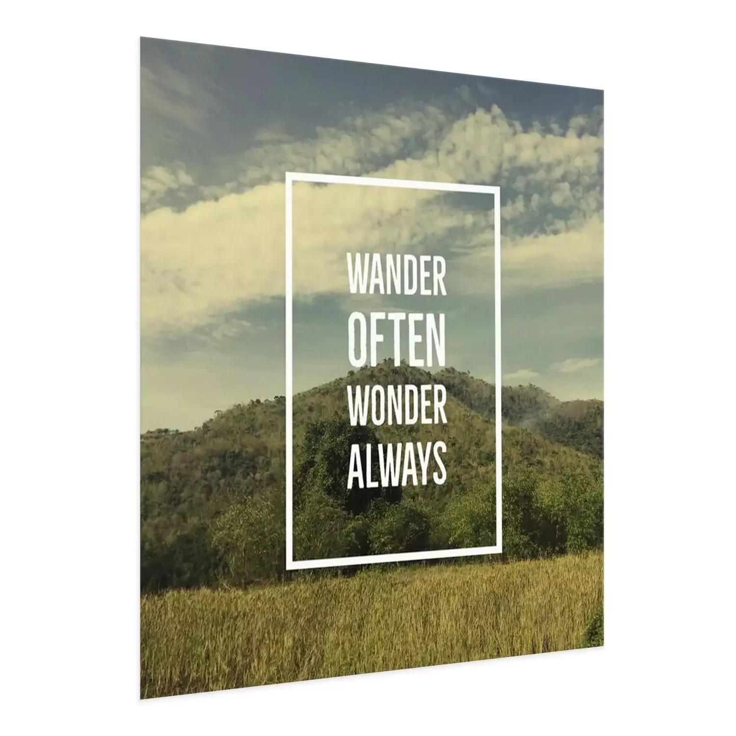 Poster Inspirerend motiverend citaat "vaak dwalen, vroeg altijd af" op bergachtergrond.