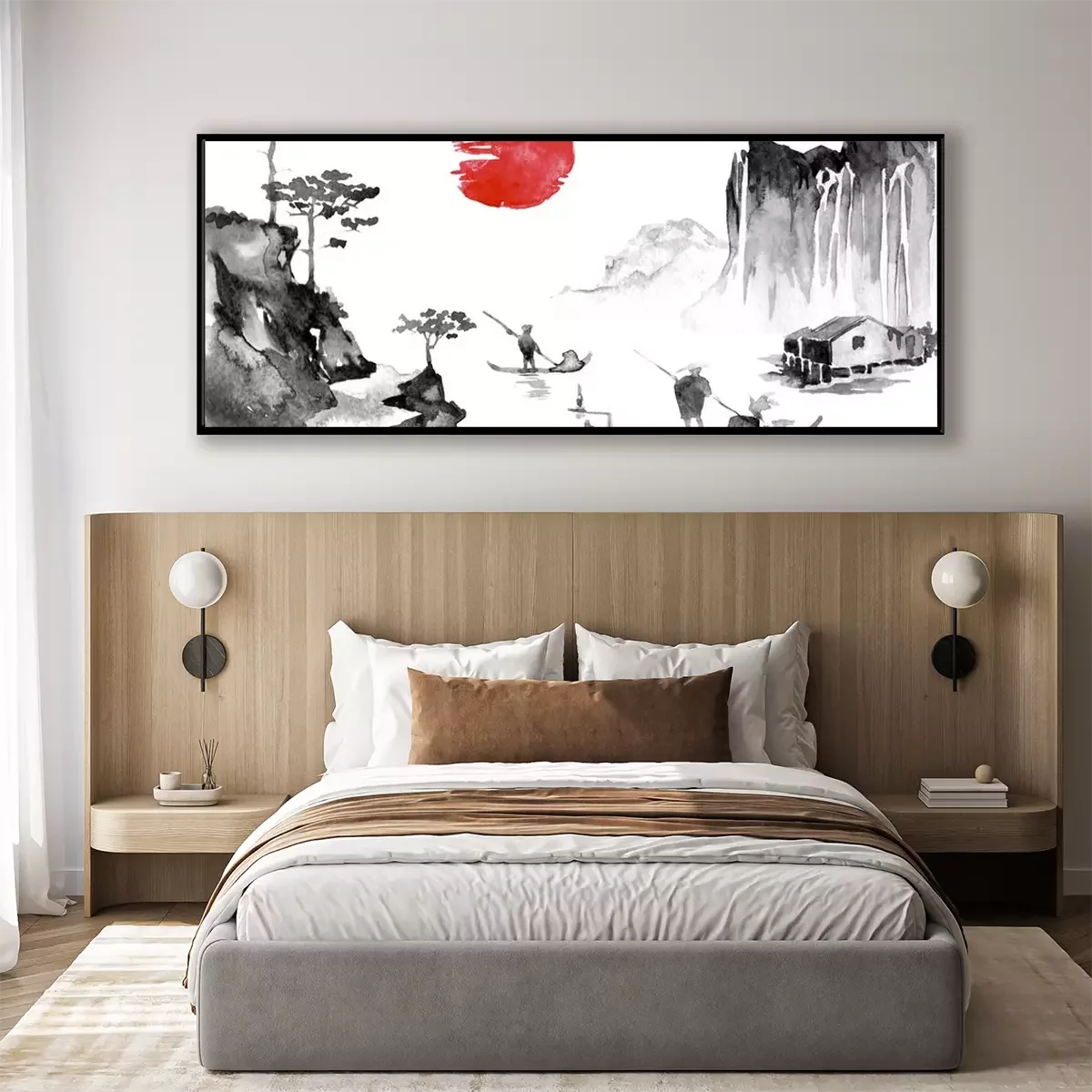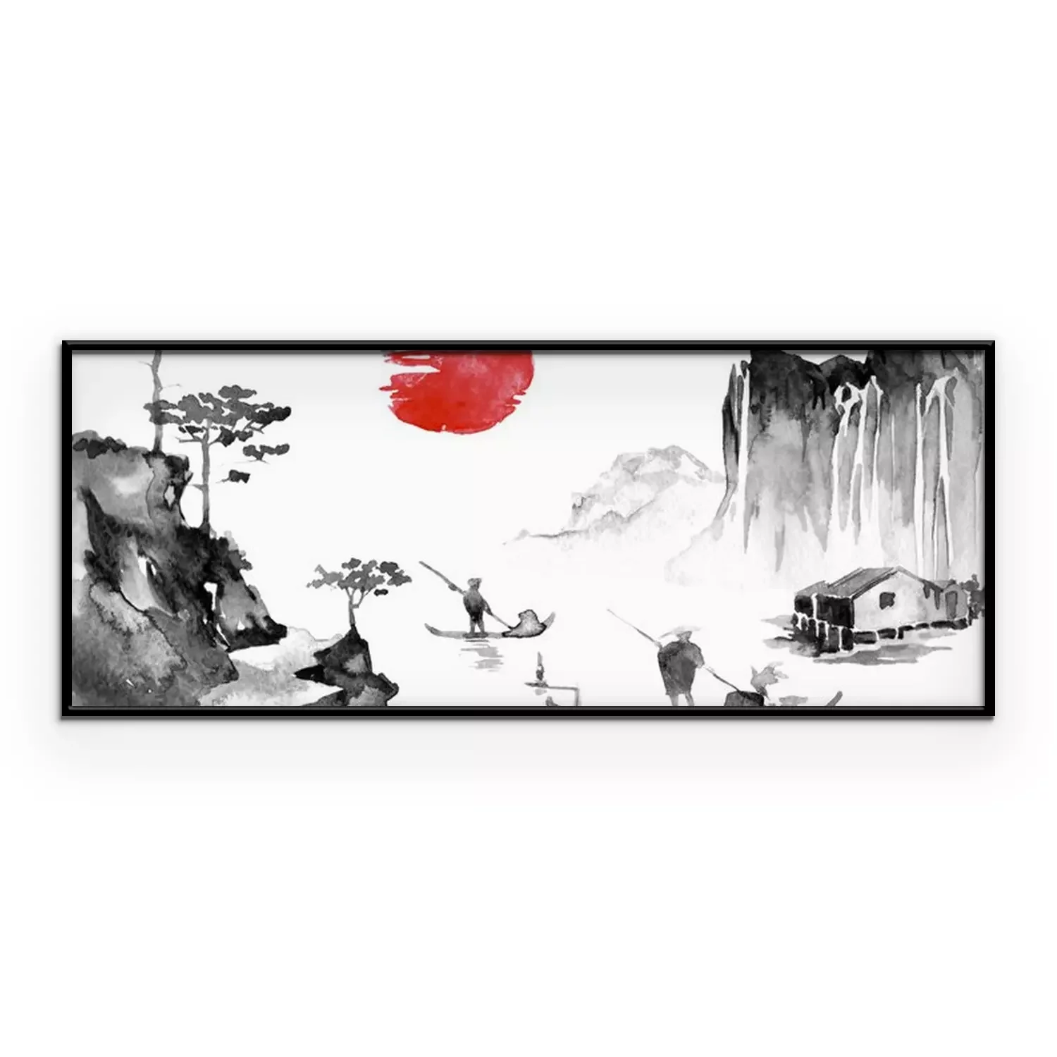 Poster: Japan traditional sumi-e painting. Indian ink illustration. Man and boat. Sunset, dusk. Japanese picture.