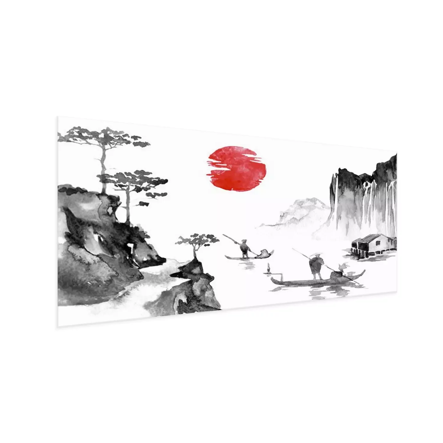 Poster Japan traditional sumi-e painting. Indian ink illustration. Man and boat. Sunset, dusk. Japanese picture.