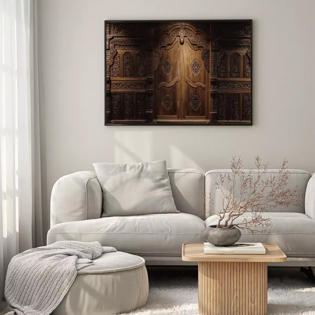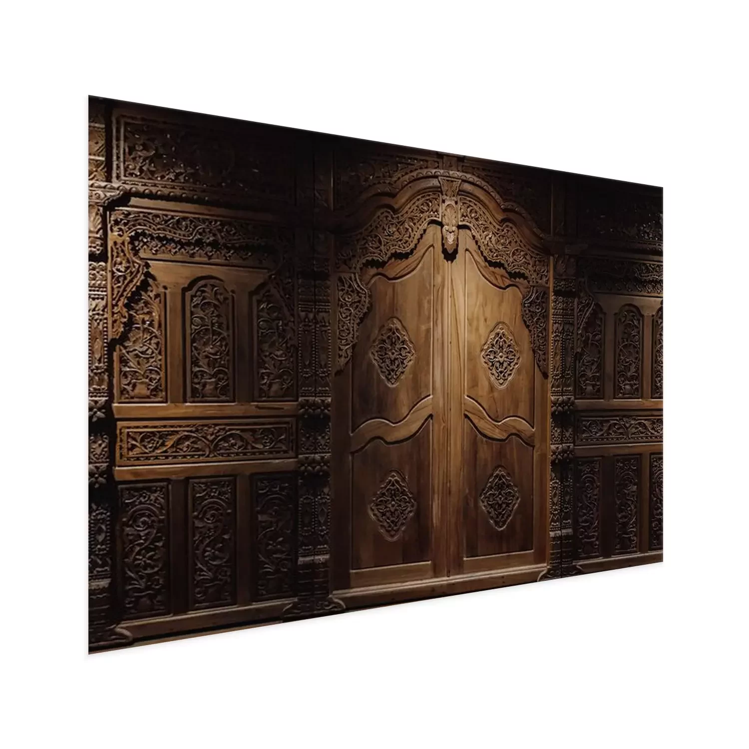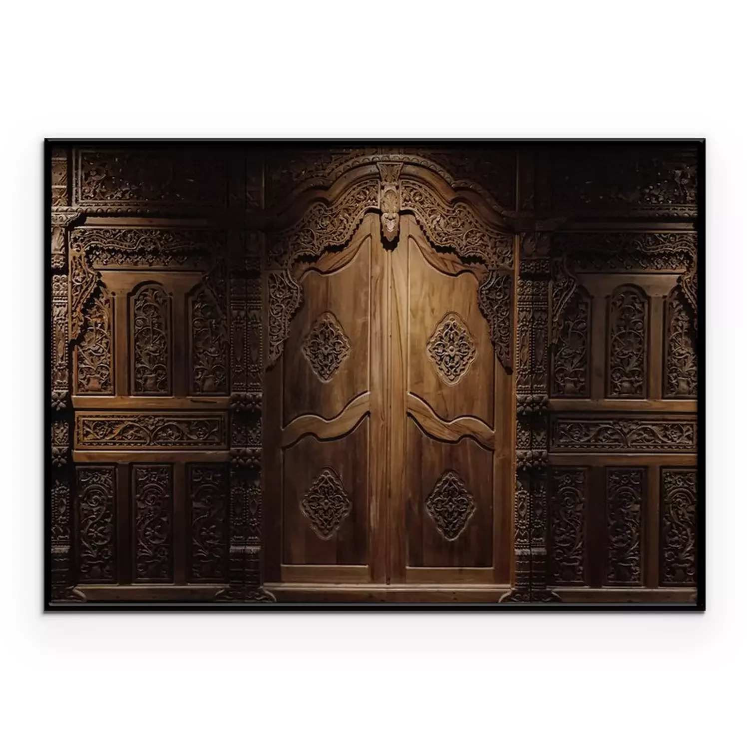 Poster: Javanesse door with javanesse batik and flower Pattern is carved on wood background