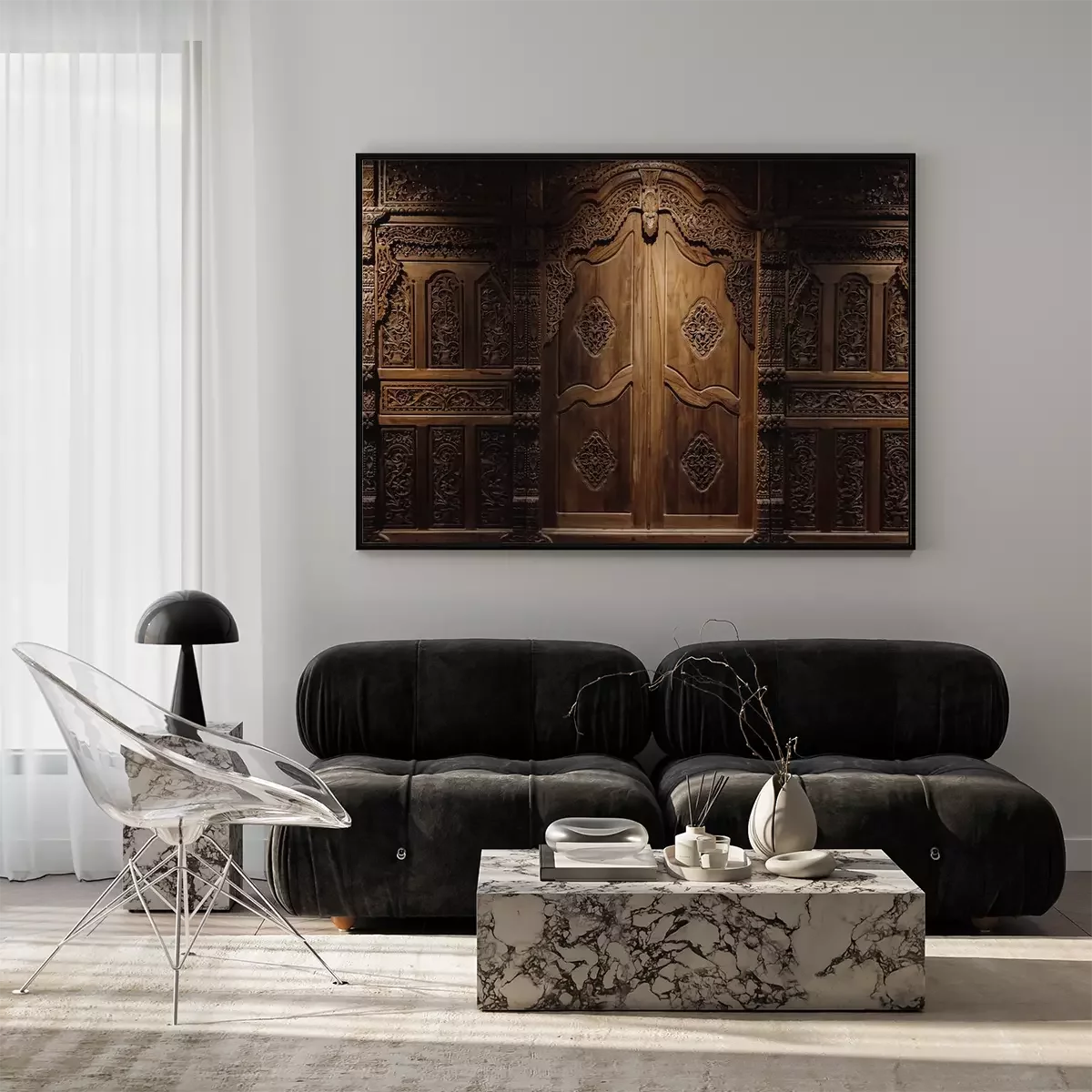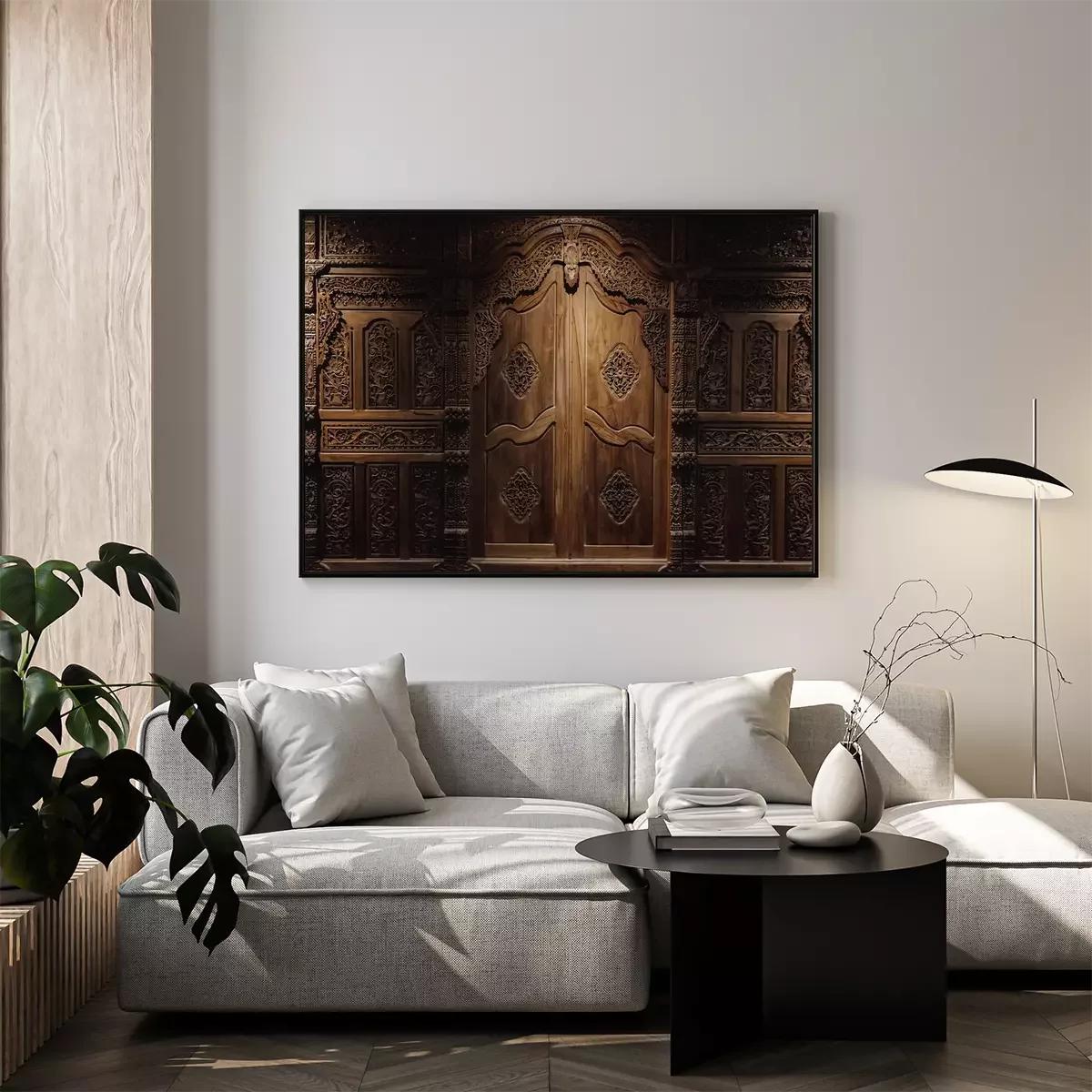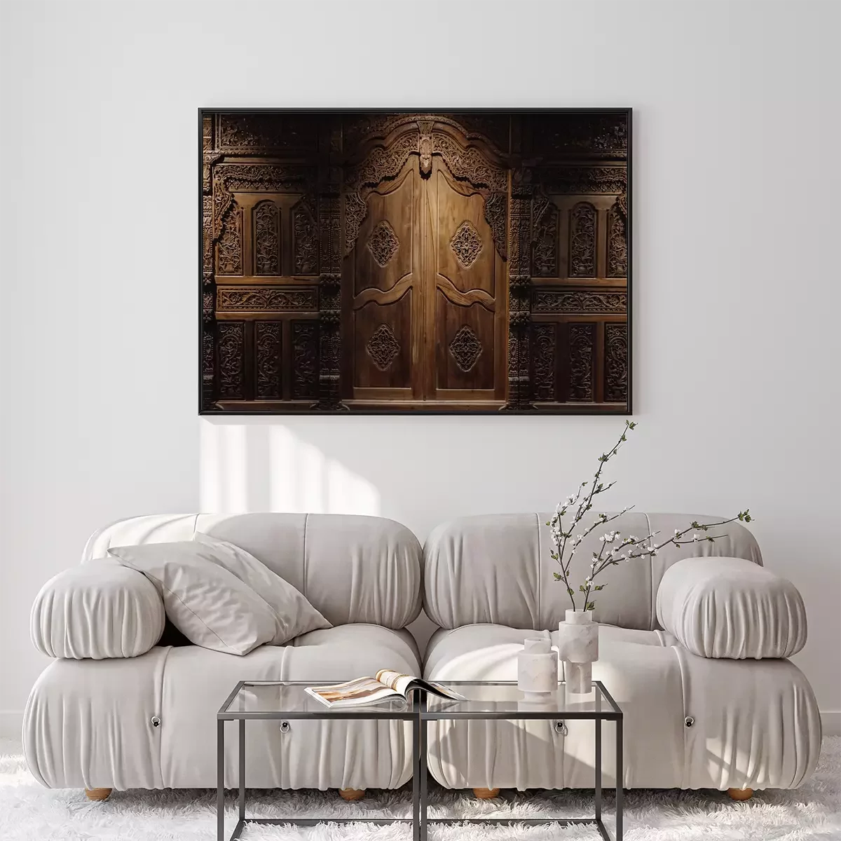 Poster: Javanesse door with javanesse batik and flower Pattern is carved on wood background