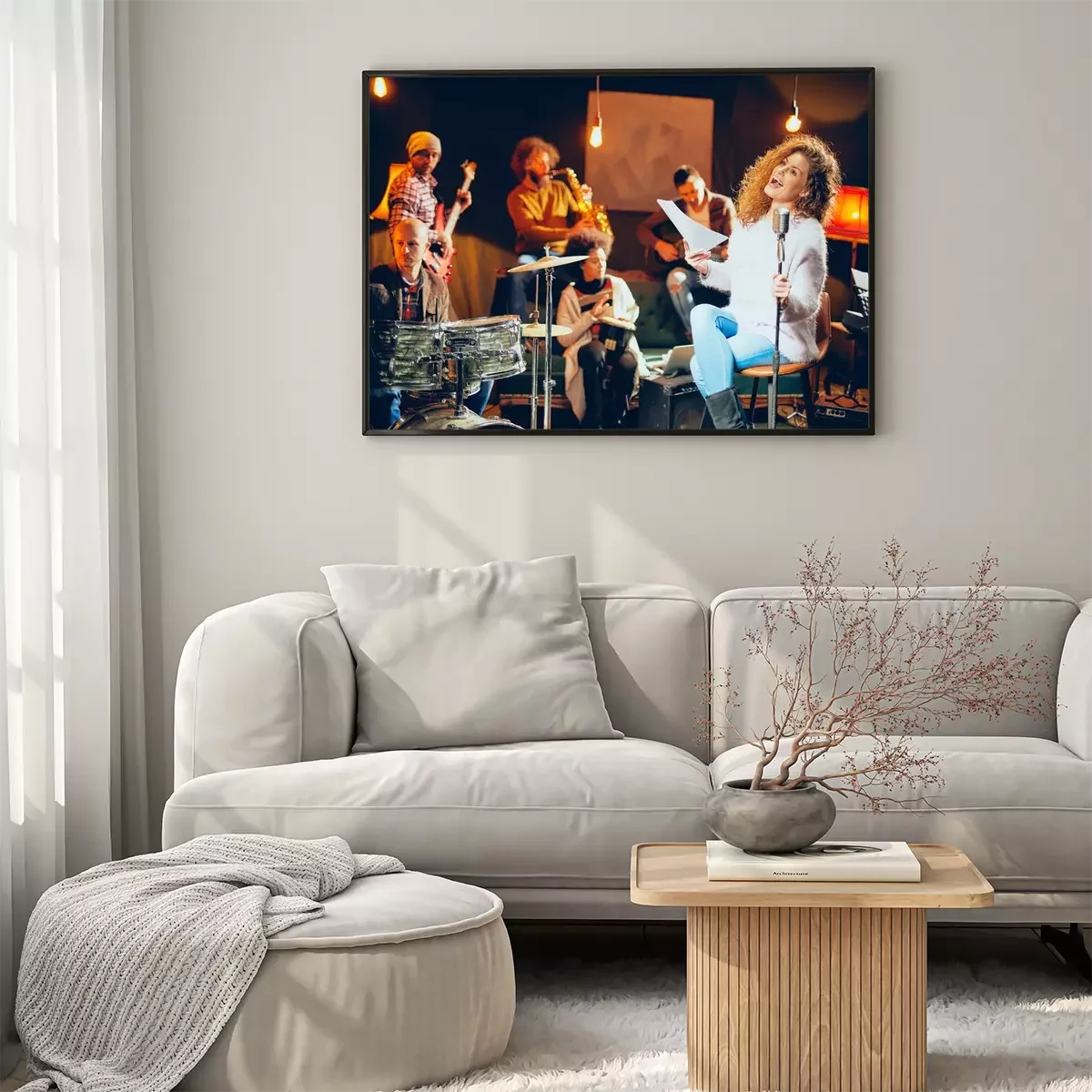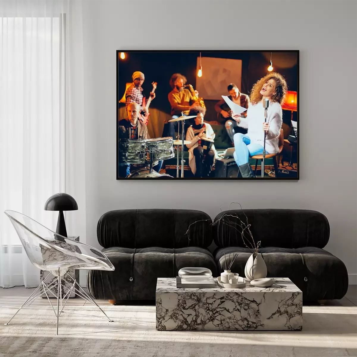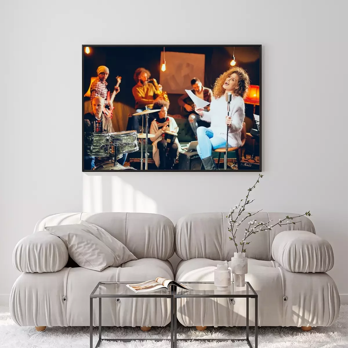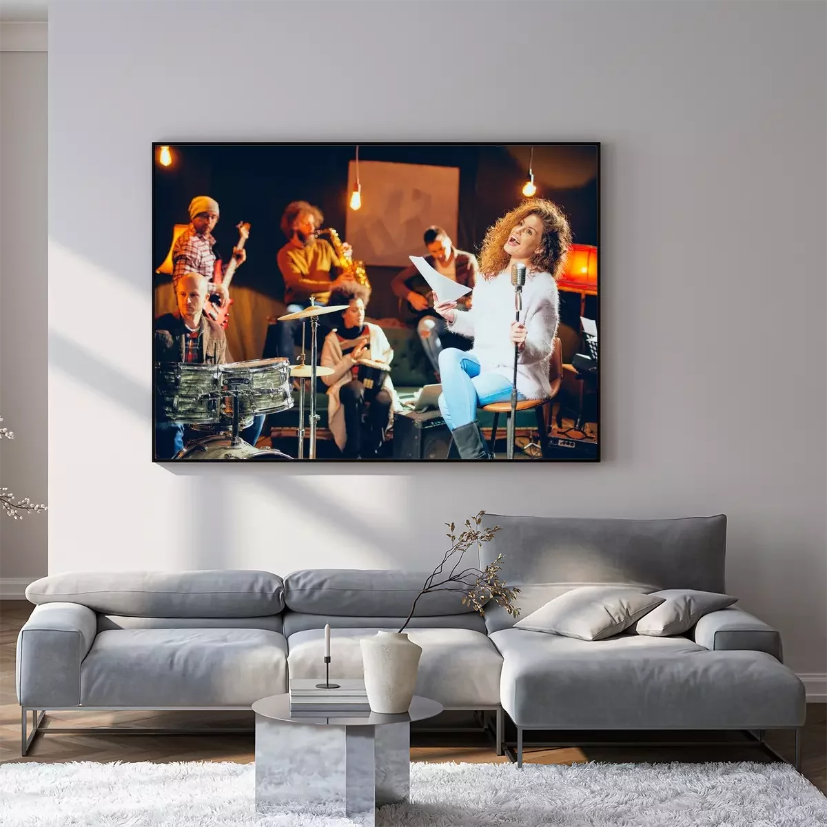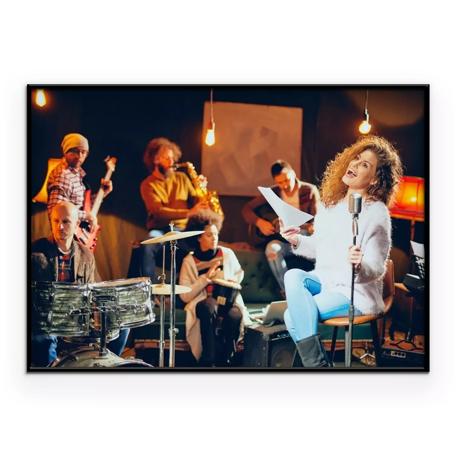 Poster Jazz band preparing for the gig. In foreground woman singing while the rest of the band playing bass guitar, clavier and acoustic guitar. Home music studio interior.