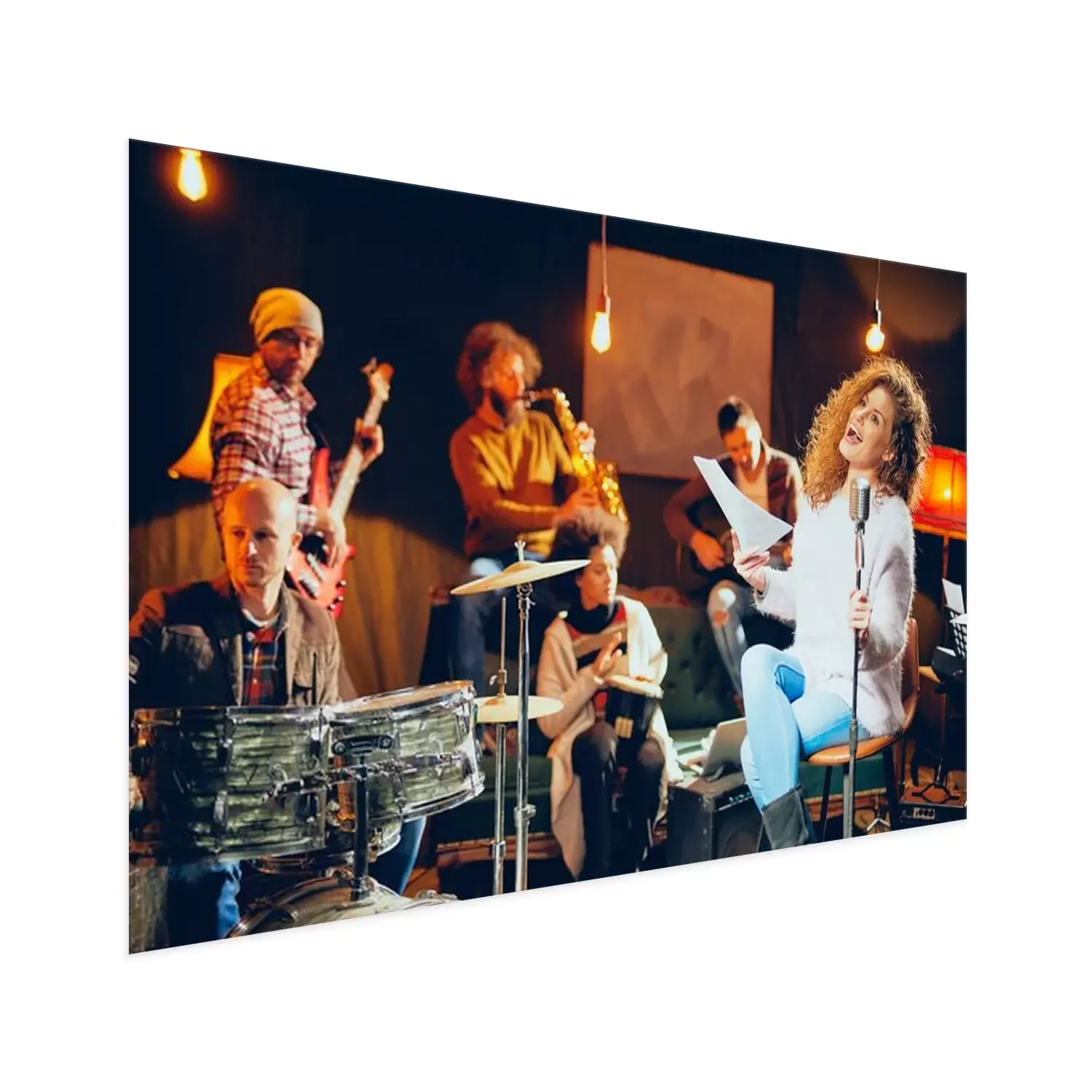 Poster: Jazz band preparing for the gig. In foreground woman singing while the rest of the band playing bass guitar, clavier and acoustic guitar. Home music studio interior.