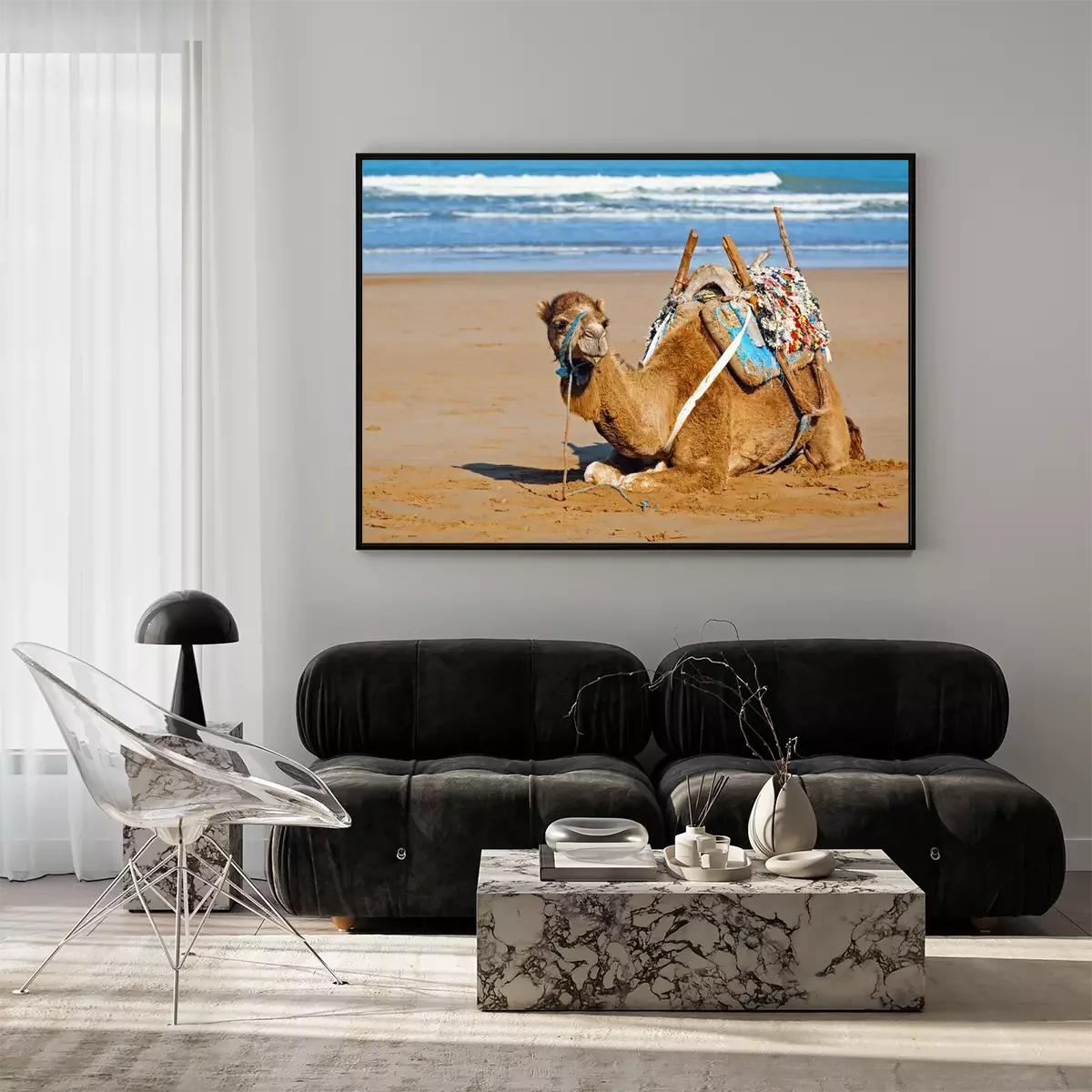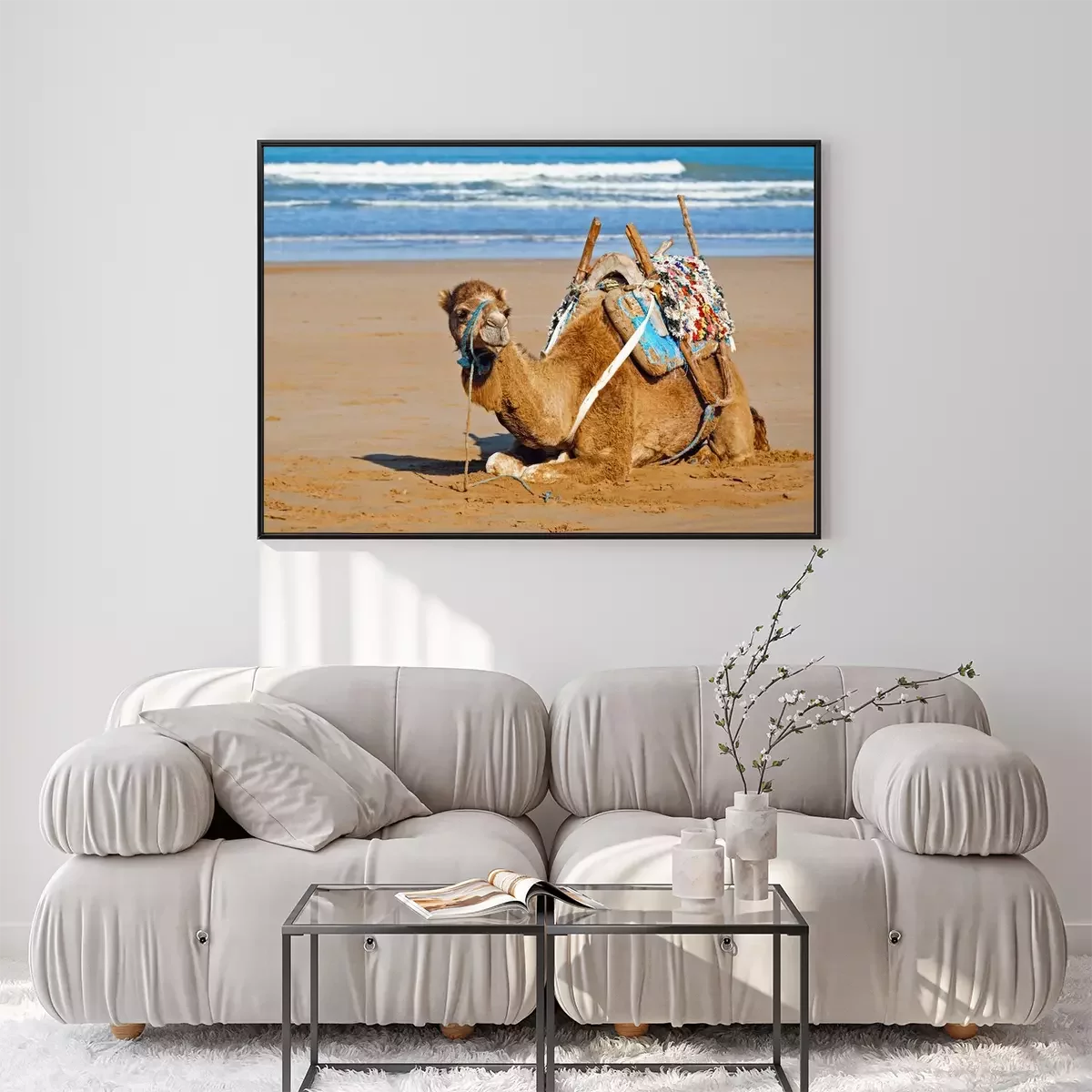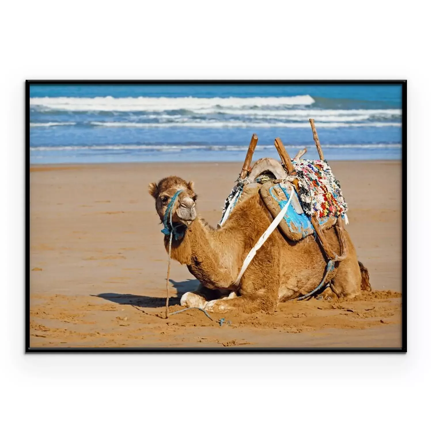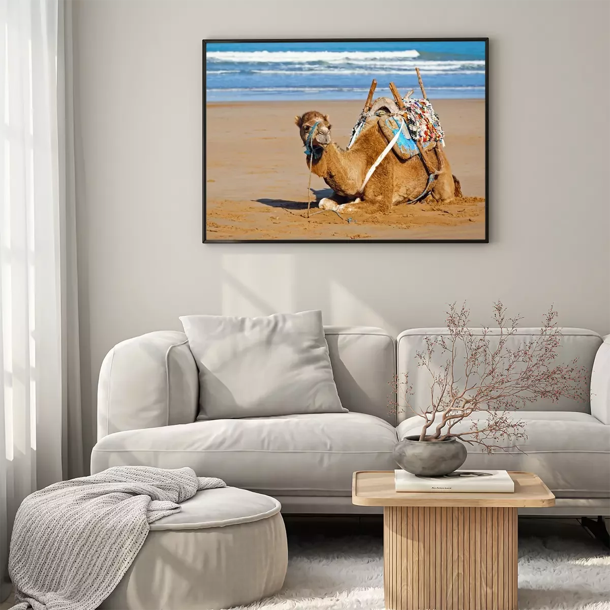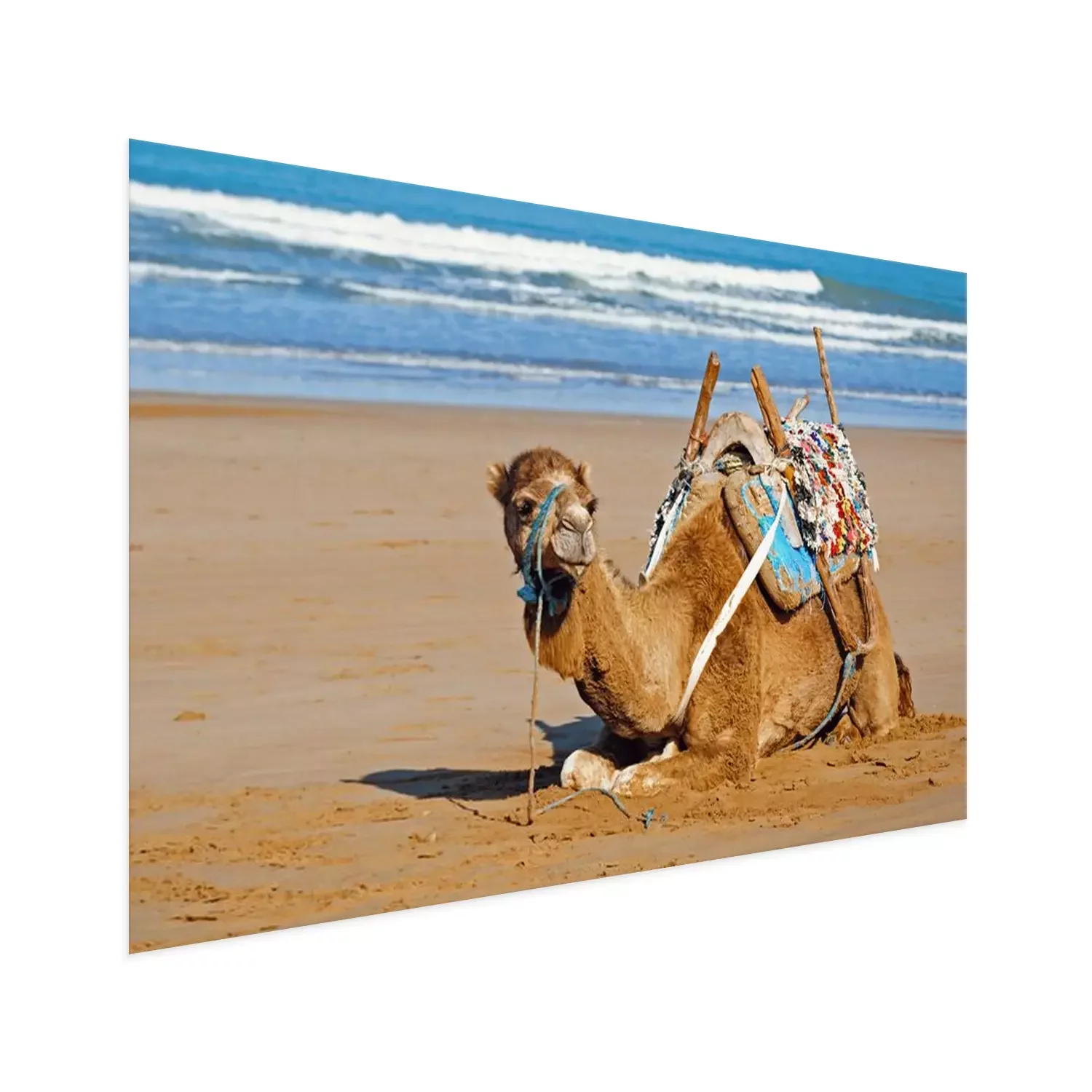 Poster: Jonge dromedaris in het zadel liggend op het zand, Marokko