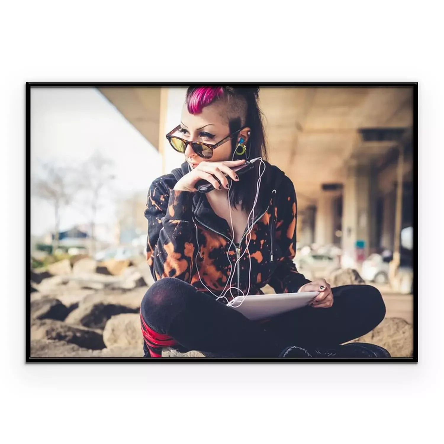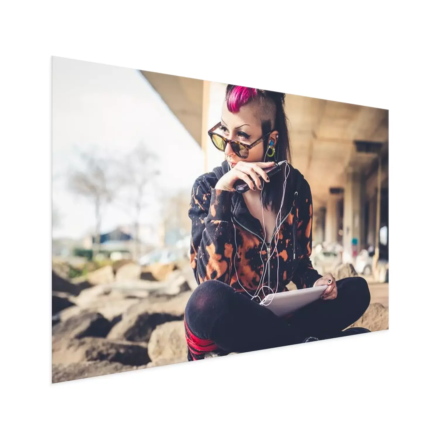 Poster: jonge mooie punk donkere meisje met behulp van tablet