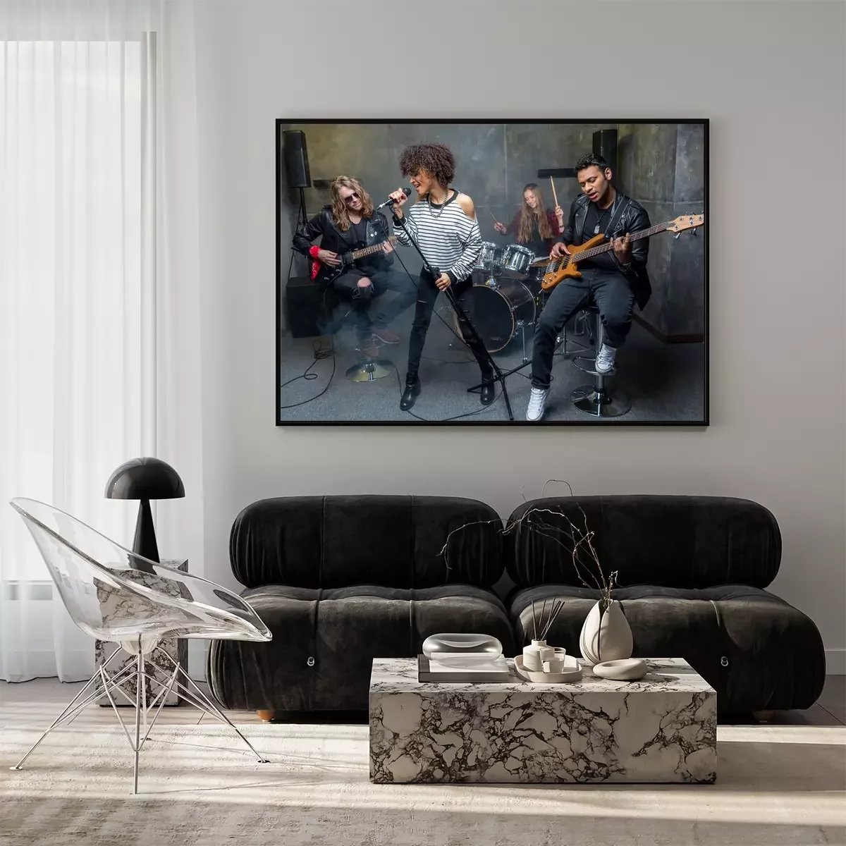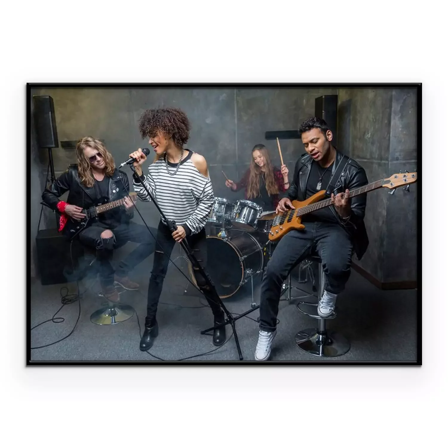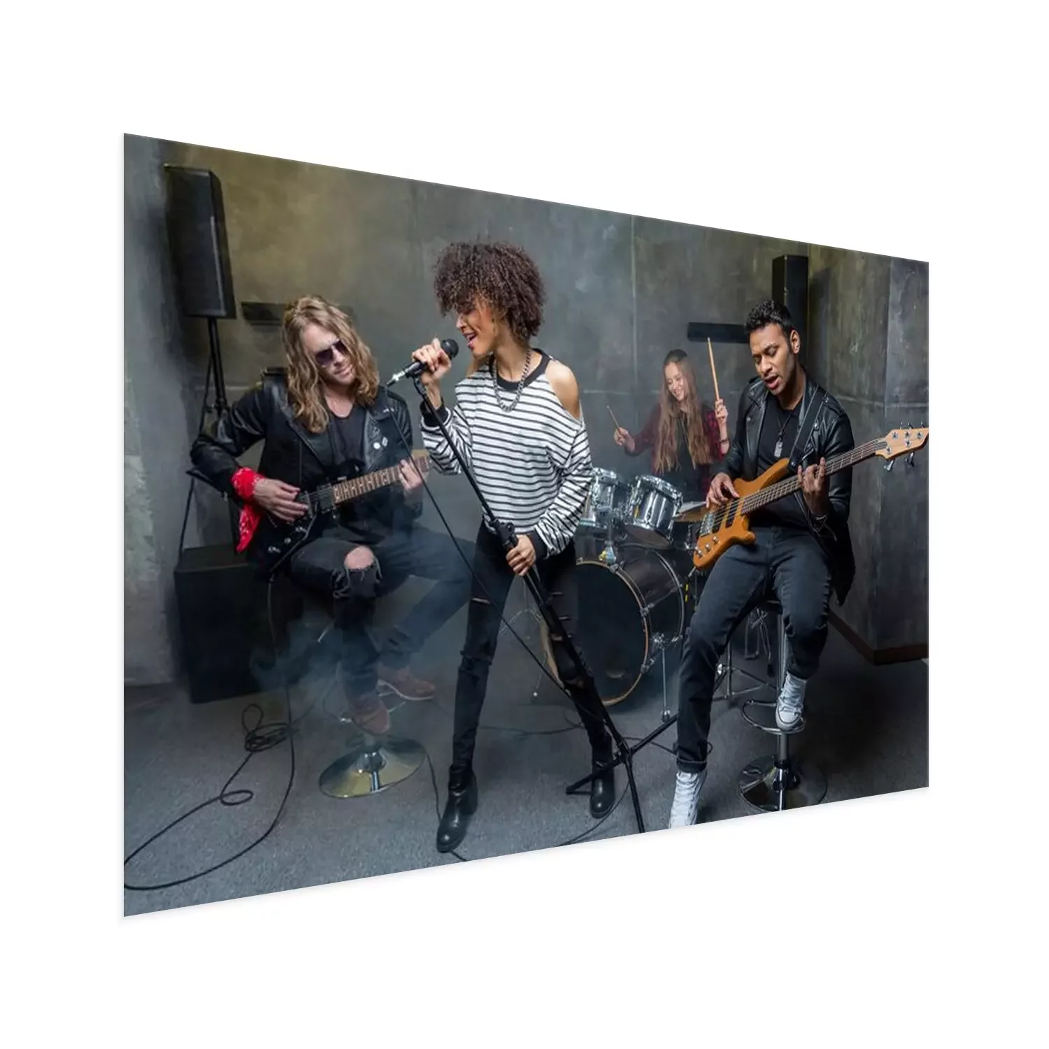 Poster Jonge rock band repetitie in muzikale studio, band op het podiumconcept
