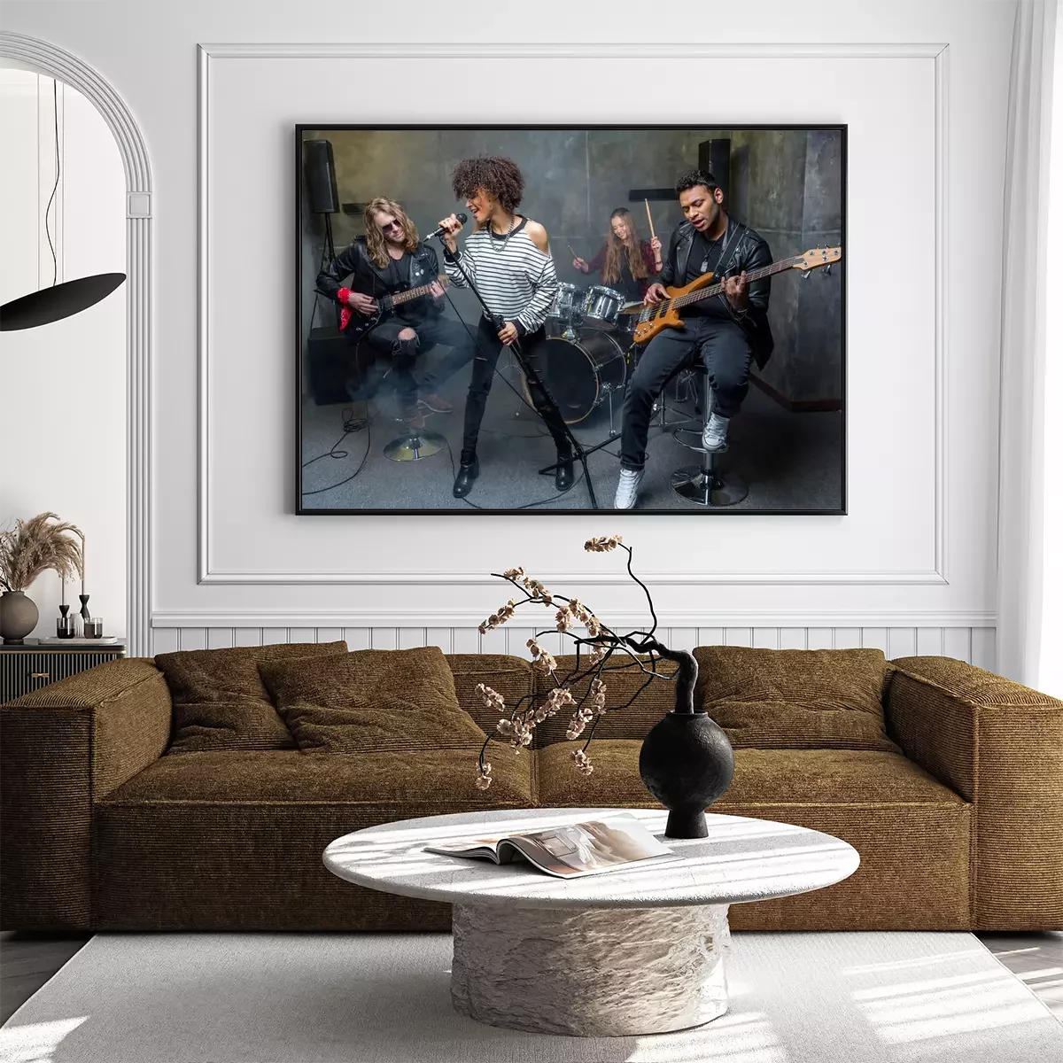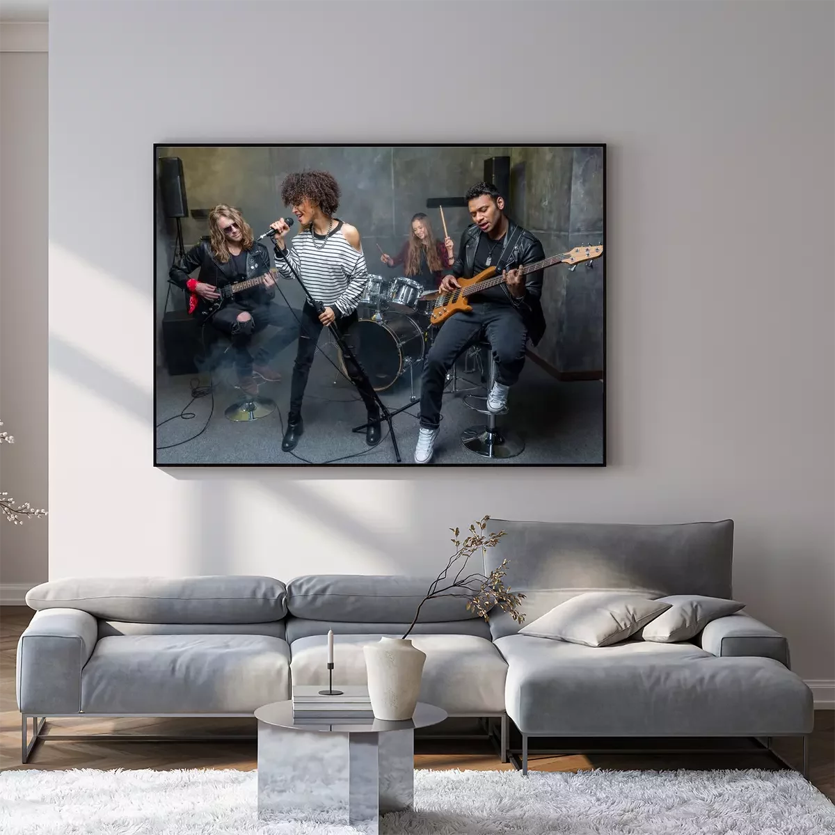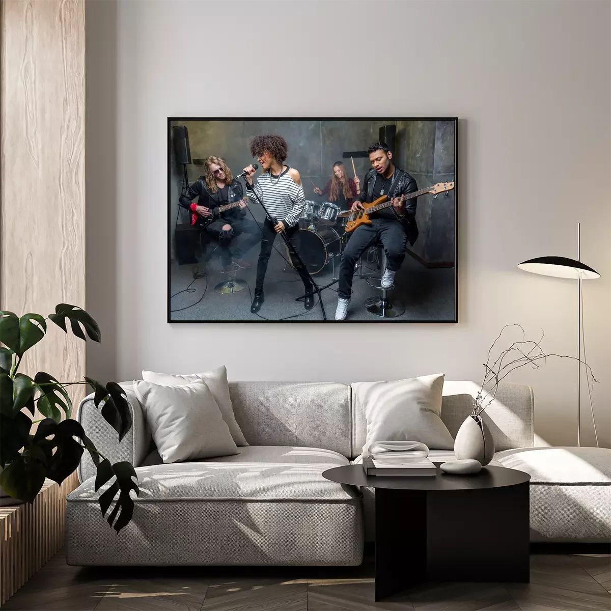 Poster Jonge rock band repetitie in muzikale studio, band op het podiumconcept