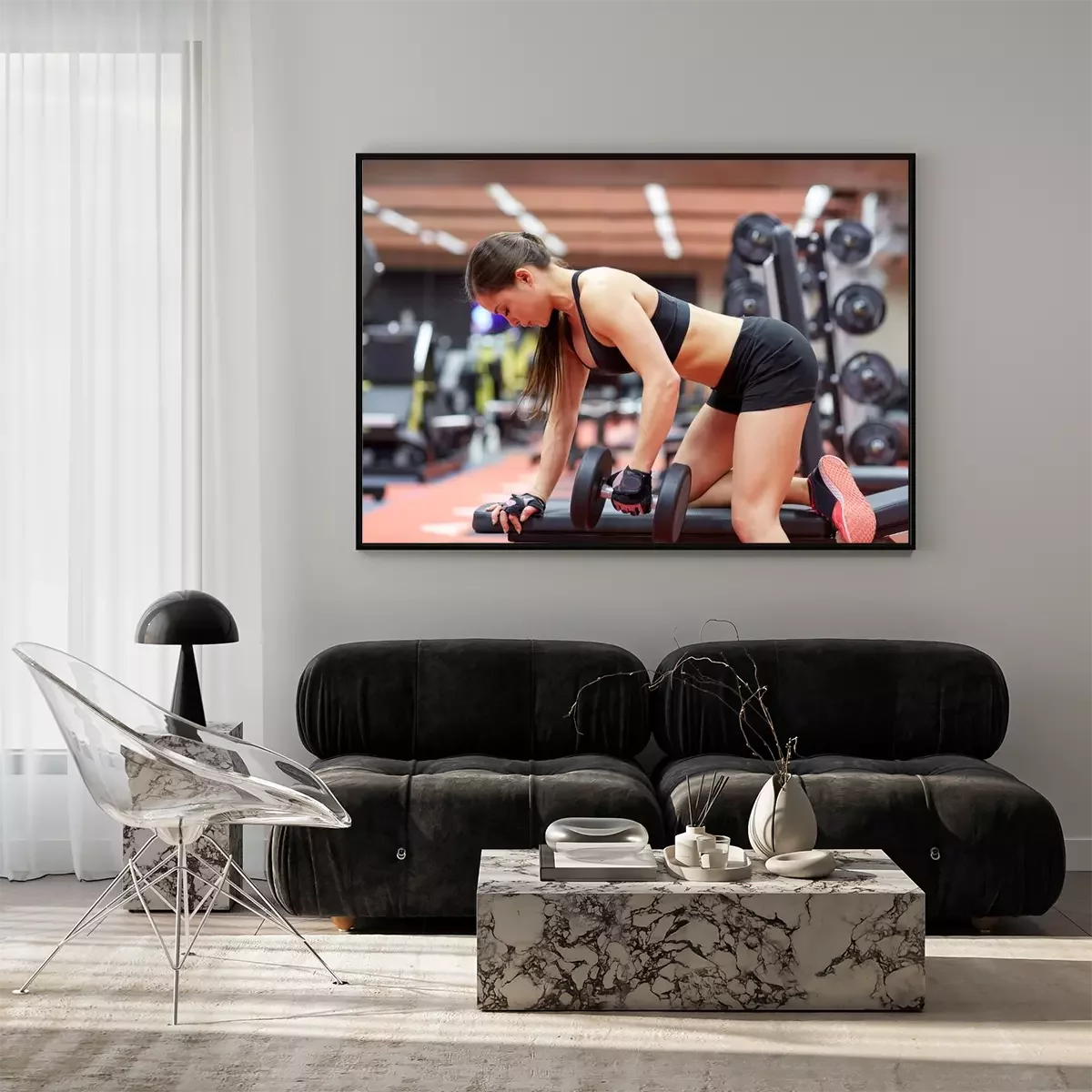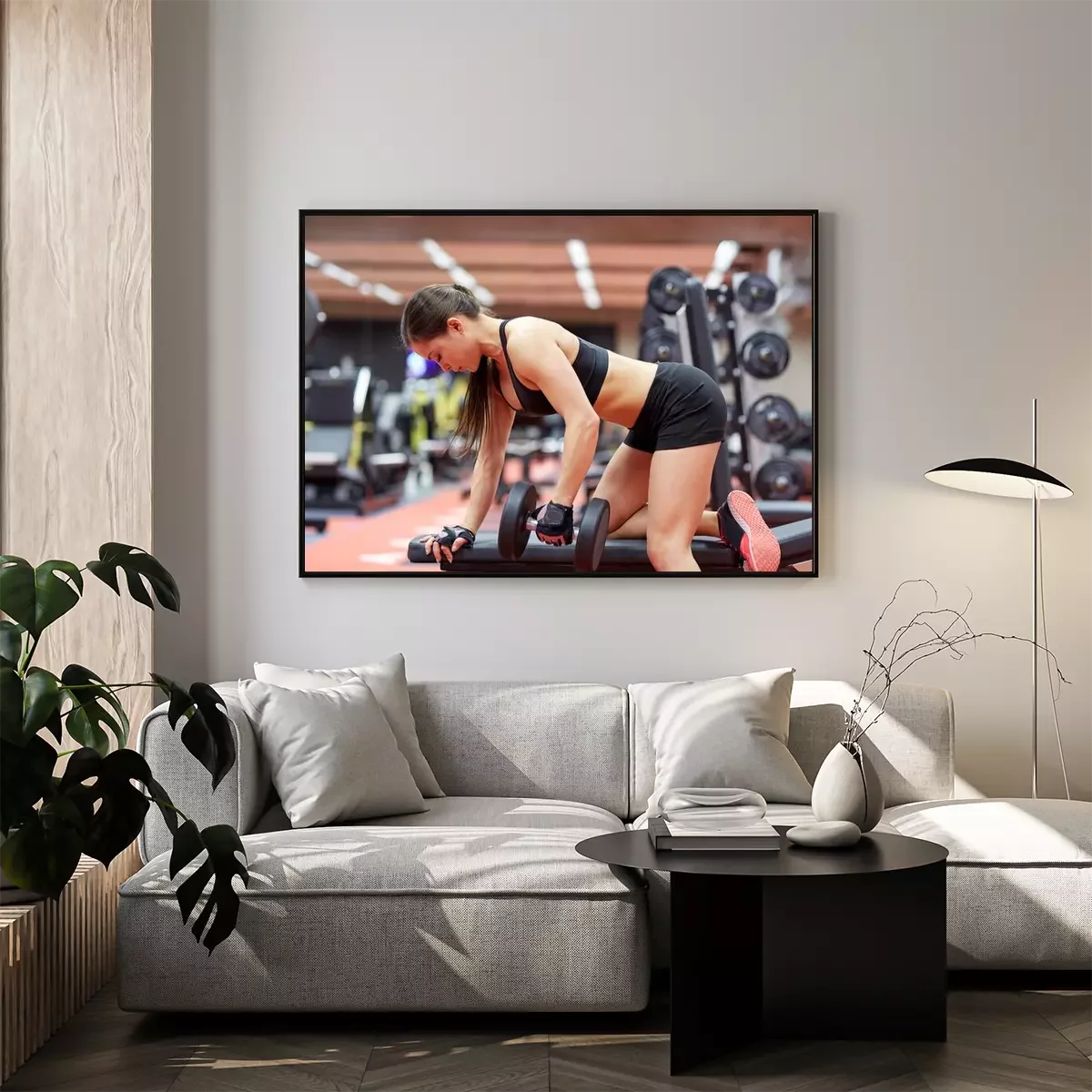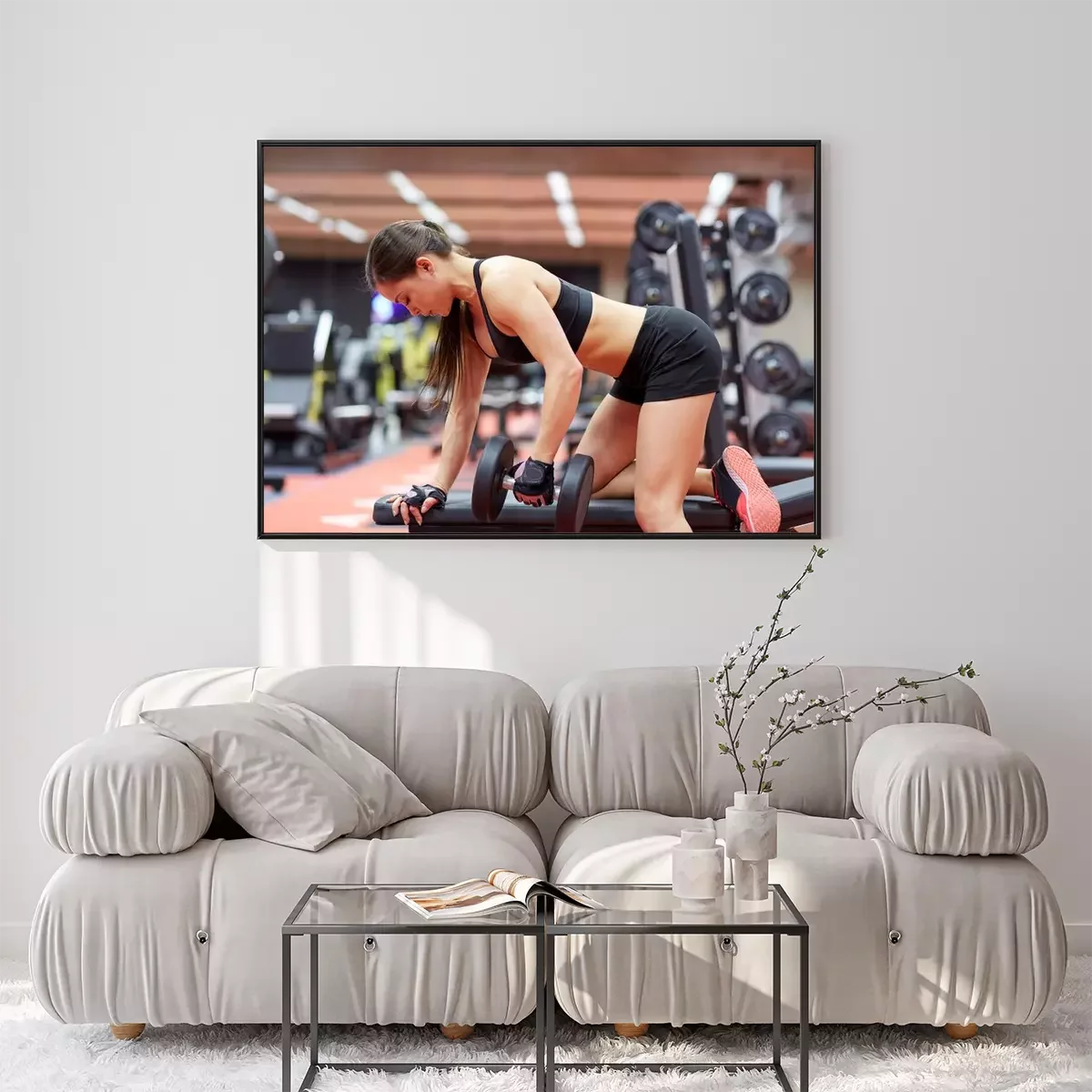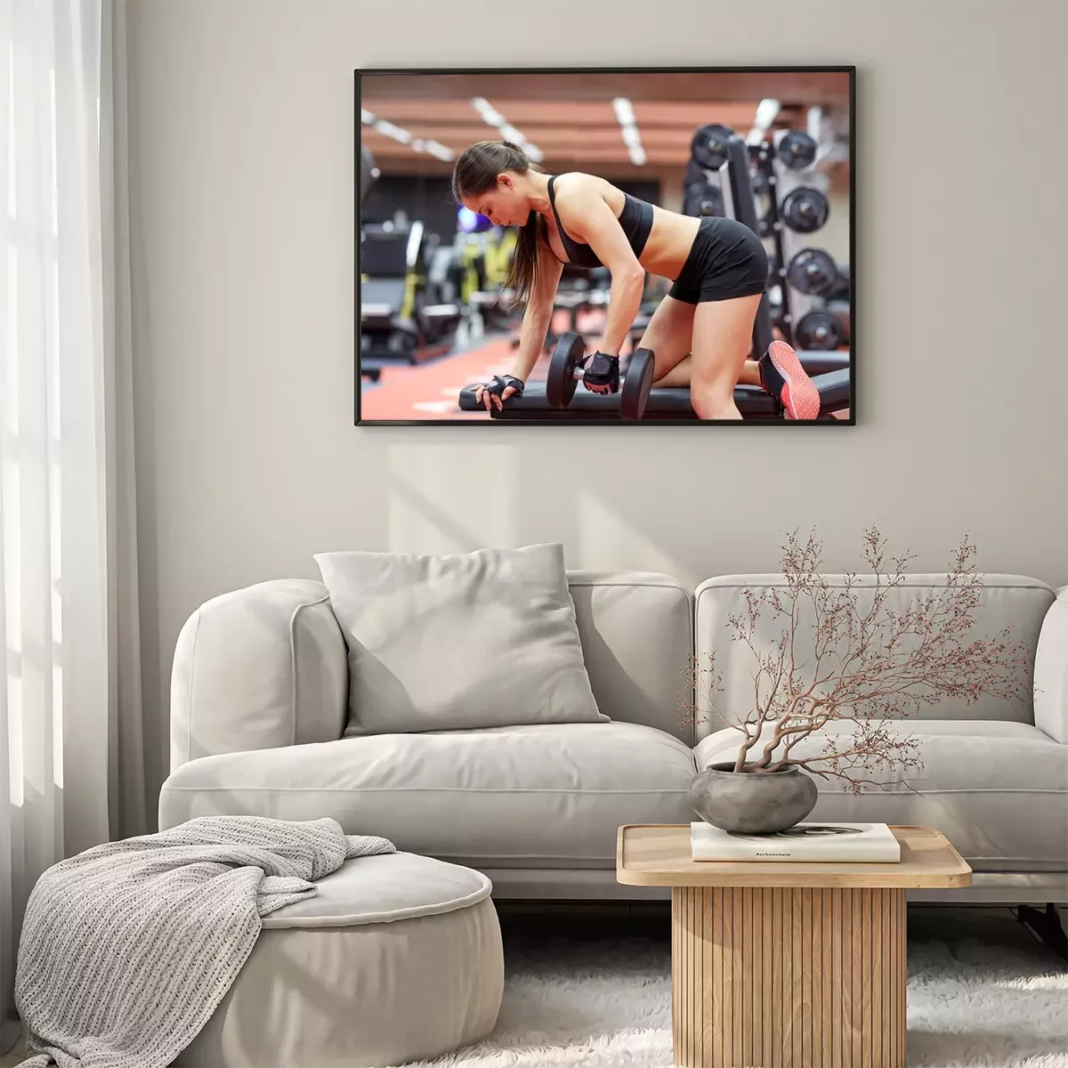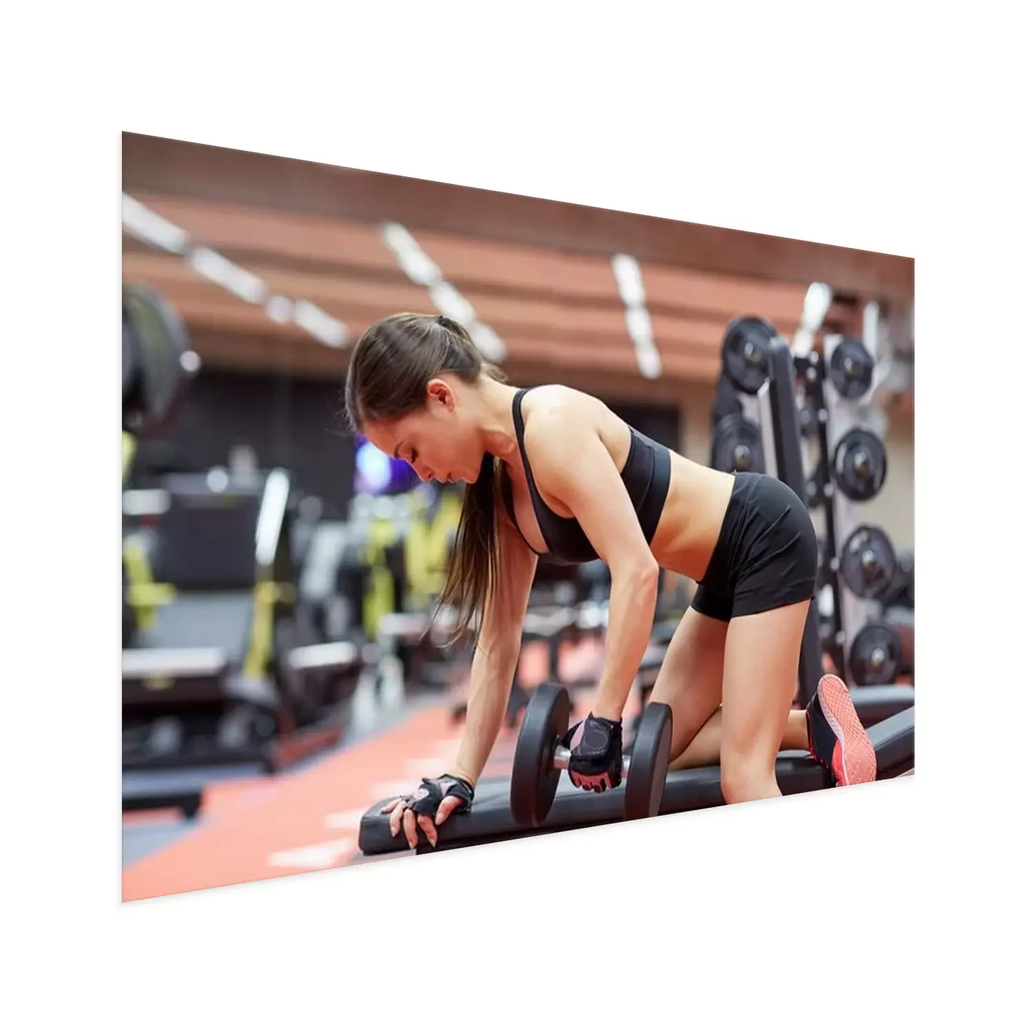Poster: jonge vrouw buigen spieren met een halter in de sportschool